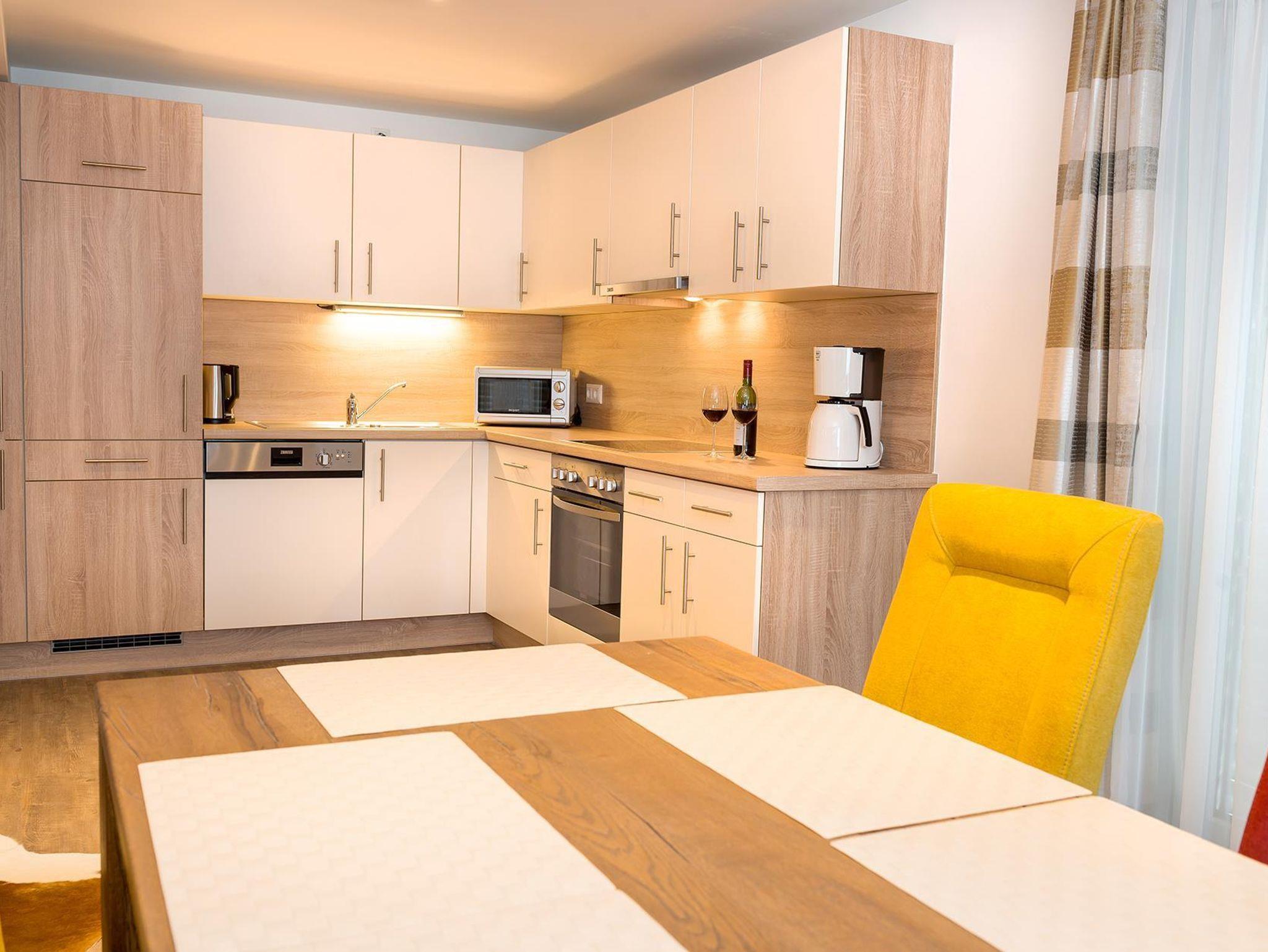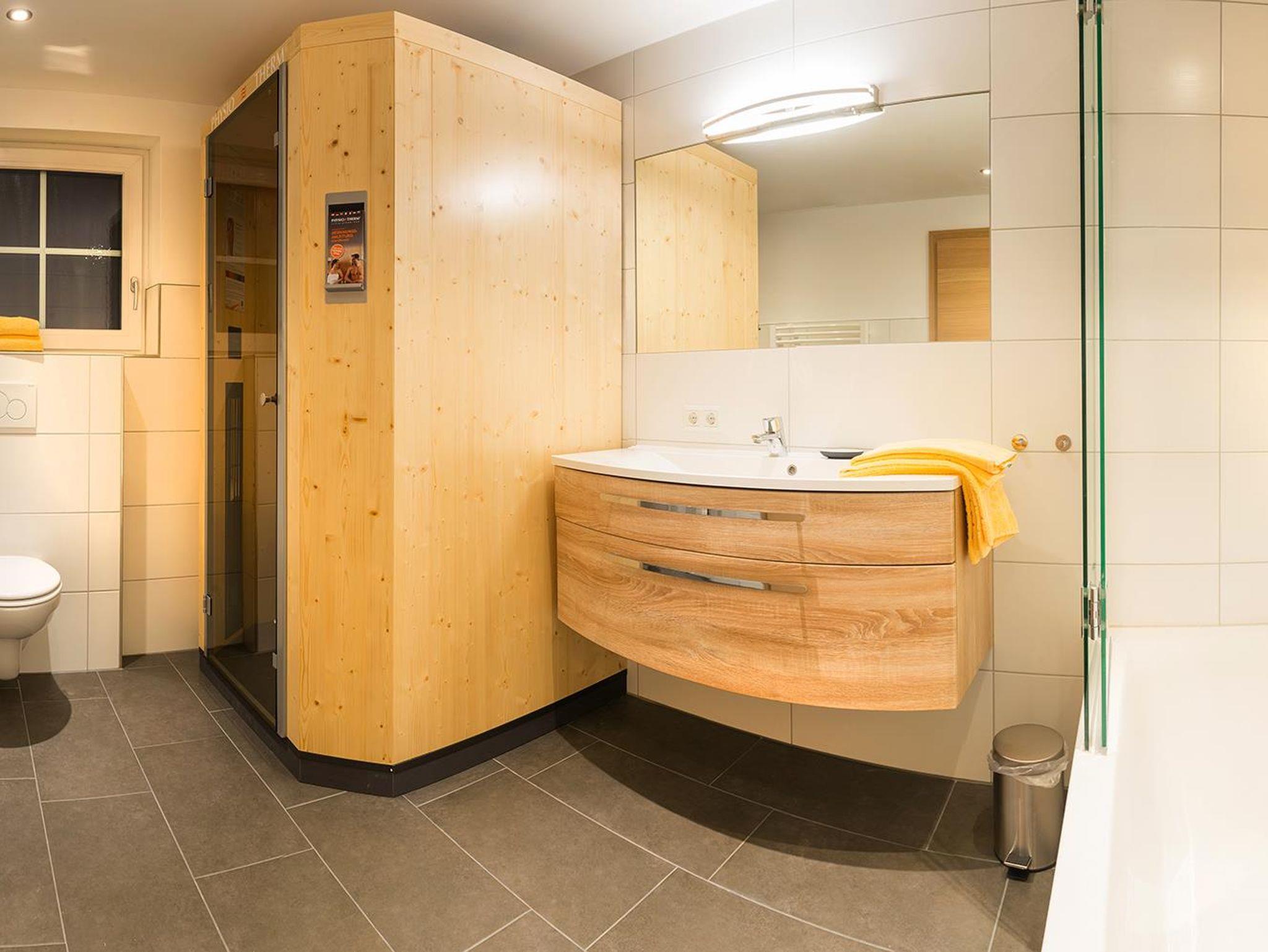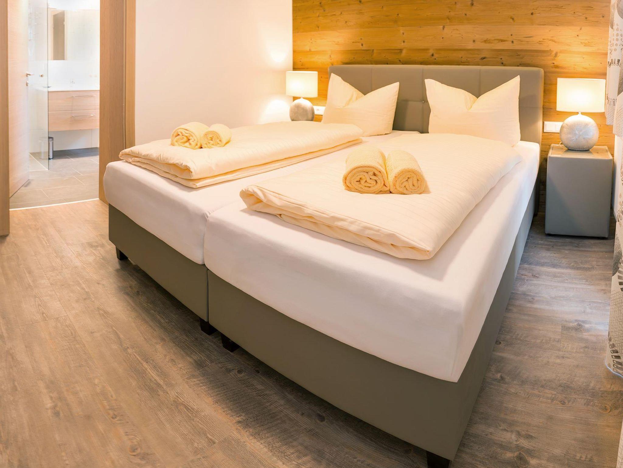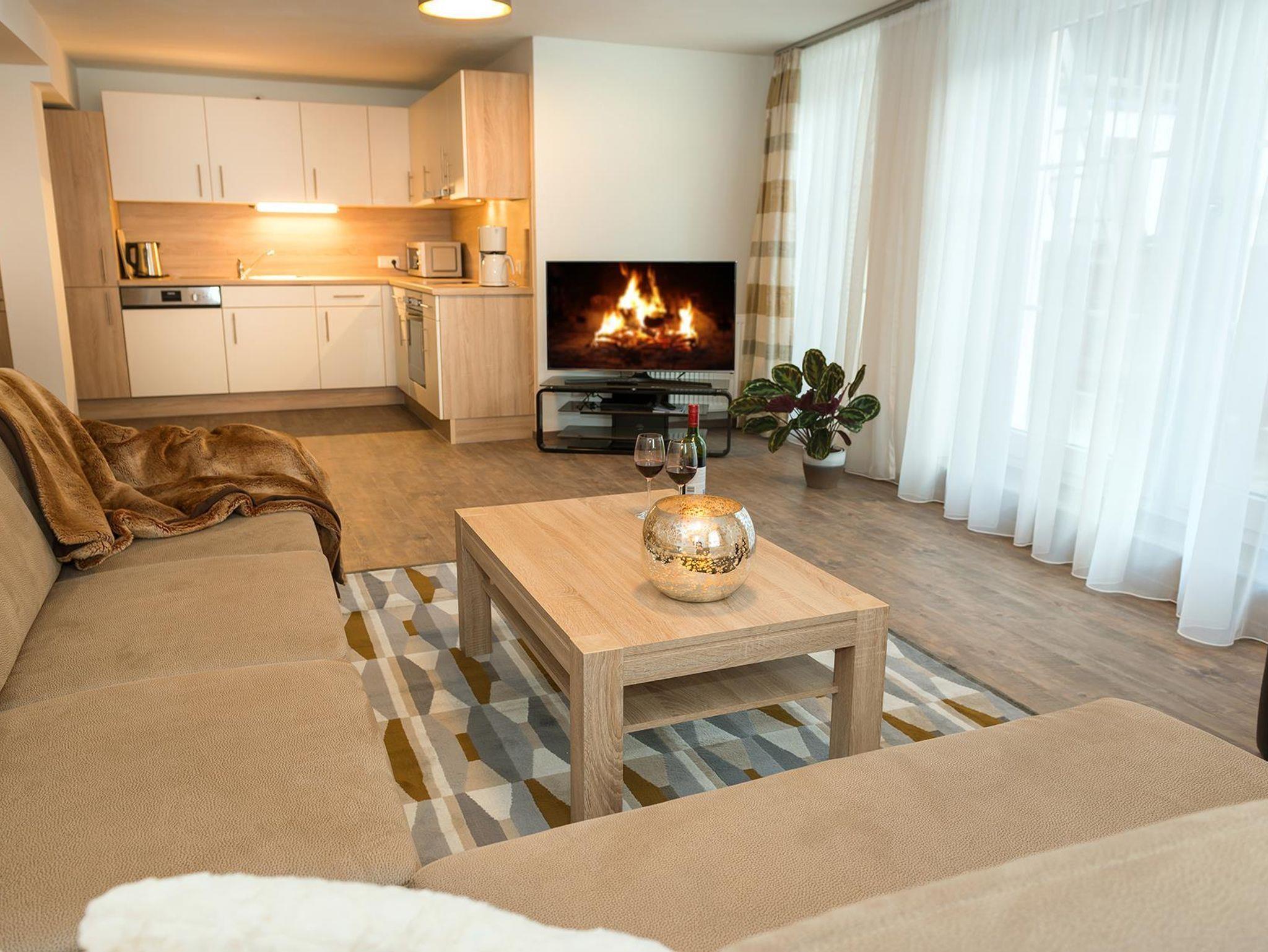 100m² Apartment mit jeweils 3 Schlafzimmern, 3 Badezimmern, davon 2 mit Dusche/WC und 1 Bad mit Badewanne/WC sowie 1 modernes Apartment mit 3 Schlafzimmern, 2 Badezimmern, davon 1 mit Dusche/WC und 1 Bad mit Badewanne/WC, das Bad mit Dusche und WC für Rollstuhlfahrer geeignet und das Apartment barrierefrei, jedes Apartment mit eigener Physiotherm-Wellnesskabine, großem privaten Balkon und herrlicher Aussicht, geräumigem Wohnraum mit kuscheliger Sitzecke, Flachbildschirmen im Wohnzimmer und in jedem Schlafzimmer, DVD-Player, Stereoanlage, kostenlosem WLAN, komplett eingerichteter Küche mit Geschirrspüler, Kühlschrank mit Gefrierfach, Mikrowelle, Kaffeemaschine, Wasserkocher, Toaster, Waschmaschine, Bügelbrett und Bügeleisen, 2 kostenlosen Parkplätzen pro Apartment