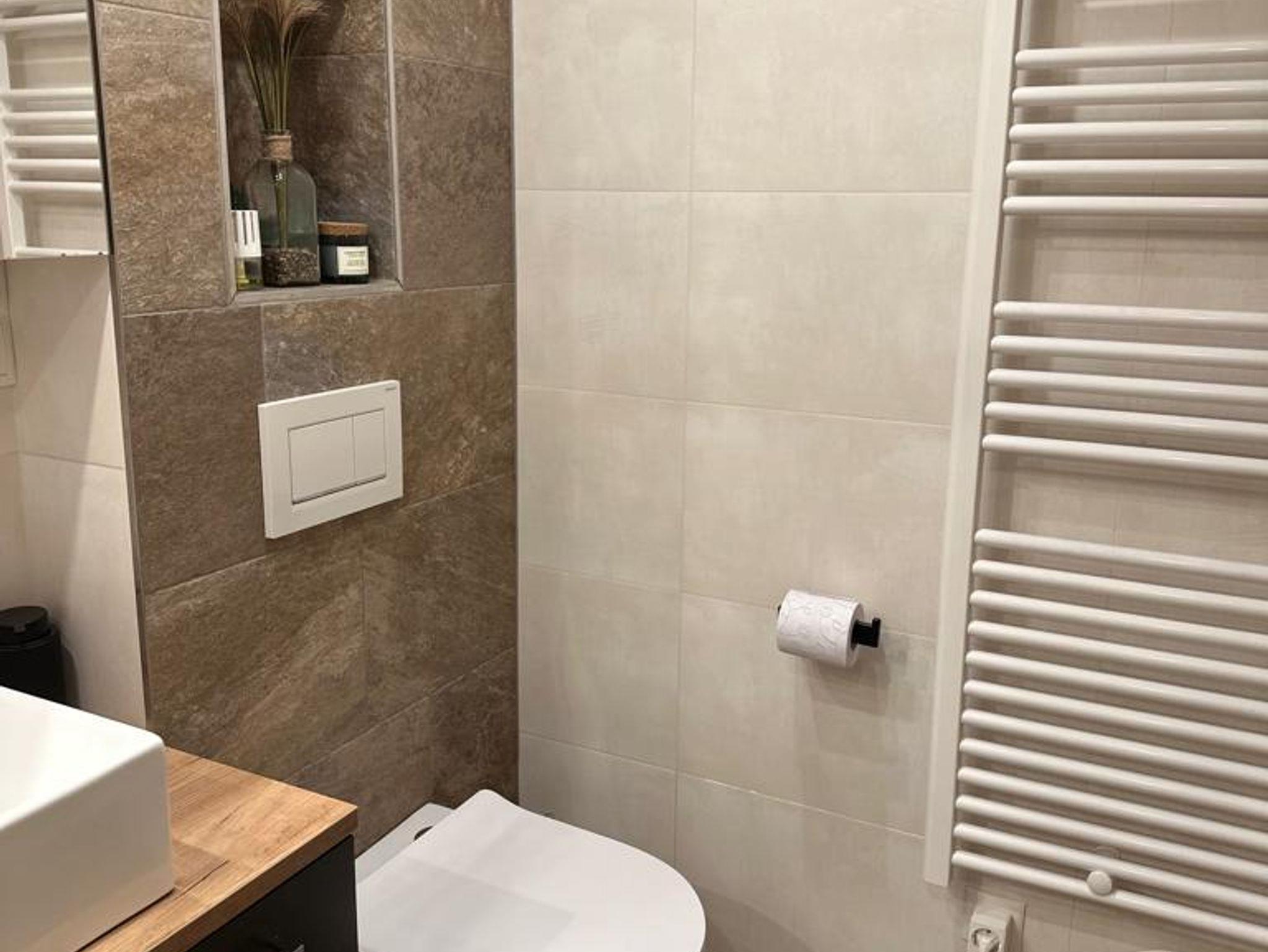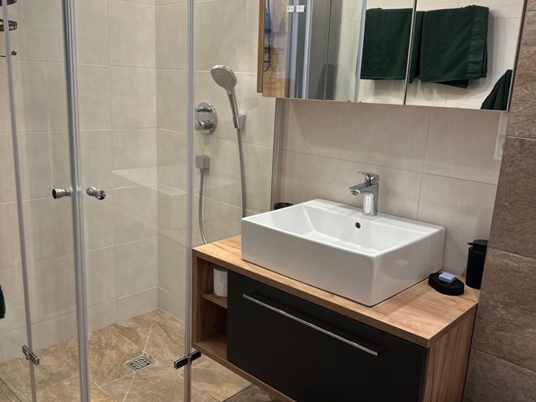 • Badezimmer mit Haartrockner, frischen Hand- und Duschtüchern, Shampoo, Duschgel