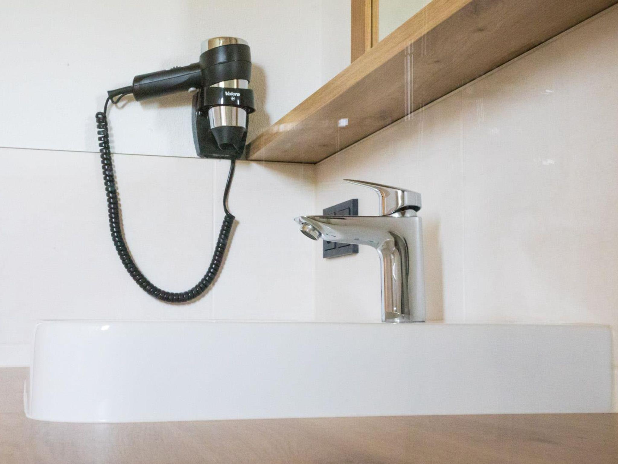schönes großes Wohlfühl-Badezimmer mit Dusche, Handtücher und Föhn, getrenntes WC