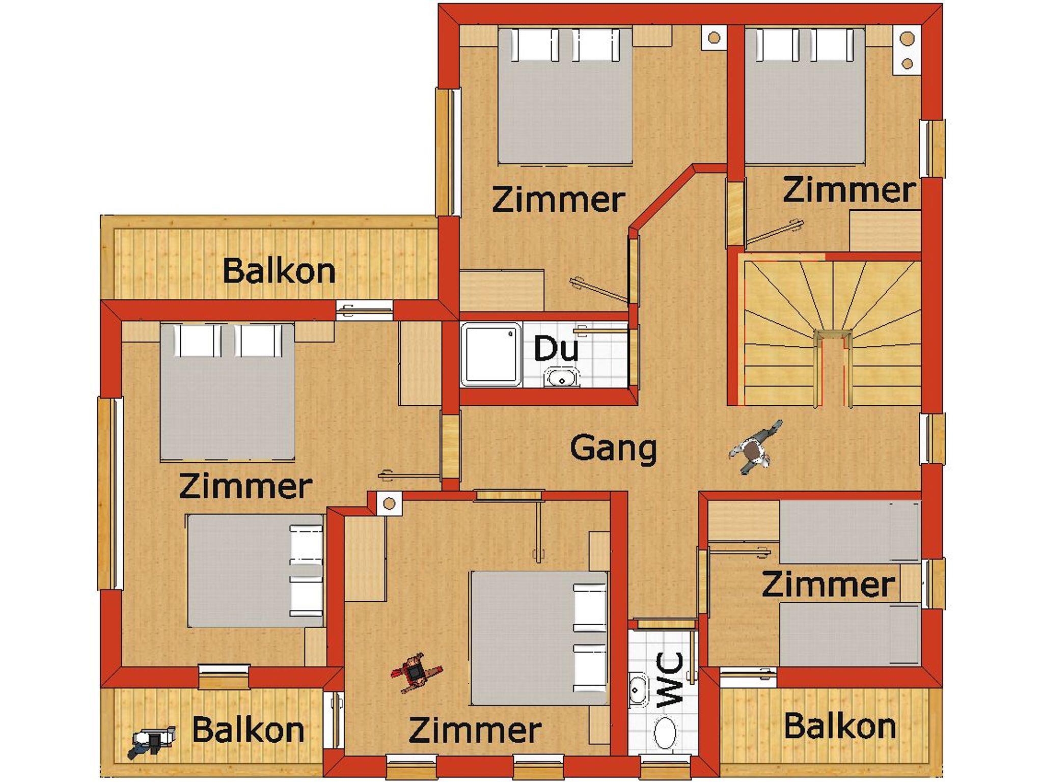 OG: 1 x 2-Bettzimmer, 2 x Doppelzimmer, 1 x 4-Bett, 1 x Dusche, 1 x WC. Im Dachgeschoß befinden sich 3 Doppelzimmer und 1 x 2 Bettzimmer, welche optional dazugemietet werden können. Weitere Duschen und WCs, sowie der Skiraum mit Schuhtrockner und die Holzpellets-Zentralheizung sind im Kellergeschoß. Bitte bringen Sie Ihre Bettwäsche selber mit!