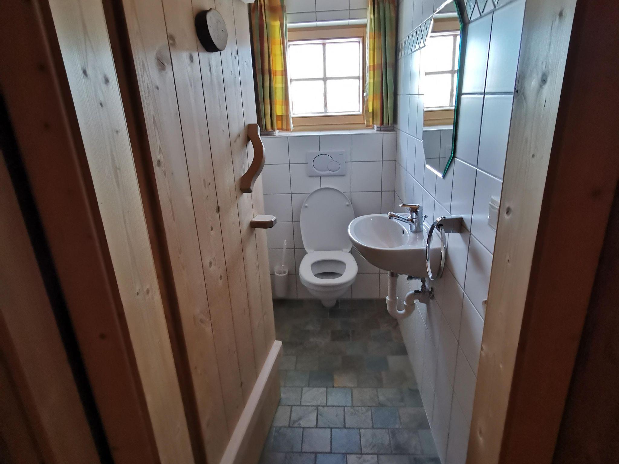 Im Erdgeschoß befindet sich die komplett ausgestattete u. geräumige Wohnküche (E-Herd mit Backrohr, großer Holzherd mit Backrohr, Kühlschrank, Gefrierschrank, Geschirrspüler, Mixer, Wasserkocher), Speisekammer, der Wohnraum mit Schwedenofen (Sat-TV), ein rollstuhlgerechtes 2-Bettzimmer, WC, Waschtisch.