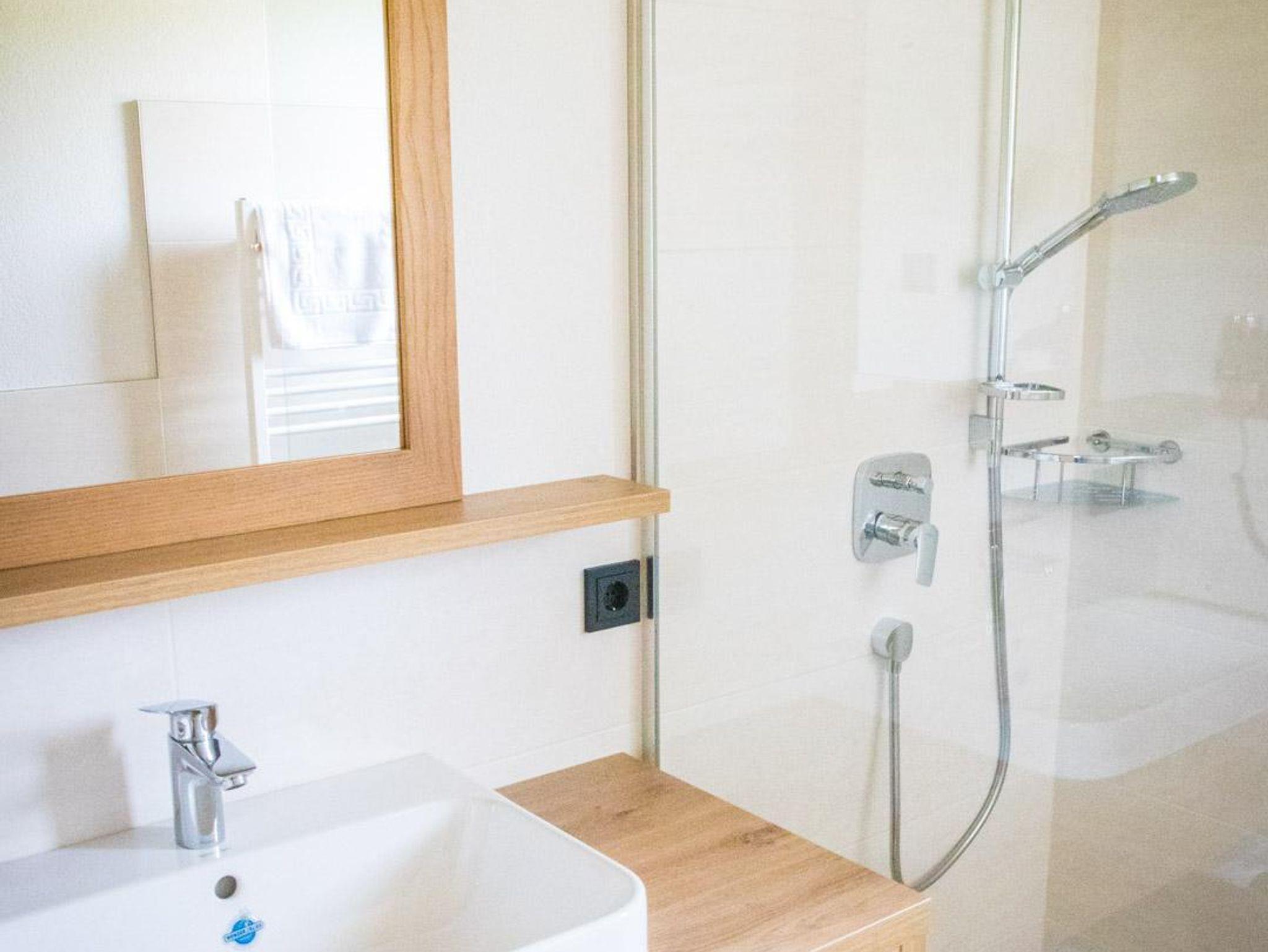 schönes großes Wohlfühl-Badezimmer mit Dusche und Föhn, getrenntes WC