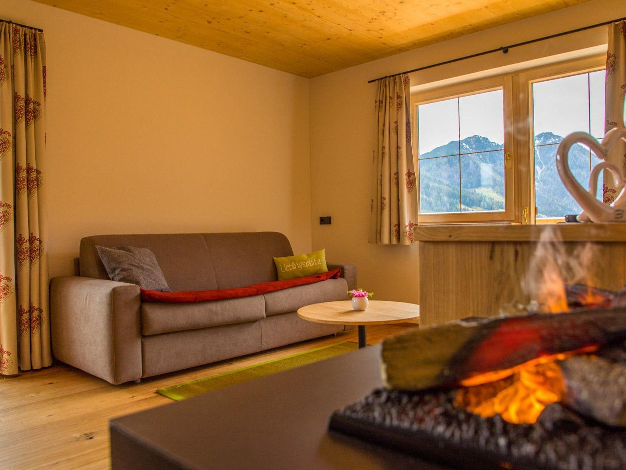 heimeliger, gemütliche Holzdecke in der ganzen Ferienwohnung, Holz-Fußboden mit Bodenheizung, Holz-Garderobe, gemütliches Sofa(Schlafcouch für 1-2 Personen),mit Sat-TV, Sitzgelegenheit mit Holztisch und Effektfeuerkamin, Süd-Balkon,Wlan
