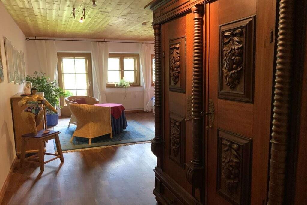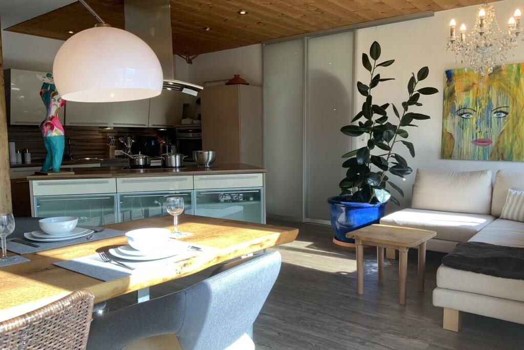 Für 2 bis 5 Personen ca 100 m² auf 2 Wohnebenen plus Südbalkon, überdachte Terrasse, großer Garten ( alleinige Nutzung) Saunahäuschen ( 2 Abende gratis ), zusätzlich wetterunabhängiger Outdoorschlafplatz sowie einige Fitnessgeräte unter den Arkaden, 2 überdachte Pkw-Stellplätze, Abstellraum / Skiraum mit Skischuhtrockner, Nutzung von 2 Schlitten, Auf Wunsch kann ein Babybett mit in das große Schlafzimmer gestellt werden. IHR schlaft auf hochwertigen Naturlatexzonenmatratzen in Naturbettwaren mit Biobettwäsche. Die gut ausgestattete Wohnküche mit Kochinsel lädt zum gemeinsamen Kochen ein.