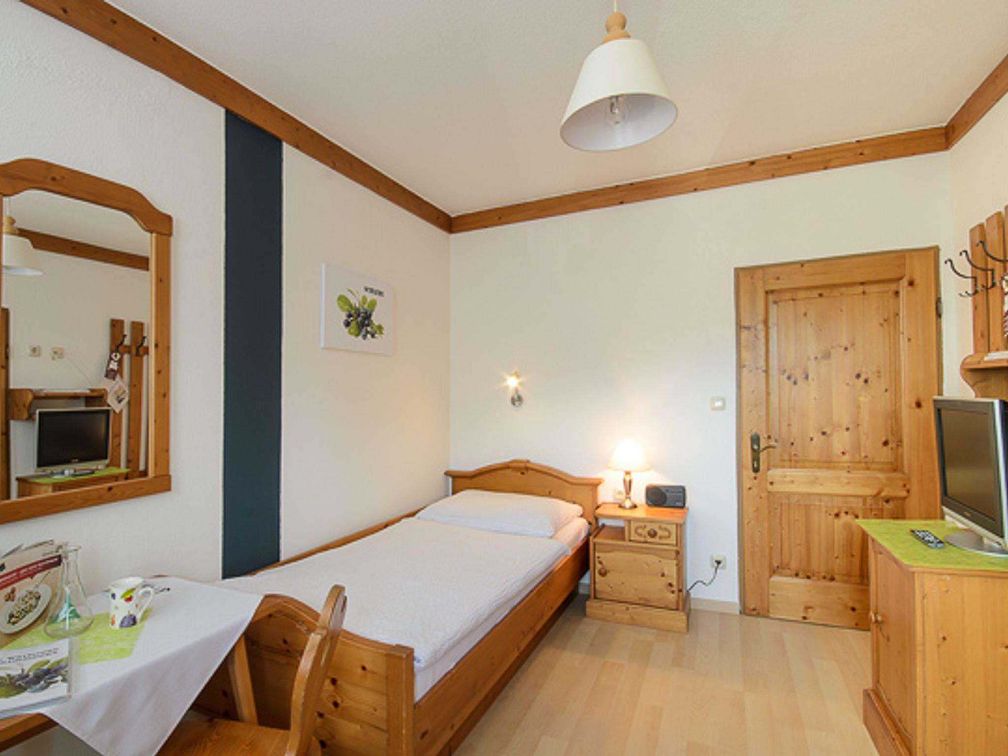Wirtshausbrennerei Krenn, Einzelzimmer Obst ausgestattet mit Naturholzmöbeln