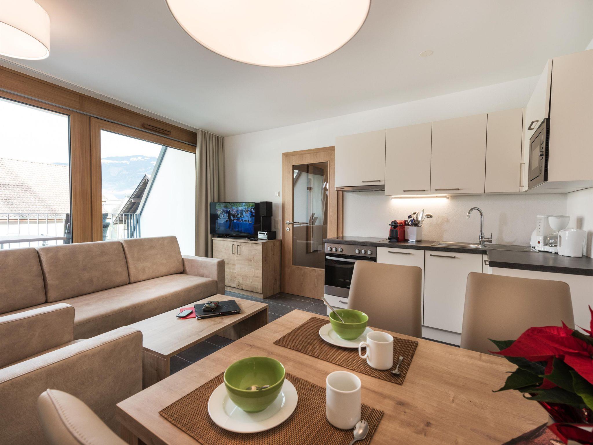 **** Niveau für 2–4 Personen, Wohnraum mit 40 m² im 2. Stock, 1 Schlafzimmer (Doppelbett, Kleiderschrank, Vorraum mit Garderobe, 1 Bad, Hochwertige großzügige Einbauküche (im Wohnbereich integriert, LCD Fernseher, Musikanlage, Kostenloses W-LAN, Balkon oder Terrasse, Bettwäsche und Handtücher inklusive