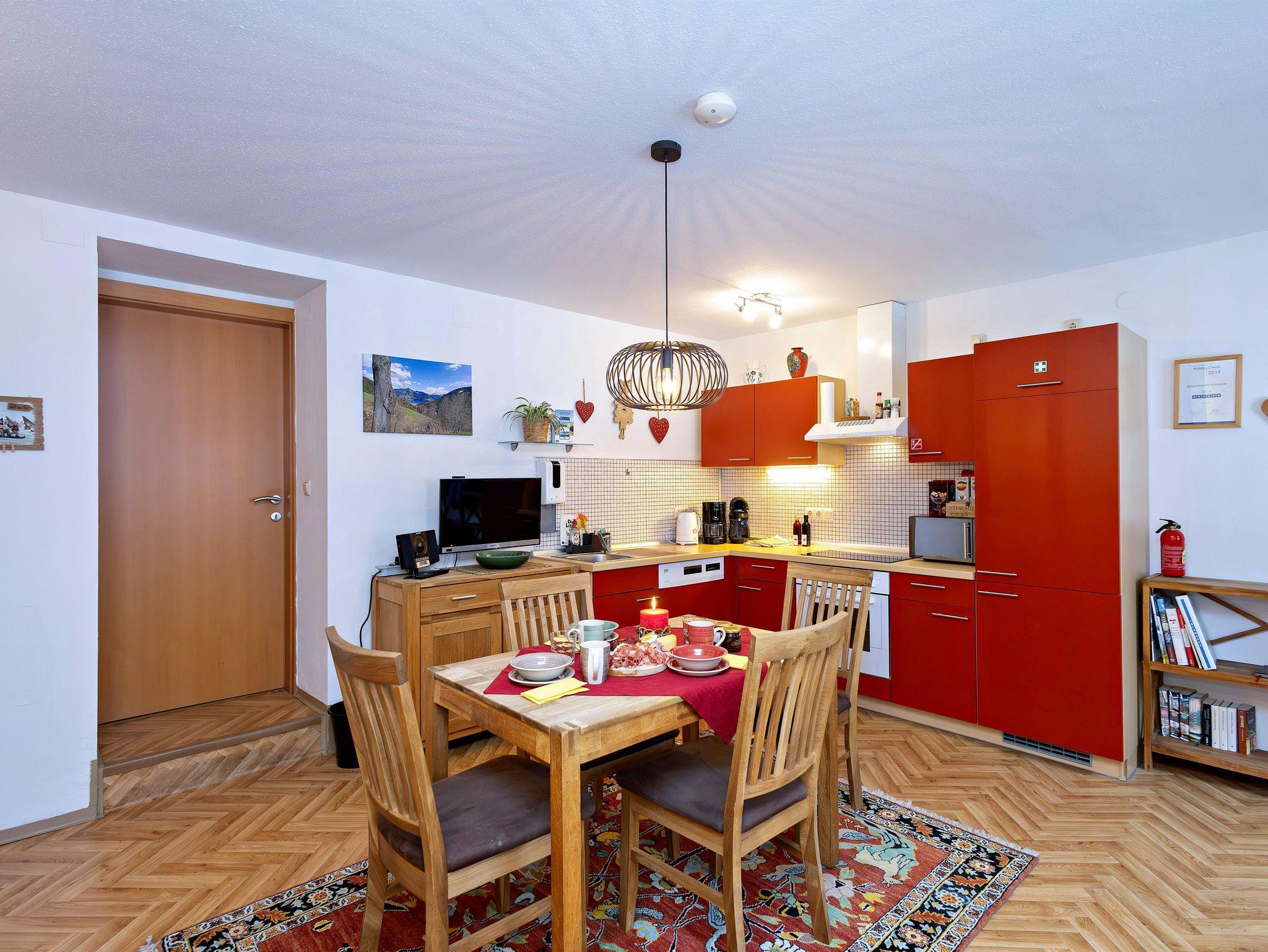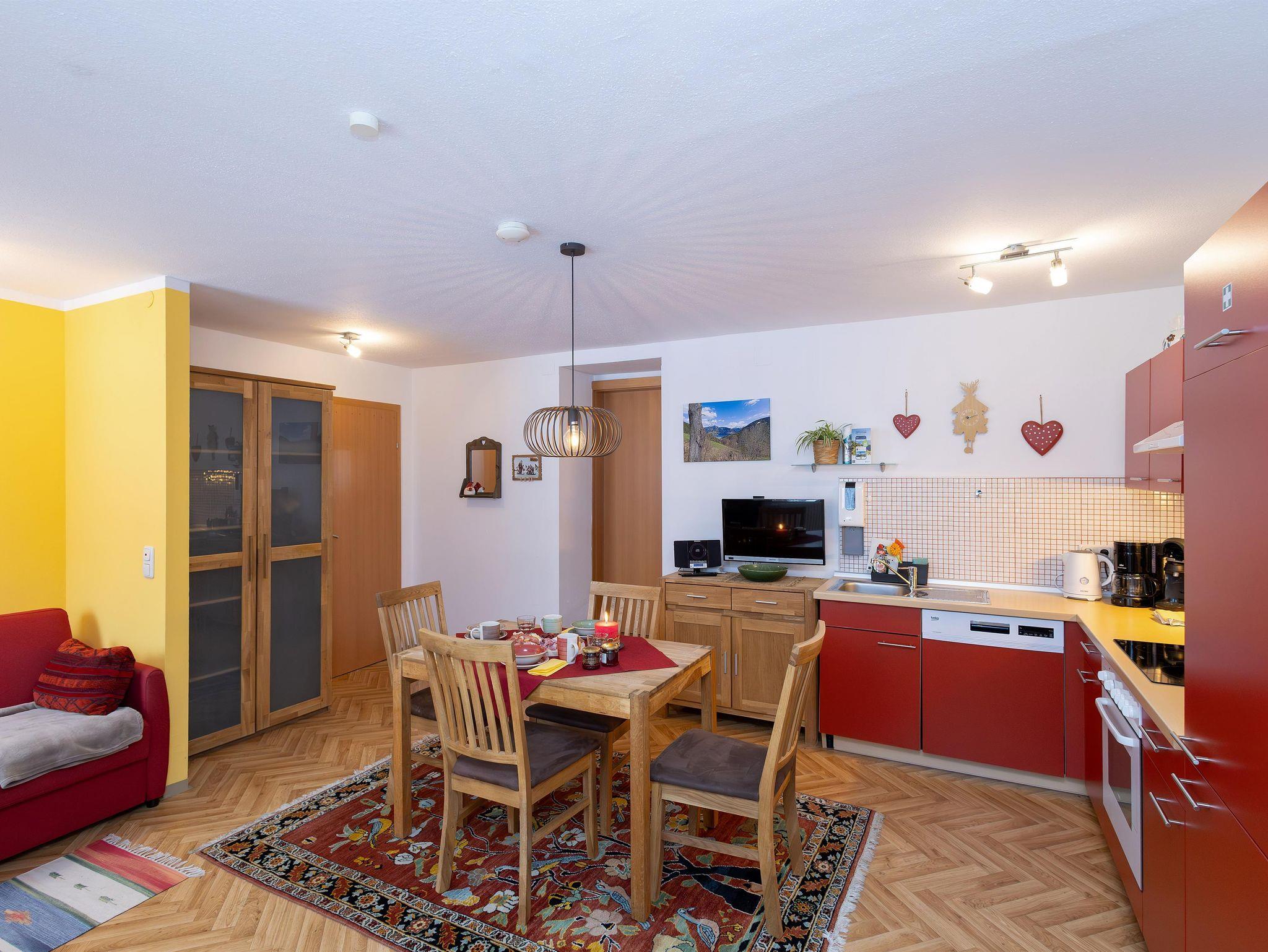 Das Appartement (für 2-4 Personen) wurde im Sommer 2009 fertiggestellt. Es befindet sich im Erdgeschoss, verfügt über einen separaten Eingang, und besteht aus einem Schlafzimmer, einer Wohn-/Essküche mit ausziehbarer Doppelcouch, und einem Bad mit Dusche/WC. Die Wohnküche ist komplett mit Herd mit Cerankochfeld, Backofen, Mikrowelle und Geschirrspülmaschine, sowie Kaffeemaschine, Toaster und Wasserkocher gut ausgestattet. Zur Mitbenützung steht unseren Gästen ein Autoabstellplatz (überdachtes Carport) sowie im Sommer eine Liegewiese zur Verfügung. Für unsere kleinen Gäste steht eine Sandkiste bereit! Neu - seit dem Winter 2009/10 gibt es auch einen Skischuhtrockner im Eingangsbereich des Appartements sowie eine Möglichkeit die Skier sicher zu versperren!