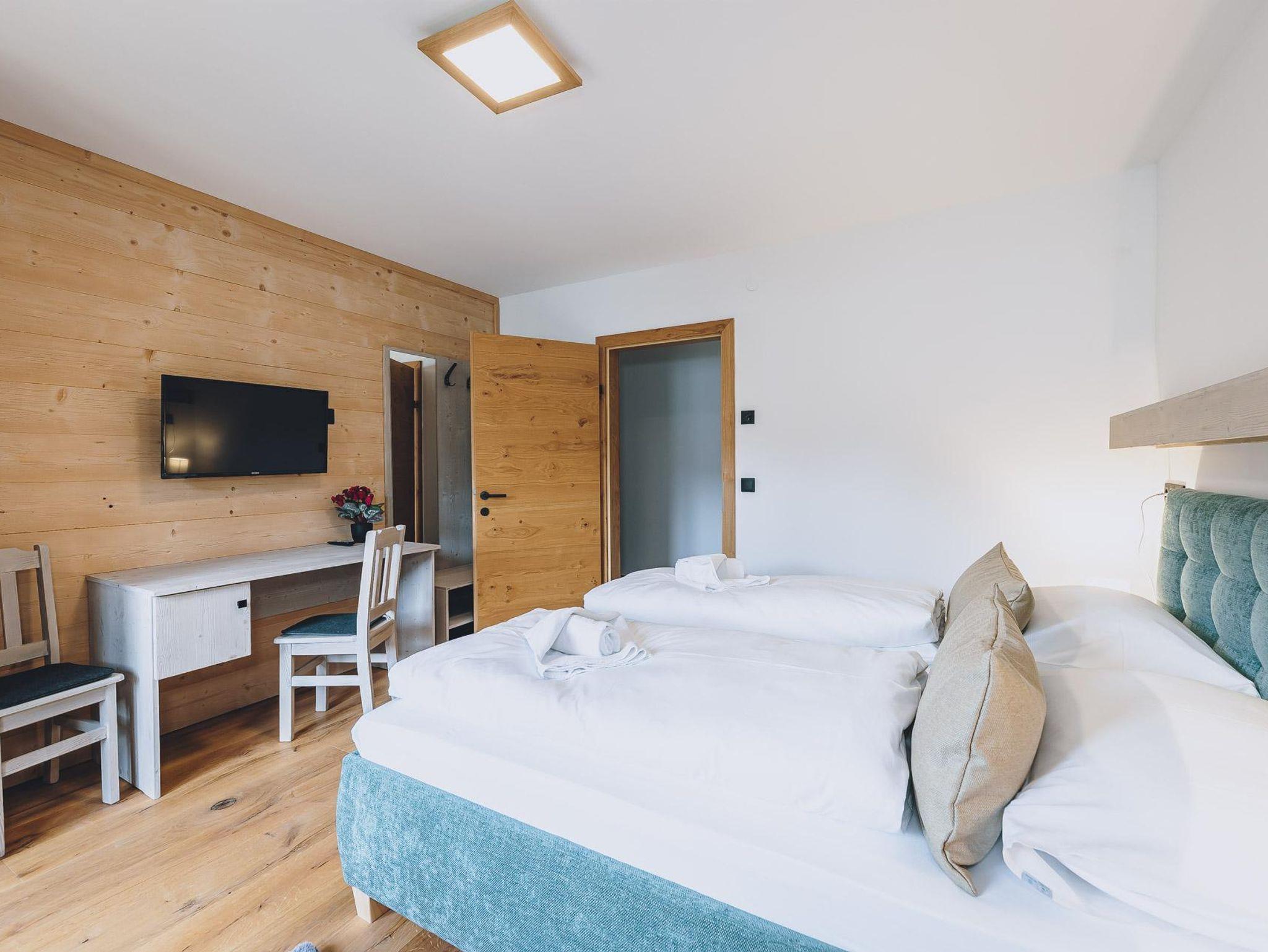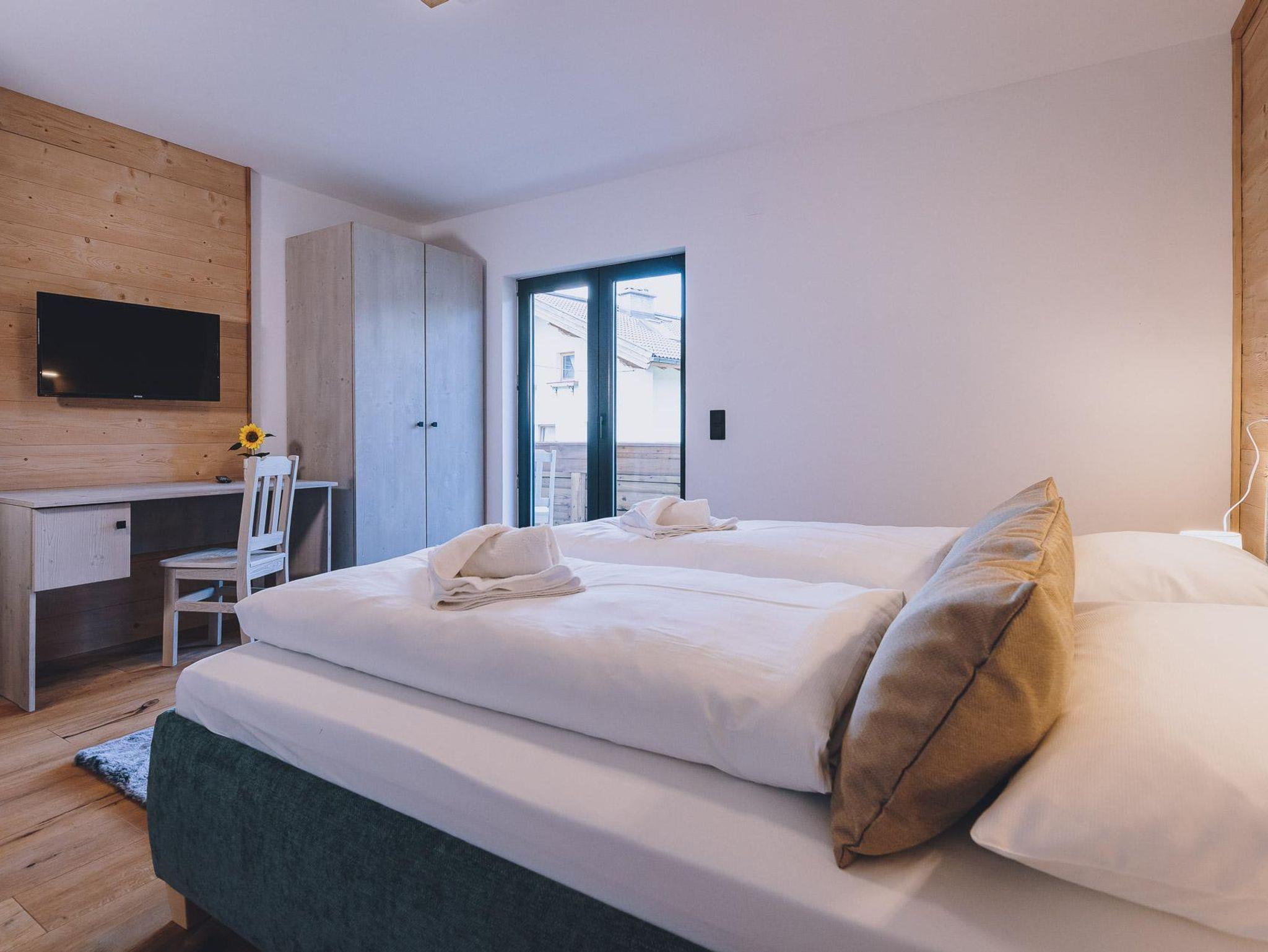 Der Wohnküche besteht aus einem großen Wohnzimmer mit langer Tafel, welche genügend Sitzmöglichkeiten für die ganze Gruppe bietet. Gleich daneben haben wir die große Küche mit voller Ausstattung platziert. Auf 90 m2 befinden sich zudem 3 Schlafzimmer, die mit Doppelbett, Kleiderschrank und Schreibtisch ausgestattet ist. Außerdem kann man über jedes der Schlafzimmer den Balkon erreichen.