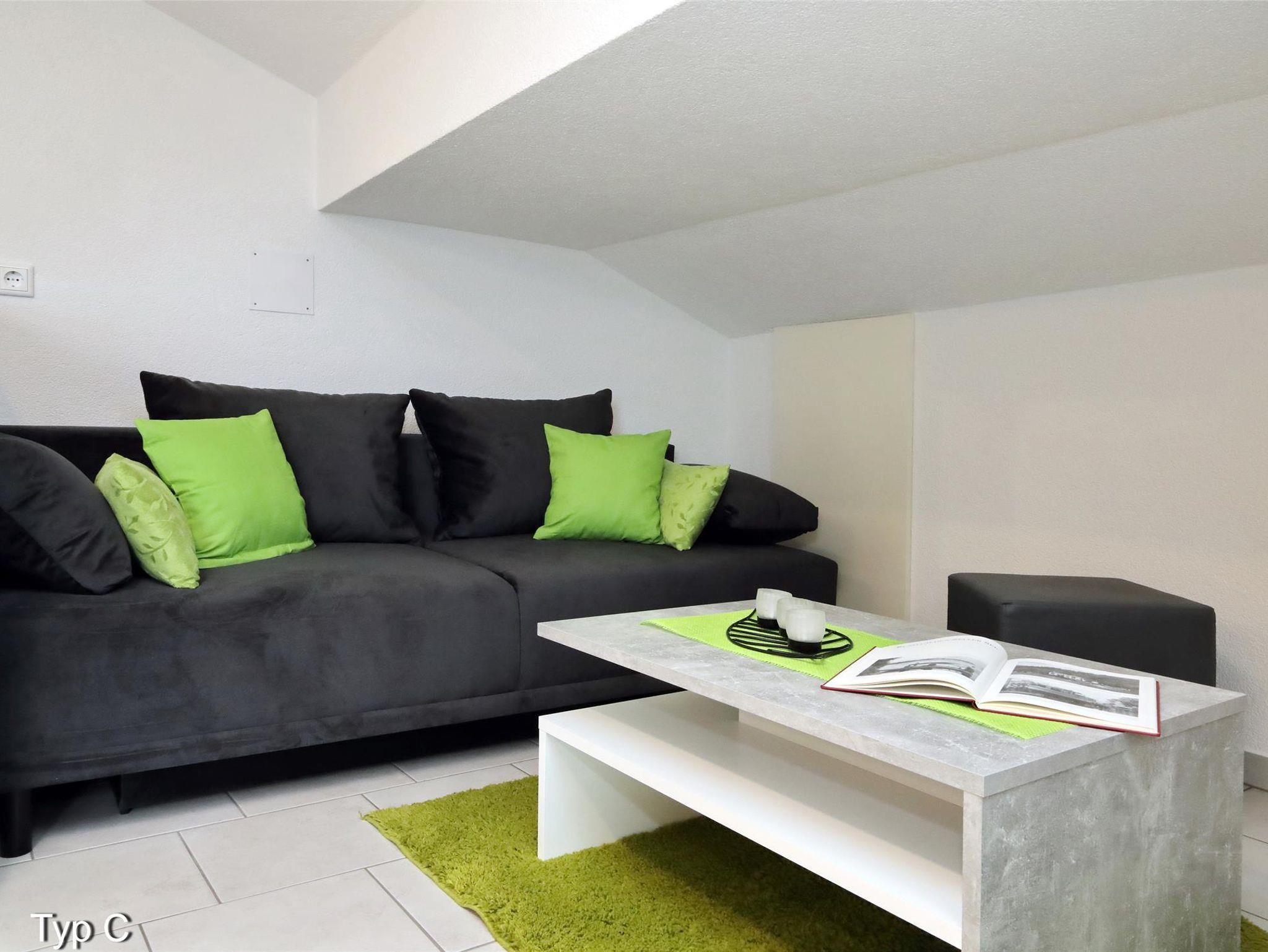 Das Appartement ist gemütlich und modern eingerichtet und bietet einen herrlichen Balkon. Materialien wie Holz, Edelstahl und Leder geben den Chalets einen eigenen Flair. Es ist ideal für bis zu 6Personen mit zwei Schlafzimmer mit Doppelbett sowie einer Couch im Wohnbereich. Das Apartment verfügt über eine Einbauküche mit Kühl/Gefrierschrank, Geschirrspüler, Mikrowelle, E-Herd/Backofen, Kaffeemaschine und einen Wasserkocher. Zur Ausstattung gehören natürlich auch Geschirr, Gläser, Töpfe und alle nötigen Utensilien die sie brauchen, um sich ein leckeres Menü zu zaubern. Natürlich verfügen auch alle Wohnungen über gratis Internet und einen Flachbildfernseher mit Kabel TV, sowie einem Föhn in den Badezimmern.