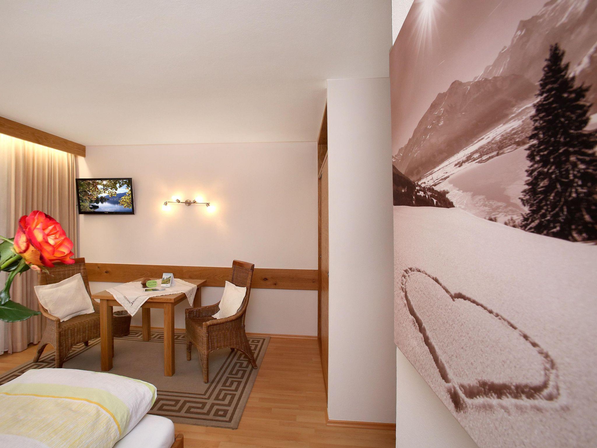 Ein Wohnschlafraum, mit normalem Doppelbett und Sitzbereich, 1 EXTRA Küche mit Essecke, Vorraum, Dusche WC sehr großer Balkon mit Sitzecke und unverbauten Bergblick
