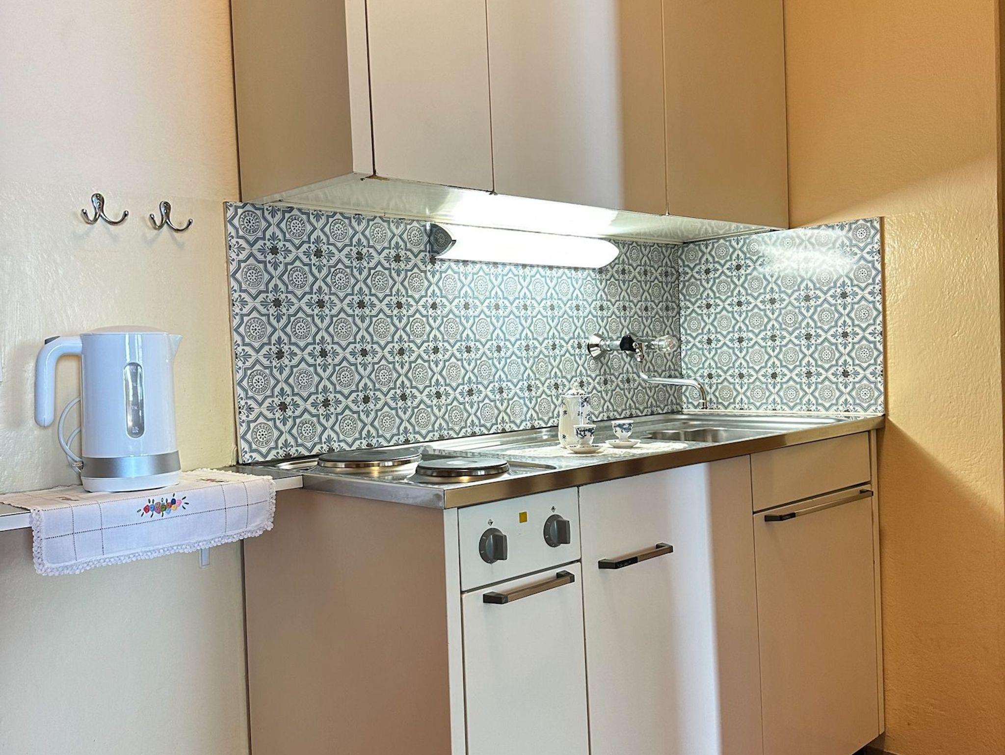 • Kochnische mit Kühlschrank, 2-Plattenherd, Kaffeemaschine, Wasserkocher und Toaster