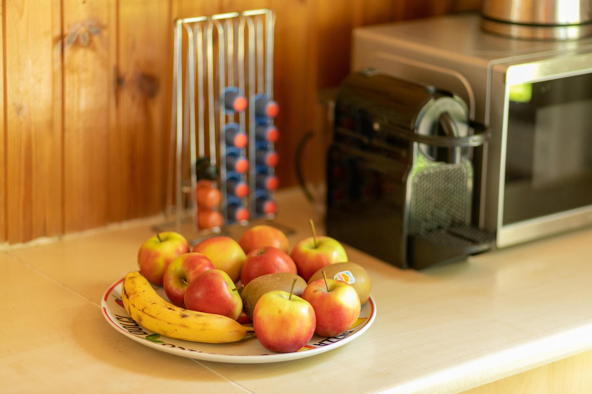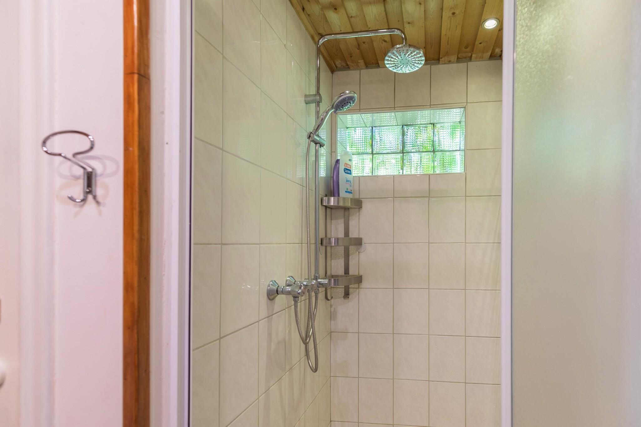 Stueetage: (Indgang , Køkken(elkedel, espressomaskine, mikrobølgeovn, køle-fryseskab), stue / spisestue(dobbeltsovesofa, spisebord, kakkelovn, sofahjørne), soveværelse(dobbeltseng), badeværelse(bruser, håndvask), toilet(toilet)) terrasse, have, havemøbler, parkering