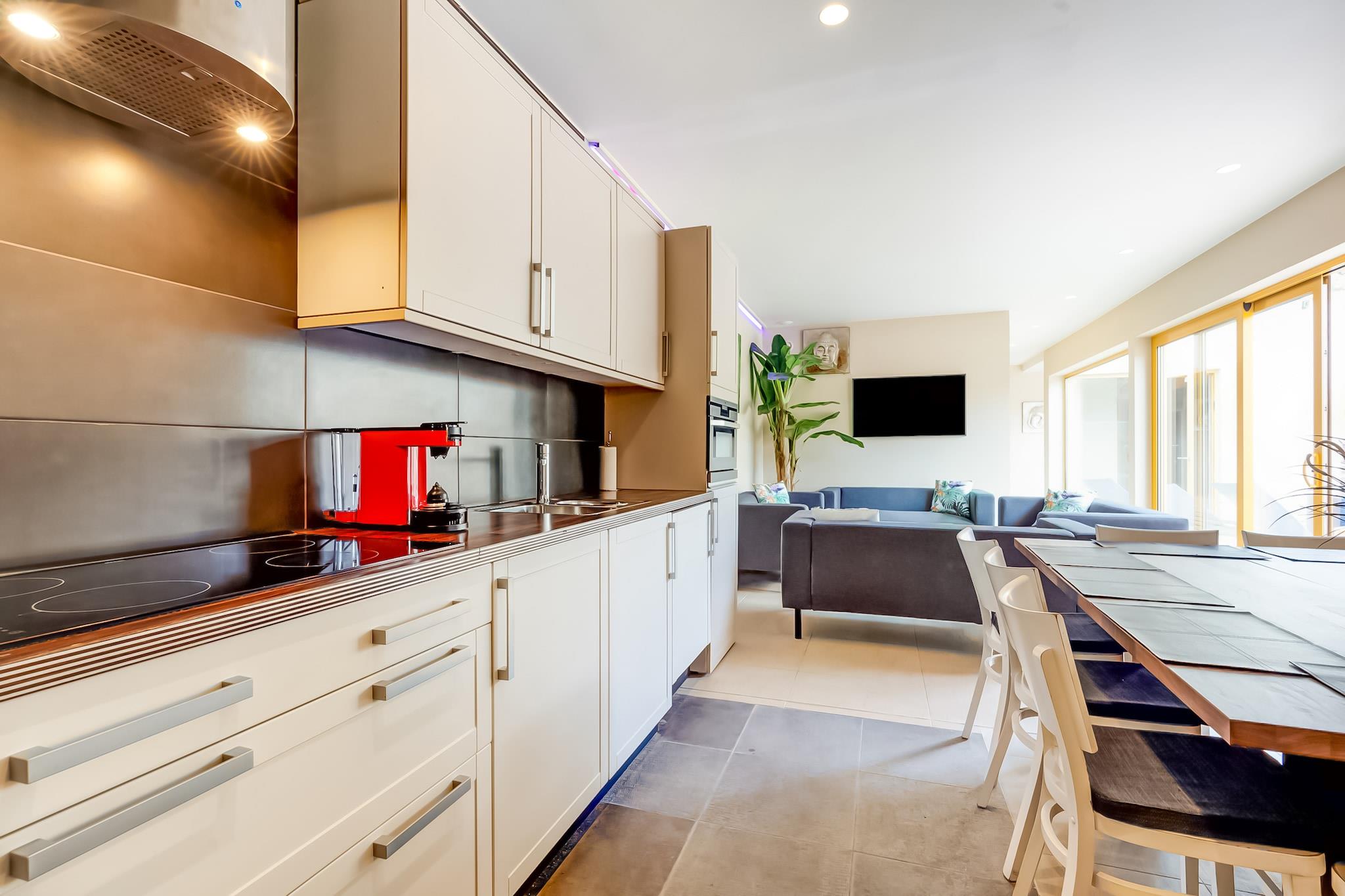 Stueetage: (åbent køkken(spisebord, kogeplade, ovn, mikrobølgeovn, køle-fryseskab), stue / spisestue(spisebord), soveværelse(dobbeltseng, håndvask), soveværelse(køjeseng, håndvask), Soveværelse med badeværelse(dobbeltseng, dobbeltseng, Fjernsyn, bruser, håndvask), badeværelse(bruser, håndvask), toilet, toilet, massagebruser) Netflix, kaffemaskine, opvaskemaskine , Bubble bath, dampbruser, massagebruser, sauna, varme, terrasse, havemøbler, solstole, parkering, liggestole, Parasol, swimmingpool(privat), barneseng, barnestol, baldakin, loungemøbler