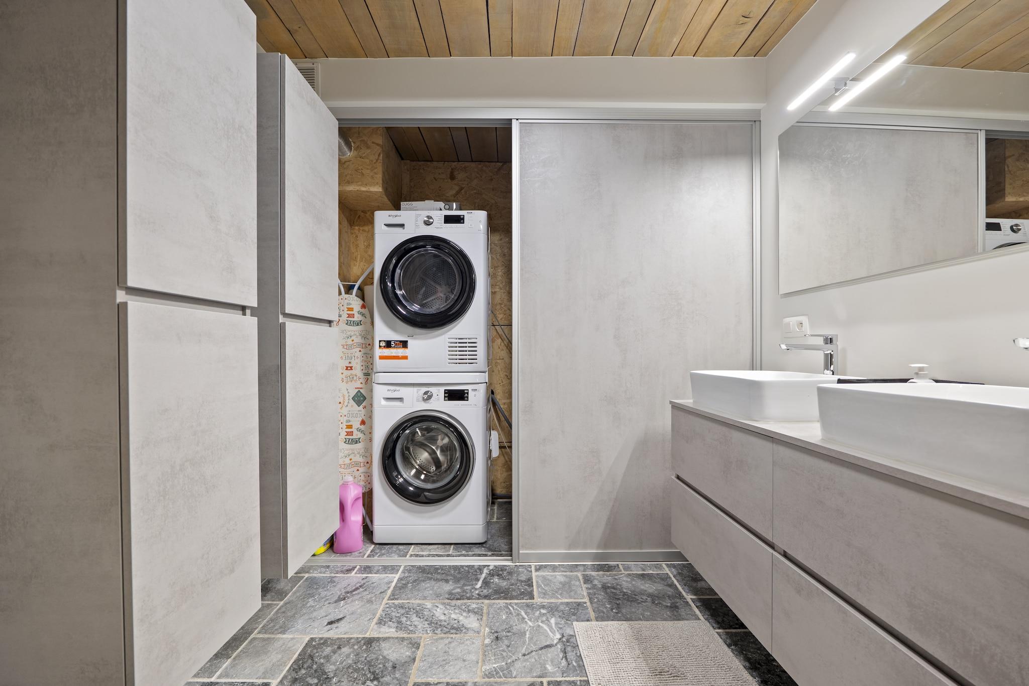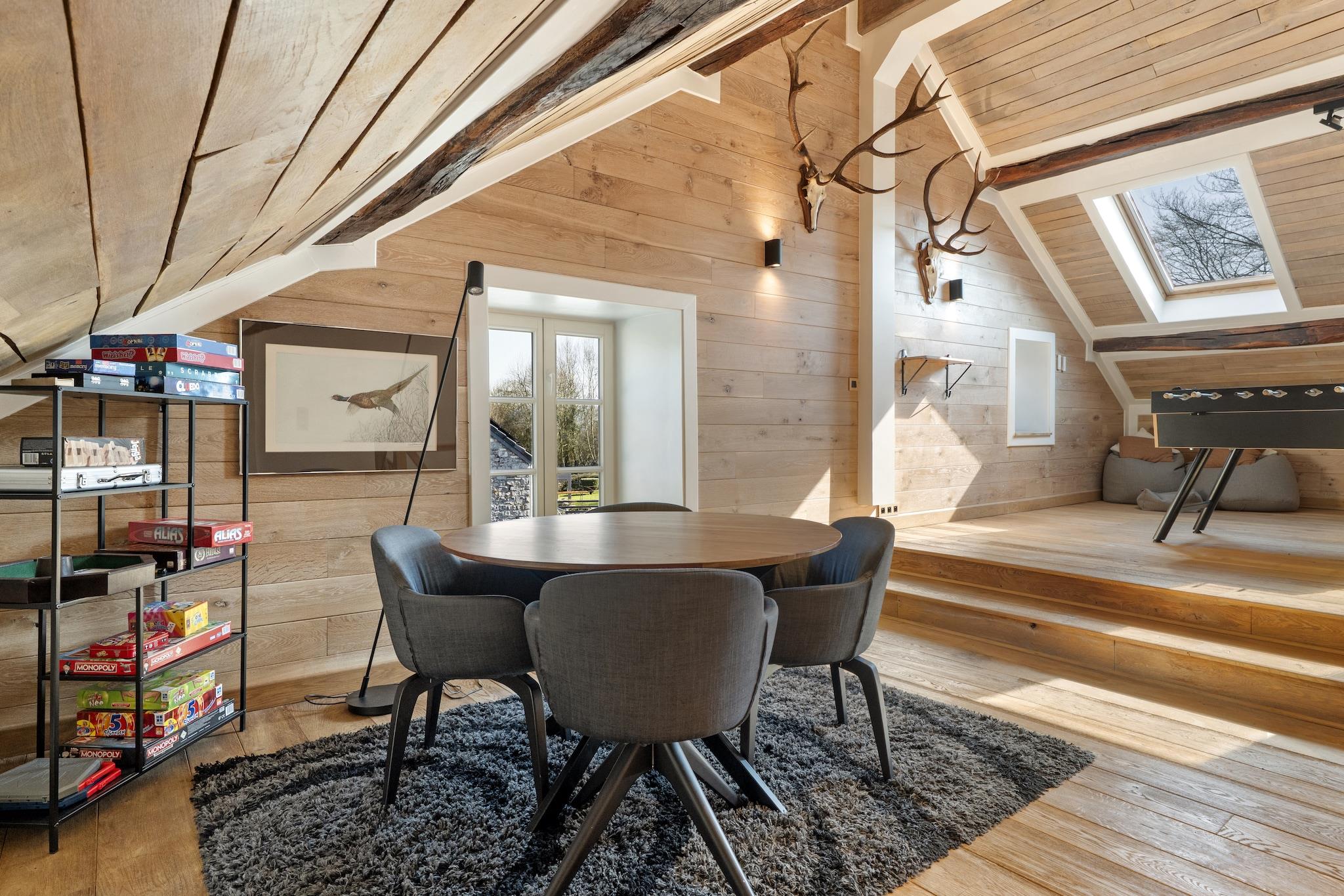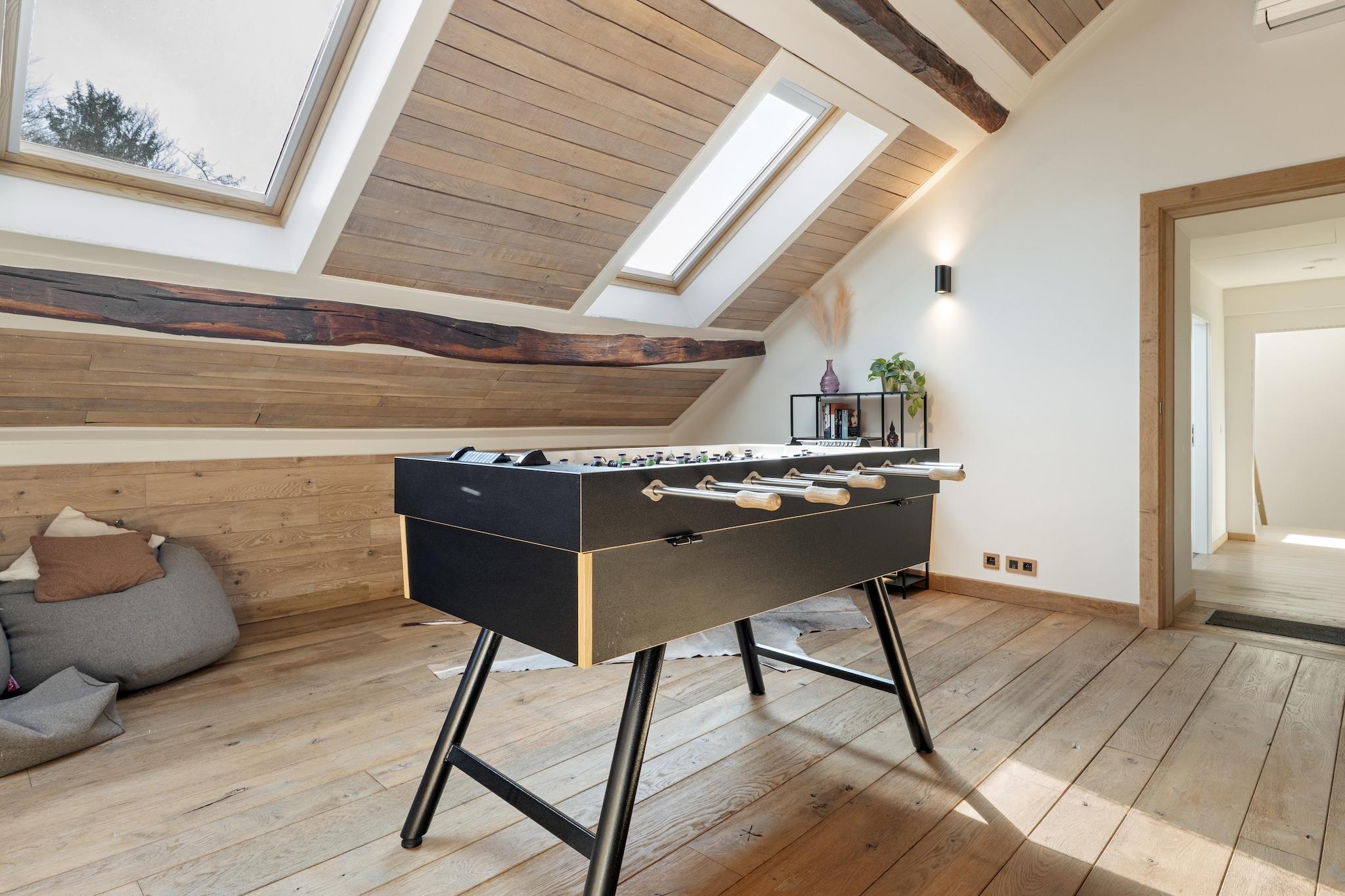 Velkommen til dette smukt indrettede landsted i Aywaille, der er egnet til 9 gæster og perfekt til familier eller vennegrupper, der ønsker at kombinere luksus, plads og natur. I stueetagen finder I en rummelig entré, en hyggelig stue, et fuldt udstyret køkken, en separat spisestue, et praktisk bryggers og et separat toilet. Første sal byder på et komfortabelt soveværelse og to stilfulde badeværelser: et med dobbelt håndvask, bruseniche, vaskemaskine og tørretumbler, og et med badekar, bruseniche, dobbelt håndvask og toilet, plus et ekstra separat toilet. På anden sal er der fire ekstra soveværelser, hvilket sikrer masser af privatliv for alle. Alle soveværelser er udstyret med en dobbeltseng, gulvvarme og aircondition, hvilket garanterer optimal komfort i enhver sæson. På mezzaninen finder I et hyggeligt opholdsrum med siddeområde, stereoanlæg, bordfodbold, dart, billard og brætspil – perfekt til lange, hyggelige aftener sammen. Udenfor kan I slappe af i den store have med rummelig terrasse, tøndesauna, gasgrill og komfortabelt loungesæt. Der er rigelig privat parkering, en barneseng er tilgængelig, og sengene er redt ved ankomst, så din ferie kan starte med det samme. Beliggenheden er en anden stor fordel. Nyd en smuk gåtur langs Ninglinspo, oplev Les Fonds de Quarreux eller besøg de imponerende Remouchamps-huler. Familier vil elske Wild World Safari Park. Inden for 30 minutters kørsel når du den verdensberømte Circuit de Spa-Francorchamps og vandfaldene i Coo. Den charmerende by Durbuy ligger også i nærheden. Her bor du i hjertet af Ardennerne, med natur, eventyr og afslapning inden for rækkevidde.