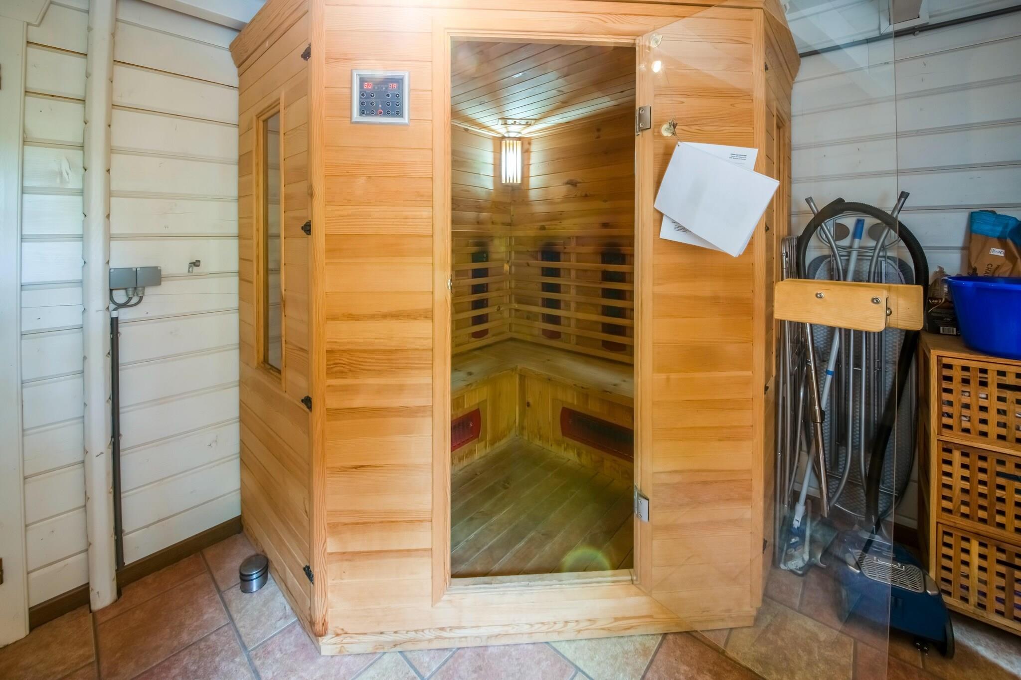 Stueetage: (åbent køkken(komfur(Komfur med seks kogeplader, gas), kaffemaskine, ovn, mikrobølgeovn, opvaskemaskine , køle-fryseskab), stue / spisestue(Fjernsyn, DVD-afspiller), soveværelse(dobbeltseng, barneseng), soveværelse(køjeseng), badeværelse(2x håndvask, toilet), vaskerum (køle-fryseskab, infrarød sauna), veranda, terrasse(overdækket)) På 1. etage: (soveværelse(dobbeltseng), soveværelse(dobbeltseng), soveværelse(dobbeltseng), badeværelse(badekar, håndvask, toilet), opholdsrum(enkeltseng, enkeltseng, bordfodbold, biljard), terrasse(overdækket)) kakkelovn, badekar eller bruser, Bubble bath, bruser, sauna, vaskemaskine, patio, varme, have(indhegnet), havemøbler, grill, petanquebane, legeredskaber, barnestol, barnestol, hyggespil