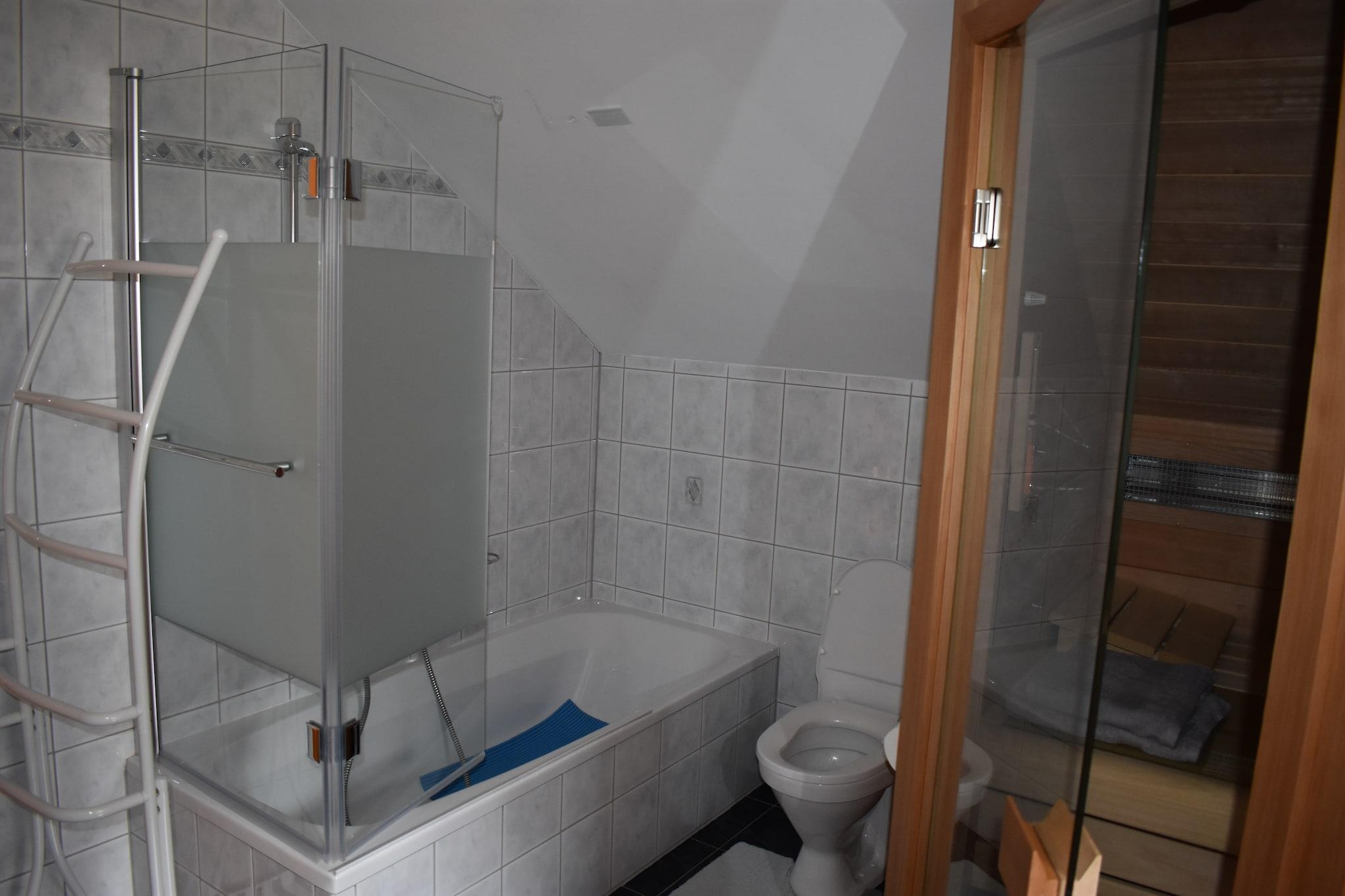 Stueetage: (åbent køkken(spisebord, elkedel, komfur(Komfur med fire kogeplader, glaskeramisk), kaffemaskine, mikrobølgeovn, opvaskemaskine , køle-fryseskab, barnestol), stue / spisestue(Fjernsyn(fladskærm), spisebord(8 personer), DVD-afspiller, stereoanlæg), Soveværelse med badeværelse(dobbeltseng(160 x 200 cm), bruser, håndvask), vaskerum (ovn, strygebræt, strygejern), toilet) På 1. etage: (soveværelse(2x enkeltseng(90 x 200 cm), Fjernsyn, DVD-afspiller, bordfodbold), soveværelse(dobbeltseng(140 x 200 cm)), soveværelse(dobbeltseng(160 x 200 cm)), badeværelse(badekar, sauna, håndvask, toilet)) opholdsrum, badekar eller bruser, infrarød sauna, vaskemaskine, terrasse, terrasse(overdækket), have, havemøbler, grill, liggestole, Parasol, sandkasse, legeredskaber, rutsjebane, barneseng, barneseng, føntørrer, hyggespil