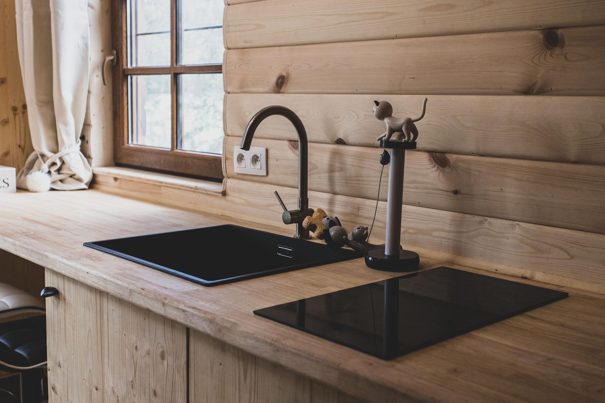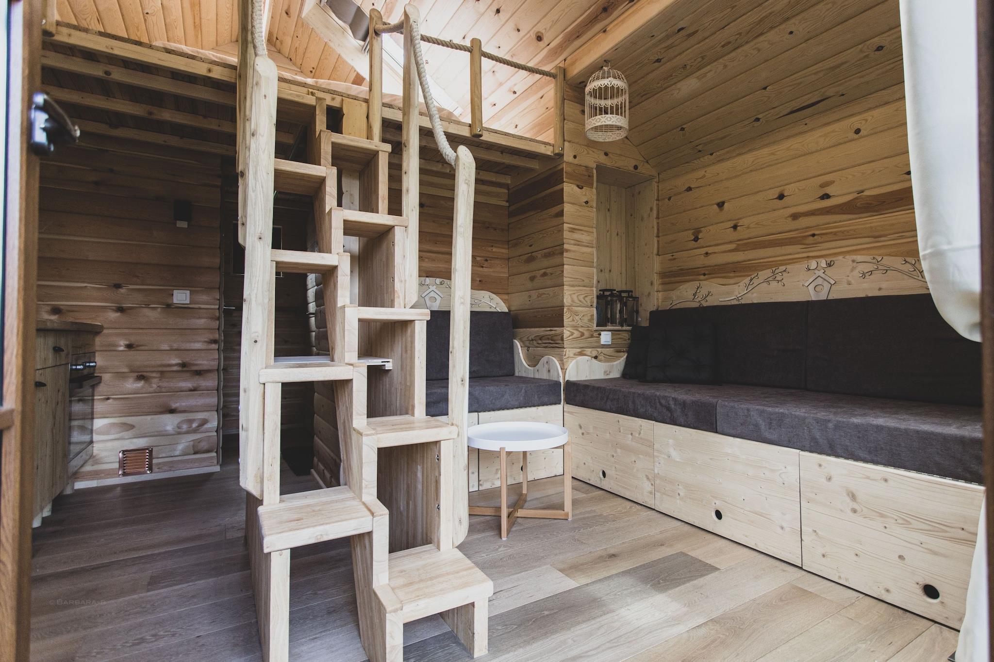Mellemetage: (soveværelse(dobbeltseng(dobbelt dynebetræk, dobbeltlagen, 160 x 200 cm))) Blokhytte: (tekøkken(spisebord(2 personer), elkedel, brødrister, komfur(Komfur med to kogeplader, glaskeramisk), kaffemaskine, ovn, køle-fryseskab), sanitært rum(bruser, håndvask, toilet), sauna, sofahjørne(4 personer), bruser, balkon eller terrasse) mikrobølgeovn, badekar eller bruser, hottub, infrarød sauna, sauna, varme, terrasse, have, havemøbler, solstole