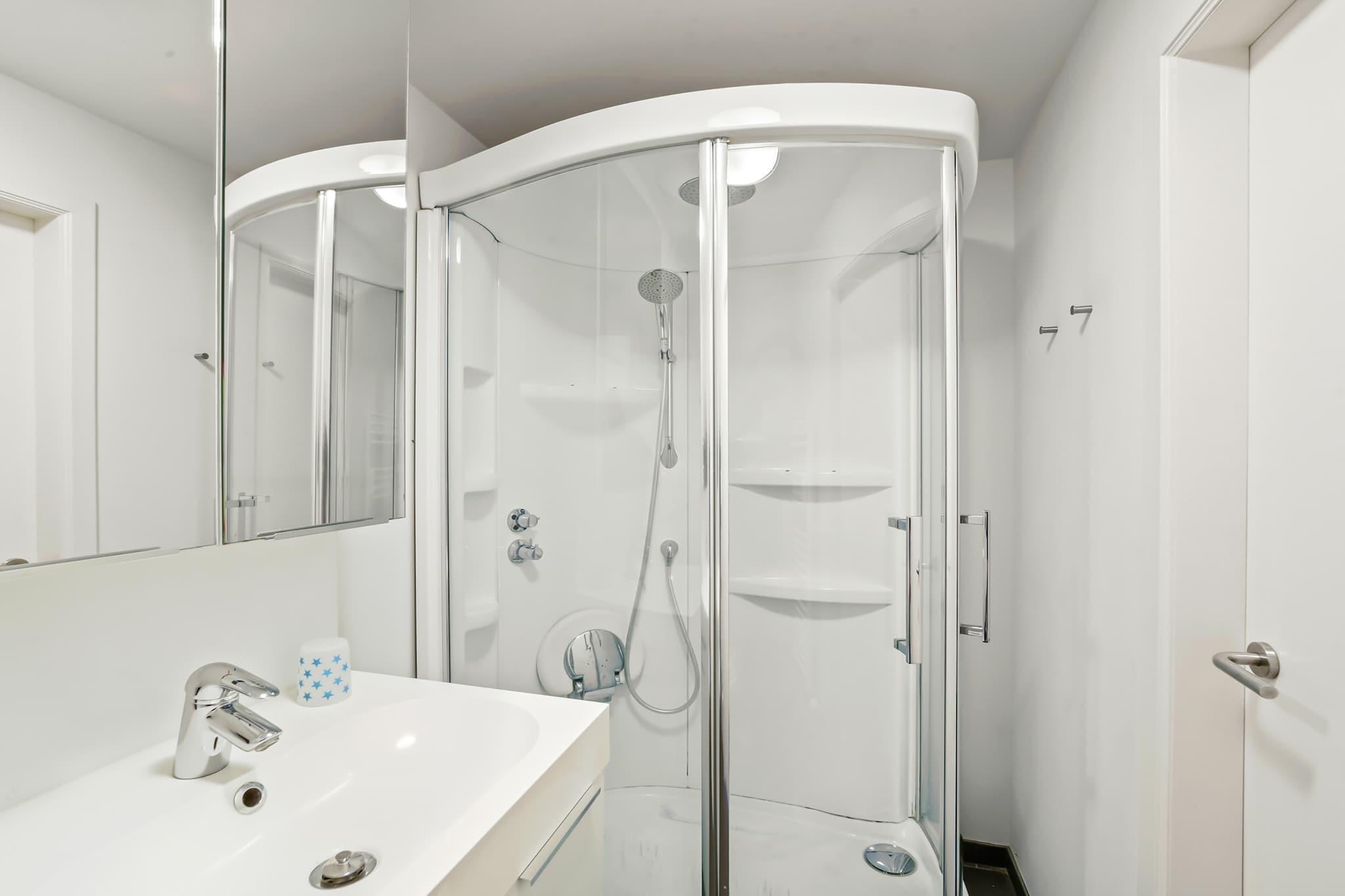 Stueetage: (Køkken(elkedel, brødrister, kaffemaskine, ovn, mikrobølgeovn, opvaskemaskine , køleskab(+ fryser), Saftpresser), Stue/soveværelse(dobbeltsovesofa(dobbelt dynebetræk, 160 x 200 cm), Fjernsyn(digital), spisebord, sofahjørne, balkon), soveniche(køjeseng(dynebetræk)), badeværelse(bruser, føntørrer), toilet(guest toilet), terrasse, legeredskaber, elevator)