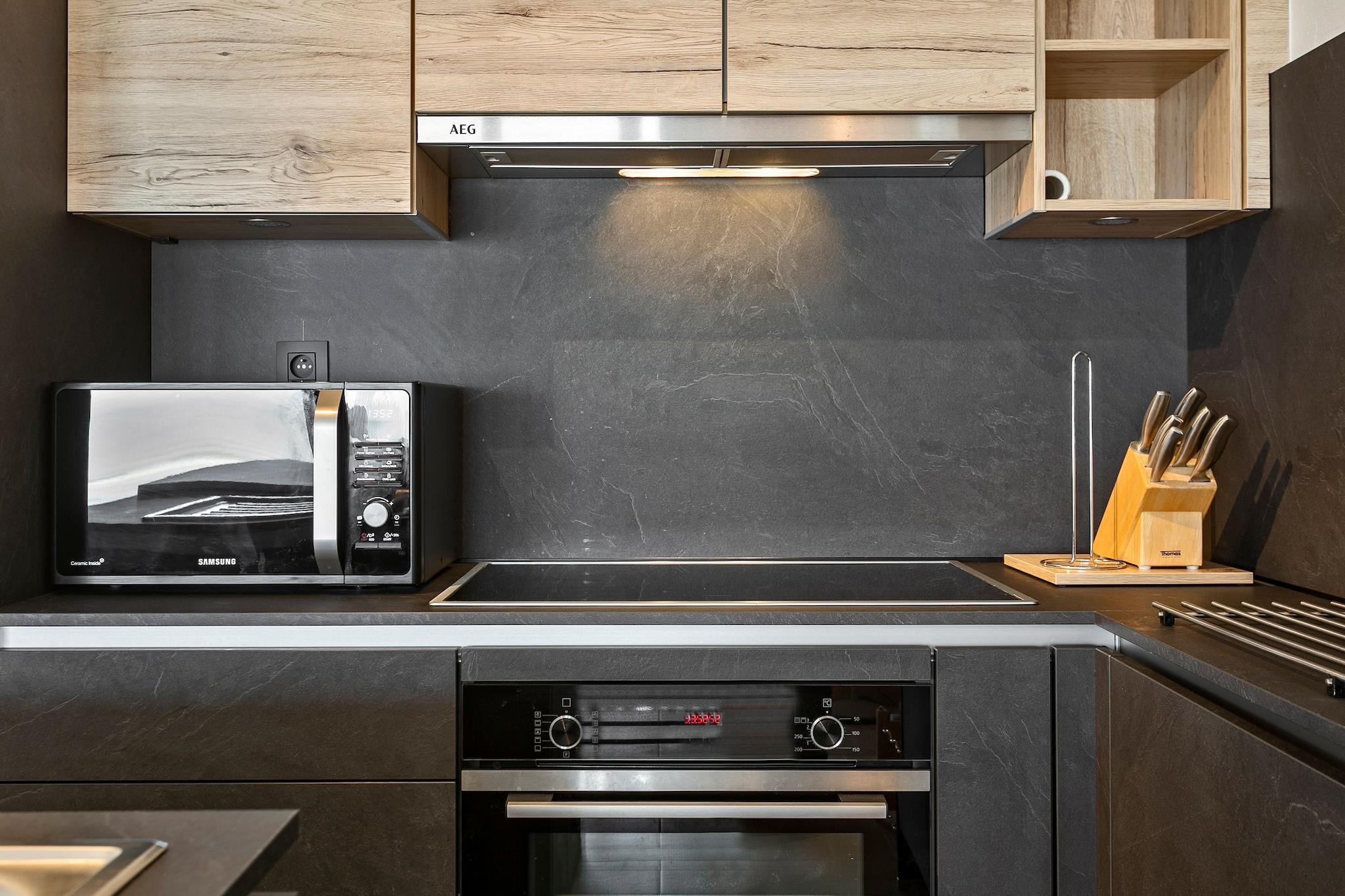 På 5. etage: (gang(toilet), Stue(dobbeltsovesofa, Fjernsyn, spisebord, sofahjørne, DVD-afspiller), Køkken(kogeplade(elektrisk), elkedel, brødrister, emhætte, kaffemaskine, ovn, mikrobølgeovn, opvaskemaskine , køle-fryseskab), soveværelse(dobbeltseng(180 x 200 cm), Fjernsyn), soveværelse(dobbeltseng(160 x 200 cm)), badeværelse(badekar, bruser, håndvask, håndvask, føntørrer)) tørretumbler, vaskemaskine, balkon eller terrasse, varme(gas), elevator, strygebræt, strygejern