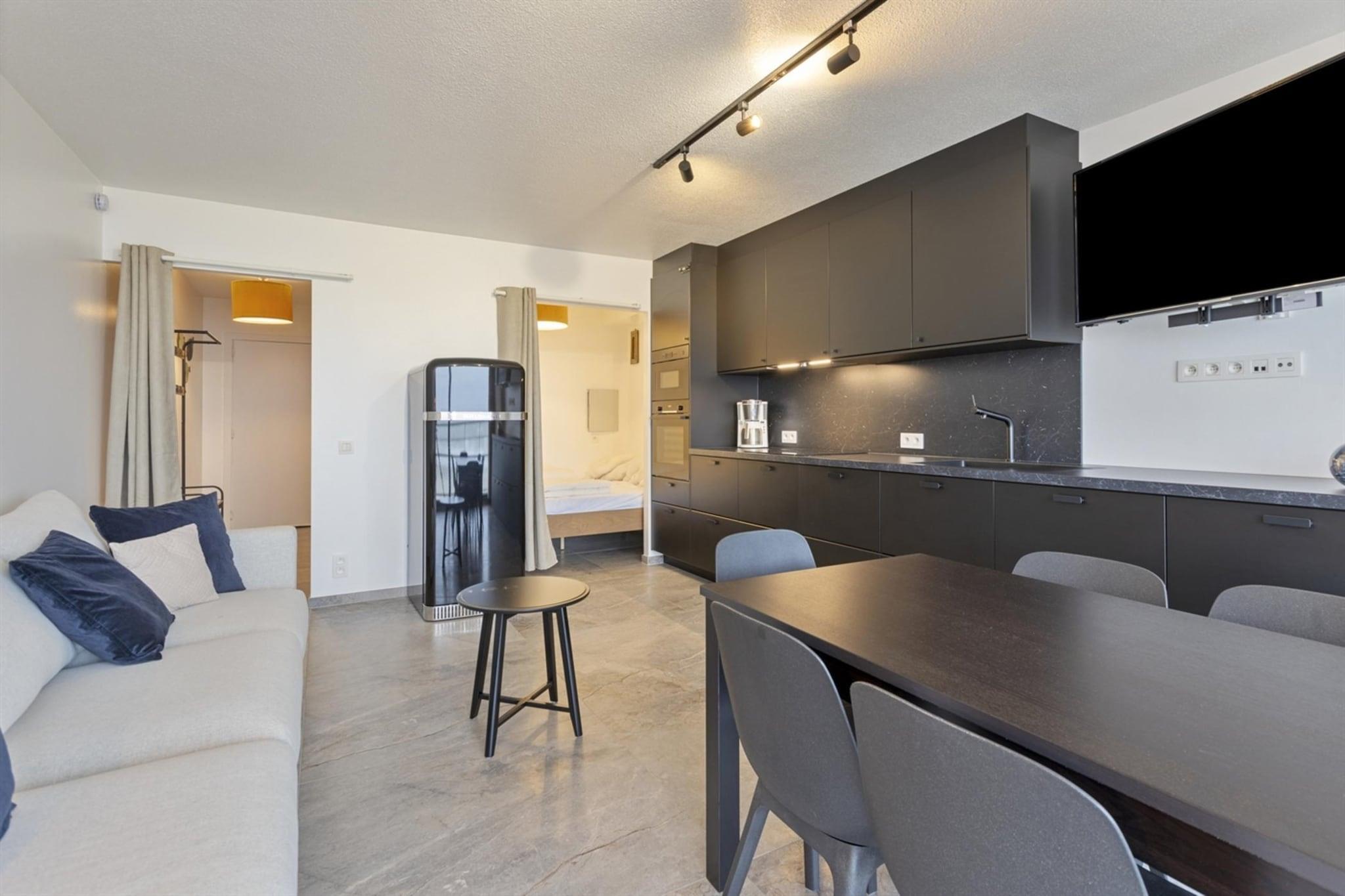 På 2. etage: (Stue(dobbeltsovesofa, Fjernsyn(digital, Smart-TV), spisebord), Køkken(kogeplade(induktion), kaffemaskine, ovn, mikrobølgeovn, opvaskemaskine , køle-fryseskab), soveværelse(dobbeltseng(140 x 200 cm)), badeværelse(bruser(Walk-in-bruser), håndvask, toilet)) Internetadgang, terrasse, elevator