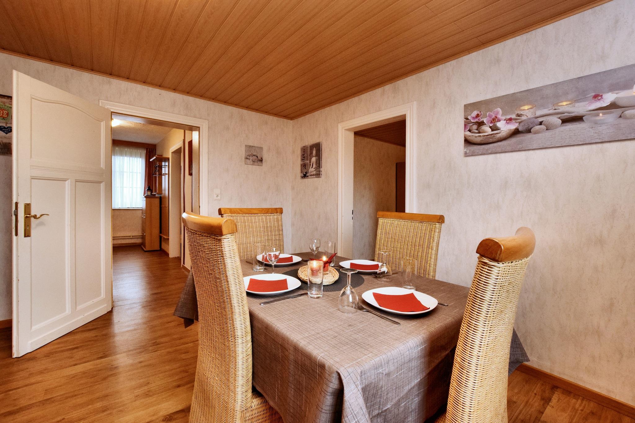 Nyd fuldstændigt privatliv blandt grønne græsgange i dette rummelige 4-værelses feriehus i Gouvy, perfekt til en stor familie eller gruppe på op til 8 gæster. Slap af i den private sauna eller nyd naturskønne måltider på balkonen. Skoven, kun 100 m væk, er perfekt til lange gåture, mens der er mulighed for langrend 5 km fra ejendommen. Indendørs byder hjemmet på et hyggeligt opholdsrum til indendørs spil, mens du udendørs finder en solrig terrasse, en stor have og en grillplads, fantastisk til afslappende eftermiddage. En indhegnet dam tilføjer charme til udendørsrummet. En børneseng og høj stol er til rådighed, hvilket gør det familievenligt. Daglige ting kan afhentes i supermarkedet 6 km derfra, og lokale restauranter ligger kun 8 km fra hjemmet. Parkering på stedet tilføjer til bekvemmeligheden og sikrer et behageligt ophold i fredelige, naturfyldte omgivelser.