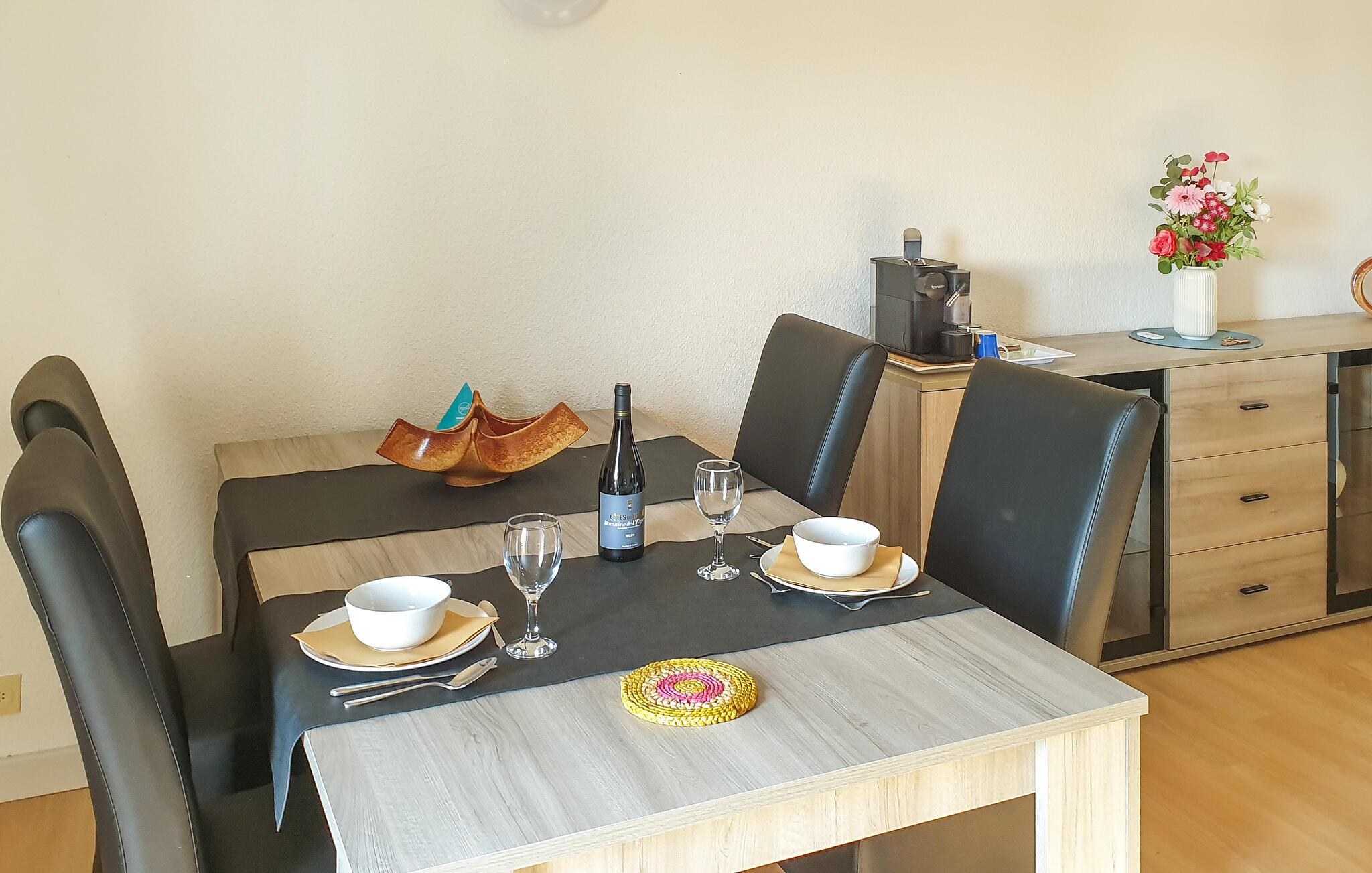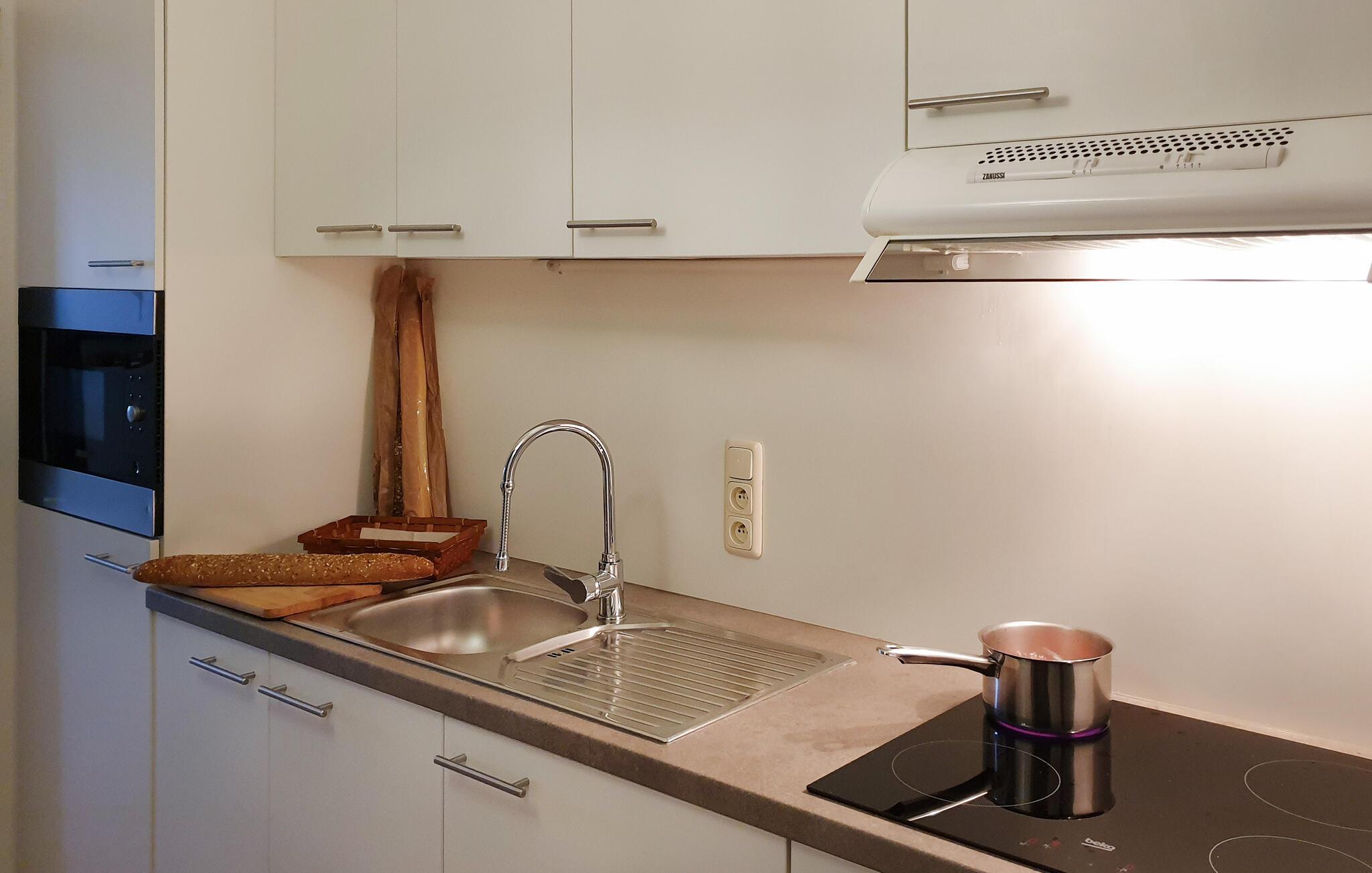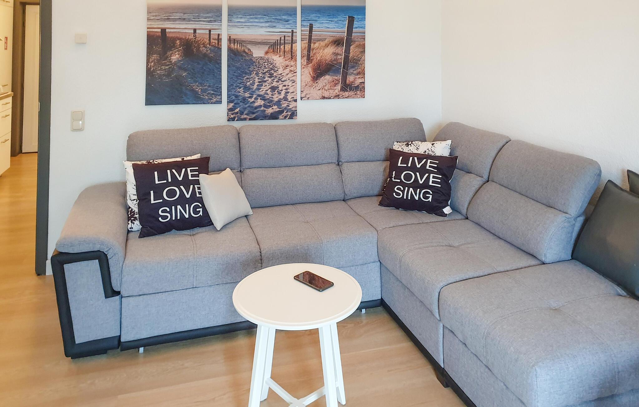 Denne charmerende og hyggelige ferielejlighed er ideel til et par eller en lille familie, der ønsker at nyde en pause i den friske havluft. Tilbered lækre måltider i det åbne køkken og nyd dem ved spisebordet. Efter en lang dag kan I synke ned i den behagelige sofa, se en film eller læne jer op i de behagelige lænestole for en stille læsestund.