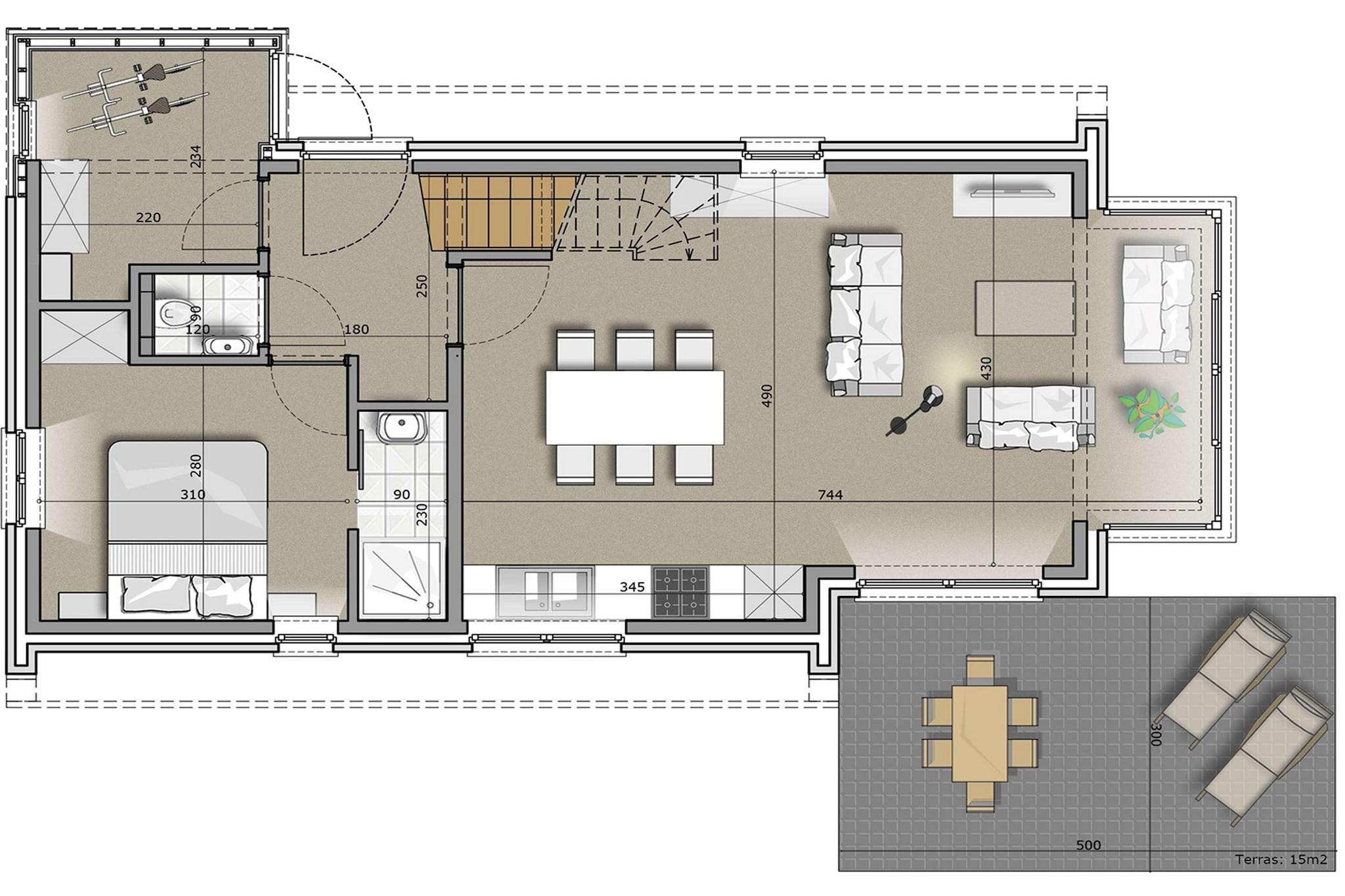 Stueetage: (entre(toilet), Stue(Fjernsyn), åbent køkken(kaffemaskine(kaffetragt), combi-mikroovn, opvaskemaskine , køle-fryseskab), Soveværelse med badeværelse(dobbeltseng, bruser, håndvask)) På 1. etage: (Soveværelse med badeværelse(dobbeltseng eller 2 enkeltsenge Senge, bruser, håndvask), Soveværelse med badeværelse(dobbeltseng eller 2 enkeltsenge Senge, badekar, håndvask), Repos(toilet)) pulterkammer, tørretumbler, vaskemaskine, terrasse, have, havemøbler, solstole