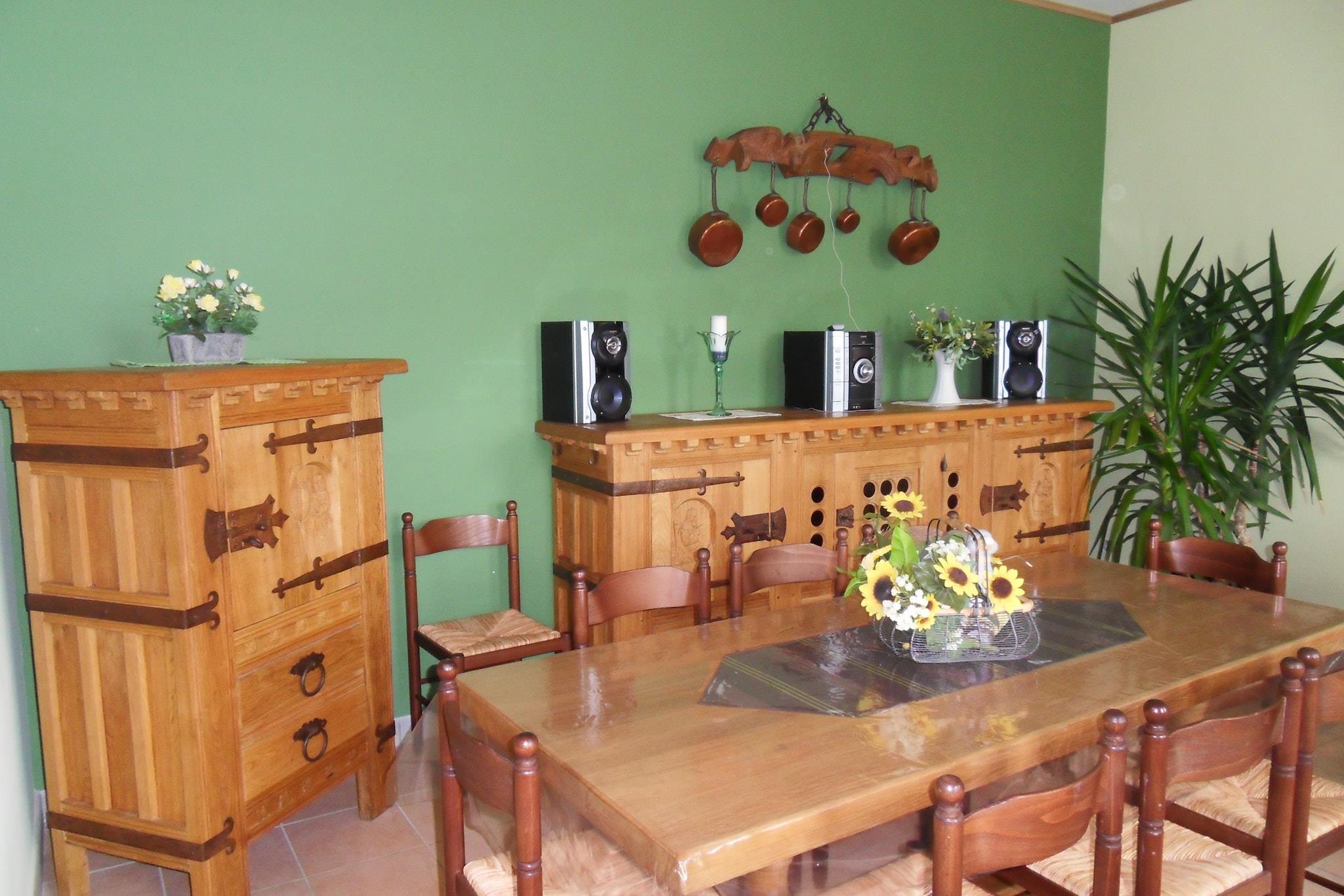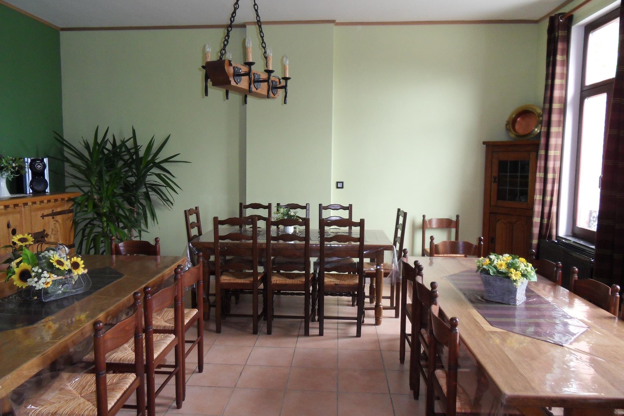 Dette luksuriøse 7-værelses feriehus i Cul-des-Sarts er perfekt til store grupper på op til 26 personer. Omgivet af fredfyldt natur tilbyder det rigelig indendørs og udendørs plads til familier og venner til at slappe af, genoprette forbindelsen og nyde kvalitetstid sammen. Beliggende kun 1 km fra både skoven og byens centrum, er dette hjem ideelt placeret for dem, der elsker vandreture, vandreture i naturen og kulturelle udforskninger. Indenfor har det veludstyrede køkken moderne apparater, herunder en mikrobølgeovn, brødrister, ovn og kaffemaskine, ideel til at tilberede gruppemåltider. Det indbydende opholdsområde har en hyggelig pejs og privat bar, hvilket gør det til det perfekte samlingssted på kølige aftener. Udenfor kan du nyde den rummelige have og terrasse med en grillplads, legeredskaber til børn og en boulebane til afslappet sjov. Bliv aktiv med det in-house fitnessudstyr eller slap af i de fredelige omgivelser. Dette kæledyrsvenlige hjem inkluderer også væsentlige ting som gratis WiFi, en høj stol og en barneseng, hvilket sikrer et behageligt og bekvemt ophold for alle aldre.