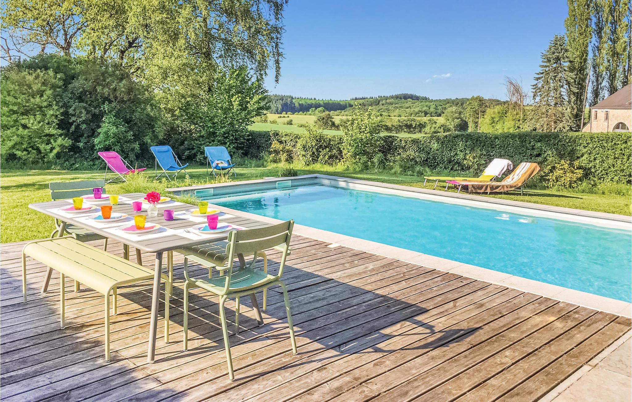 I den mindste by i de Belgiske Ardenner ligger dette feriehus som et skønt udgangspunkt for udflugter. Der er plads til otte gæster fordelt på tre soveværelser og med adgang til to badeværelser. Nyd den skønne udendørs pool og den flotte panoramaudsigt over kulturlandskabet. Tag hunden med på ferie og tag på cykel- og vandreture i omgivelserne. I løbet af ferien kan det anbefales at sejle i kano på Ourthe og at afslutte dagen med at drikke øl i et af de traditionsrige øl bryggerier i Durbuy. Grupper af unge under 30 år er ikke tilladt.