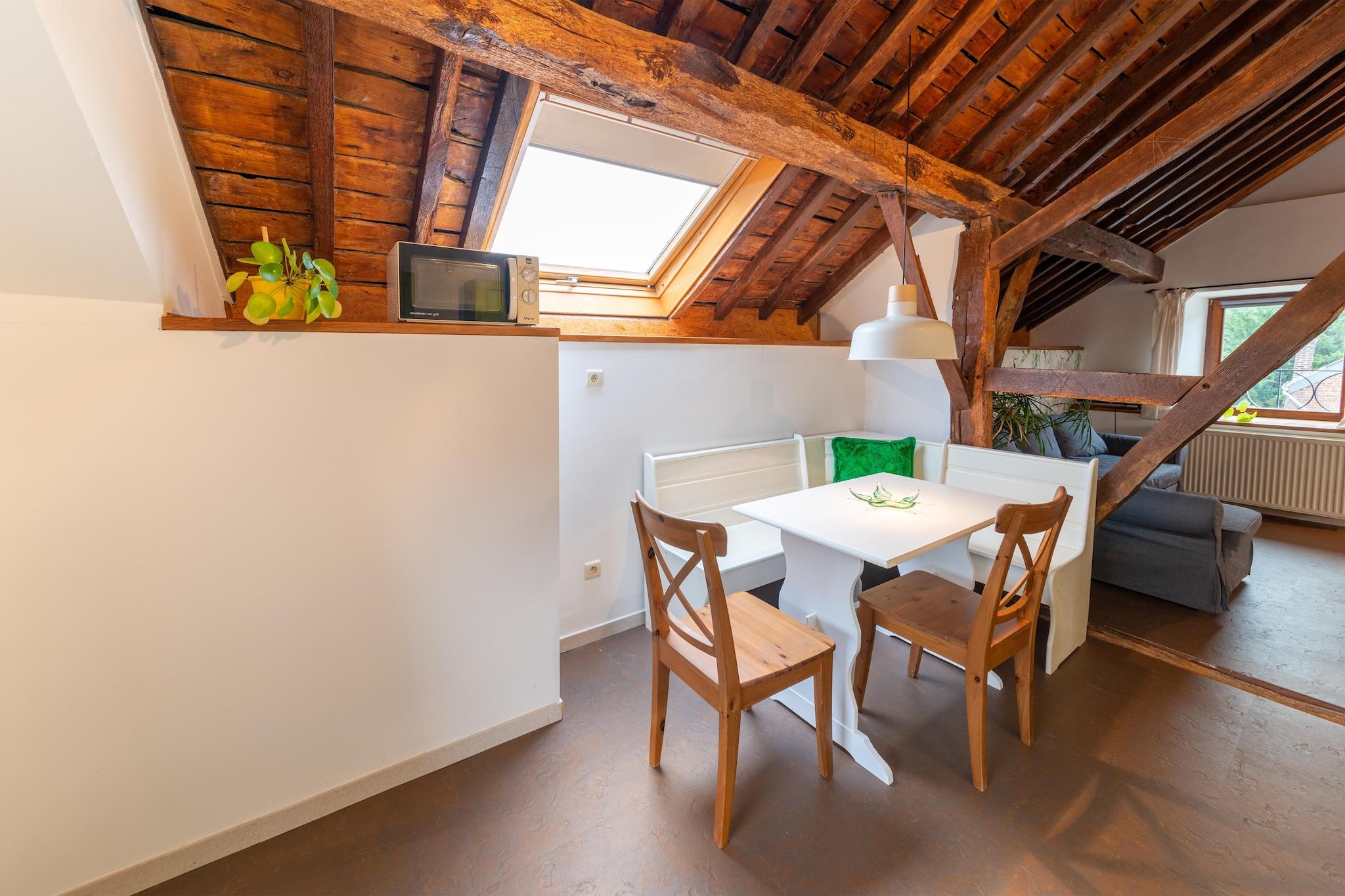 Denne hyggelige lejlighed i loftstil i Esneux tilbyder en fredelig flugt kun få skridt fra Ourthe-floden og de omkringliggende skovstier. Beliggende på anden sal er det ideelt for par eller små familier, der søger natur og afslapning. Nærliggende attraktioner omfatter Grottes de Comblain, Centre de la Chauve-Souris og dyreparken Monde Sauvage d'Aywaille. Til dagsture kan du udforske den charmerende by Durbuy eller slappe af i den termiske by Spa. Lejligheden har en lys stue med dobbeltseng, sovesofa og tv samt et fuldt udstyret køkken med ovn, kaffemaskine og køleskab med fryser. Et galleri soveværelse og mezzanin tilbyder ekstra soveplads med to enkeltsenge. Badeværelset har bruser og håndvask, og der er separat toilet. Gæsterne kan nyde centralvarme, cykelopbevaring og adgang til en fælles privat swimmingpool - perfekt til sommerophold. Esneuxs kulinariske scene er lige så indbydende. Spis på raffineret belgisk køkken på L'Olivier des Sens, nyd italienske smagsoplevelser på La Vita e Bella, eller nyd charme ved floden på Le Châtillon. Uanset om du er på vandretur, sightseeing eller slapper af ved poolen, er denne hems en perfekt base for dit Ardenn-eventyr.