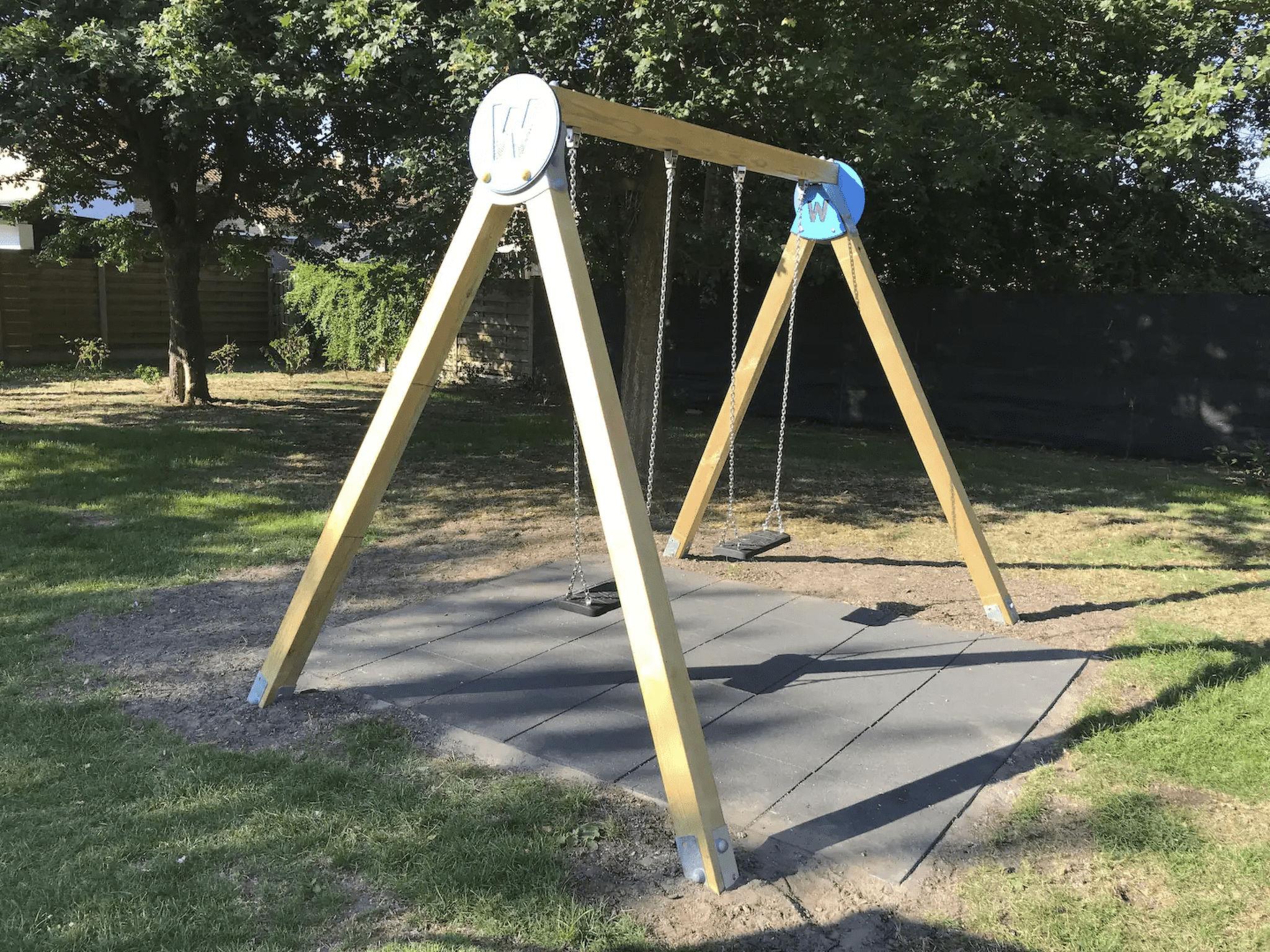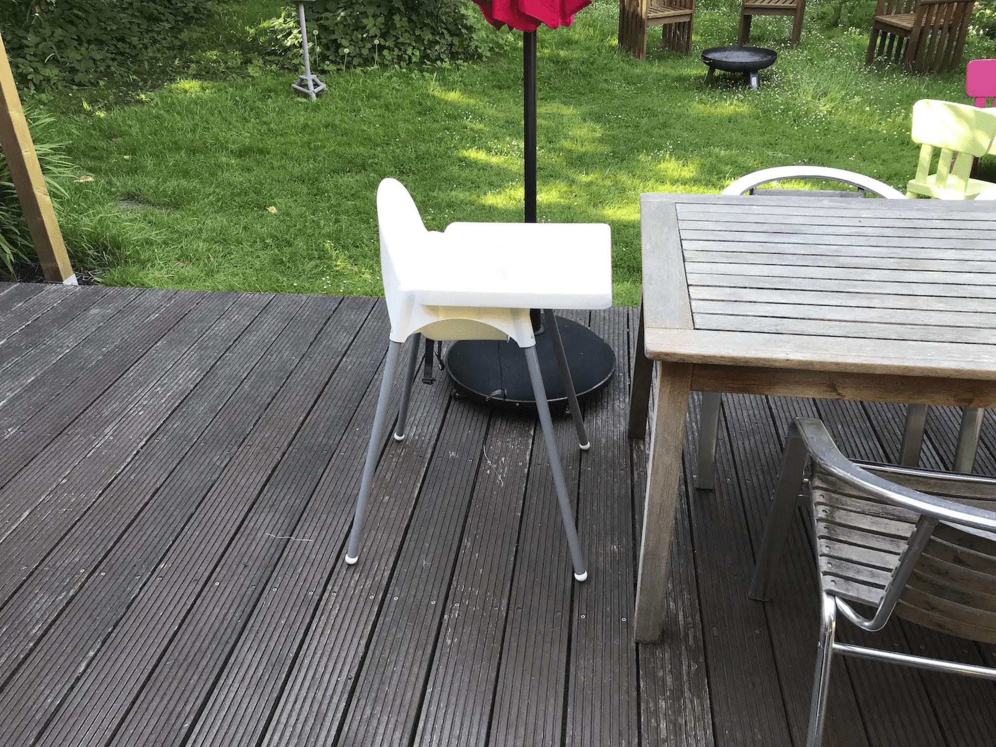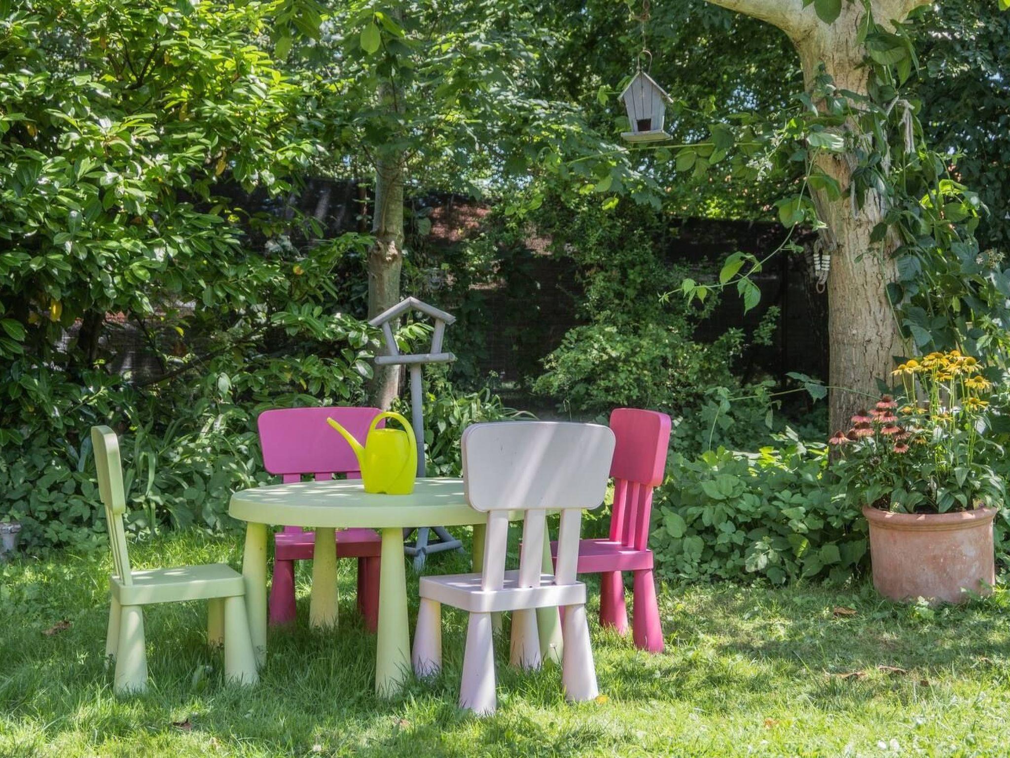 An enclosed garden with high chairs and a swing in a quiet garden area, next to a playground of 2000 square meters (basket, football, lawn, playground equipment).