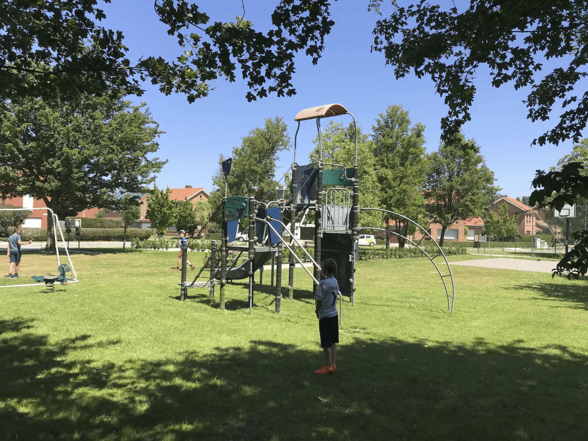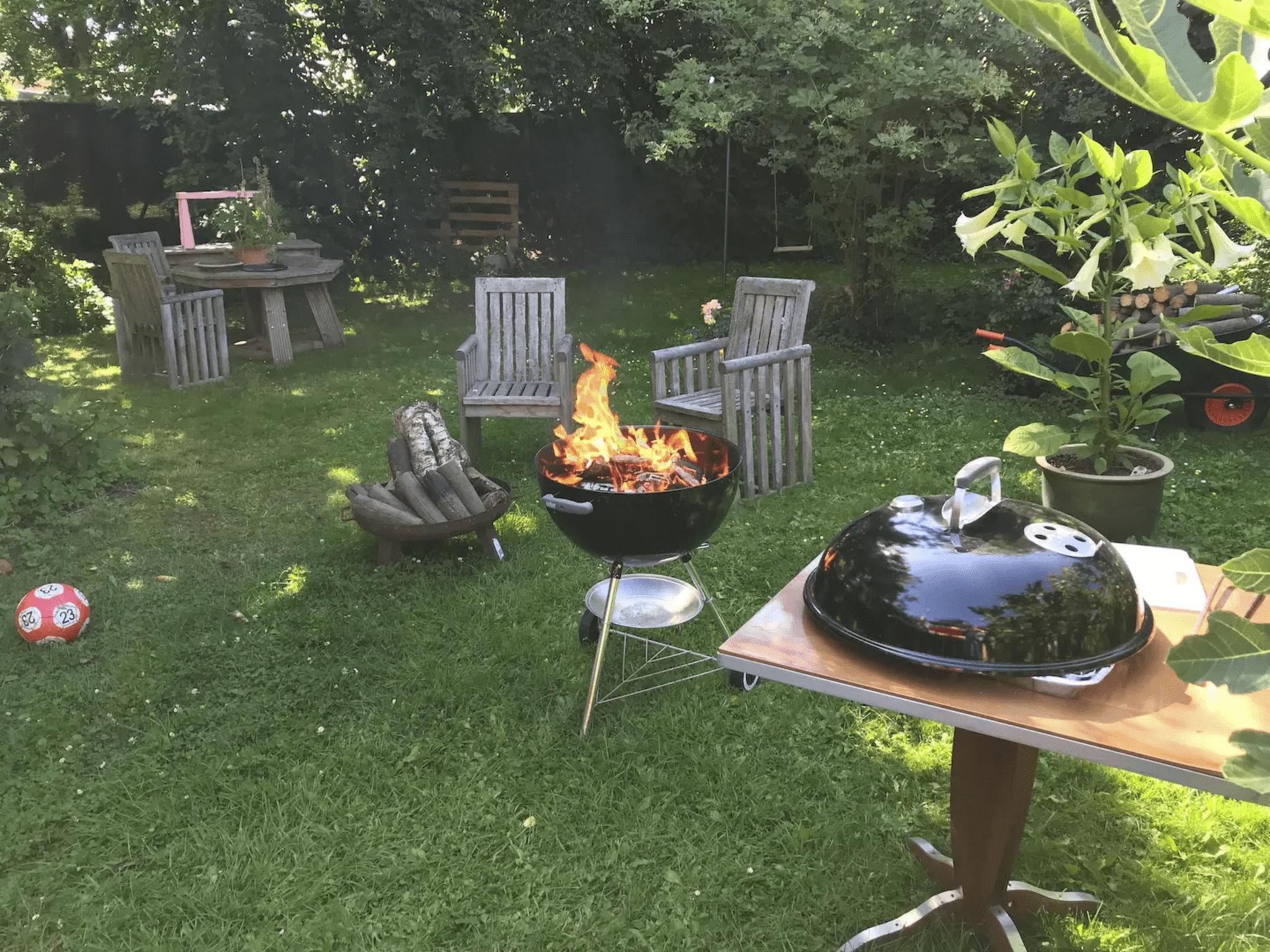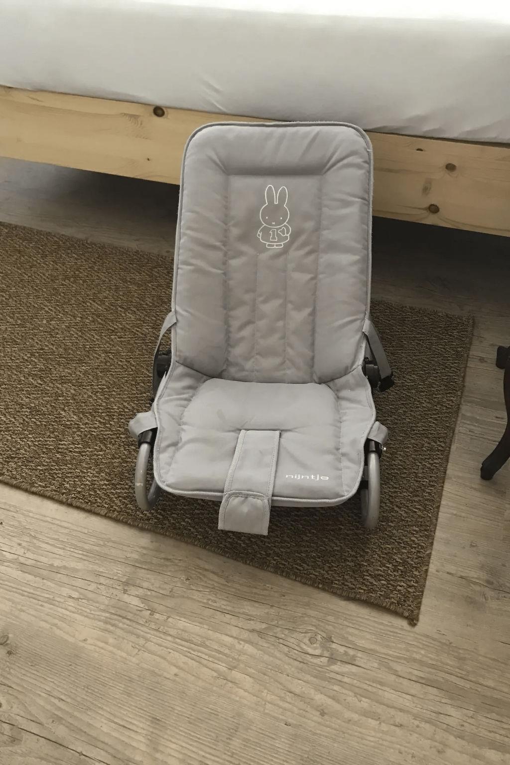 An enclosed garden with high chairs and a swing in a quiet garden area, next to a playground of 2000 square meters (basket, football, lawn, playground equipment).