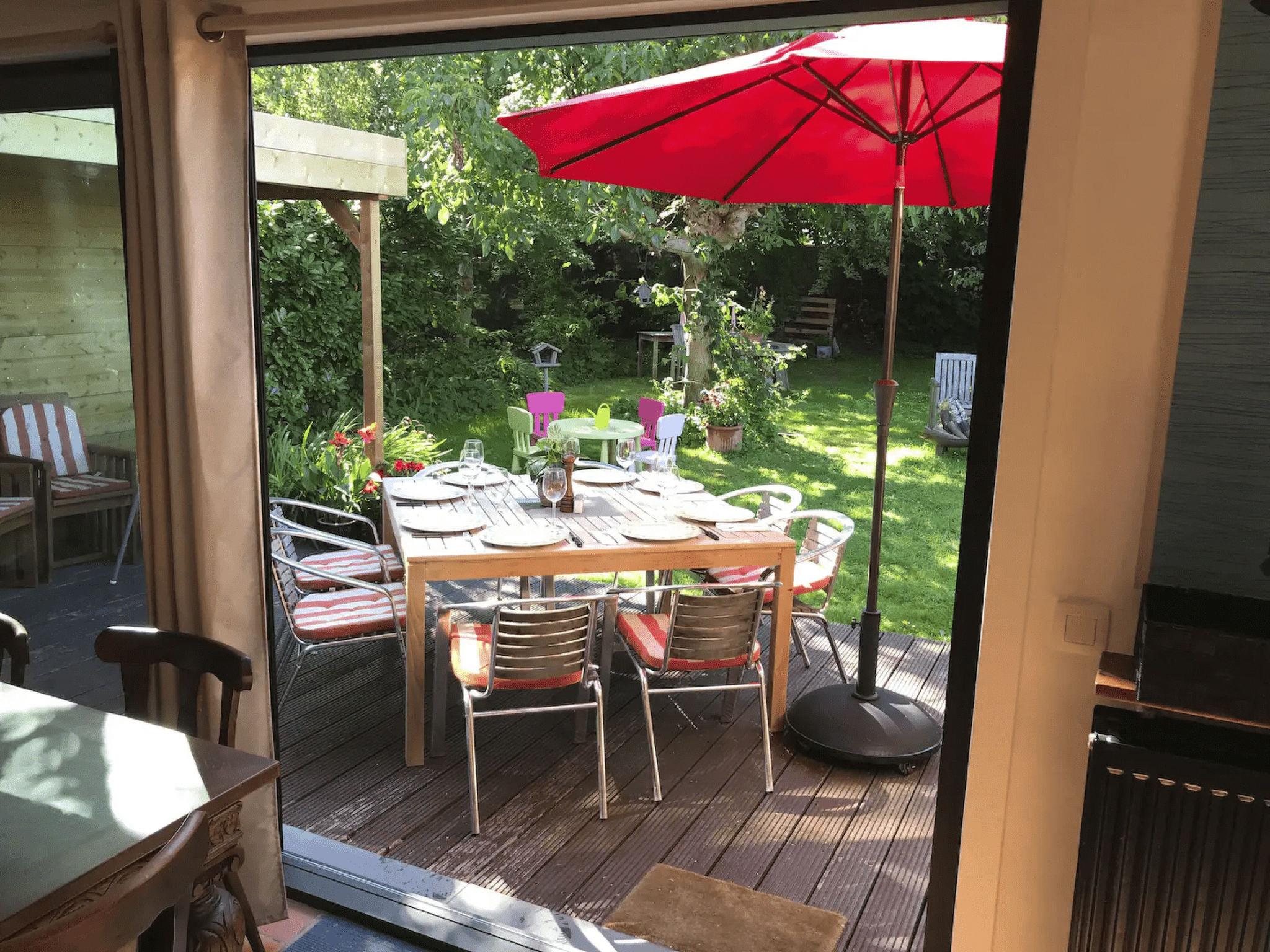 Wooden, partly covered terrace adjacent to the house with outdoor sauna for 5 people (can also be used in winter).