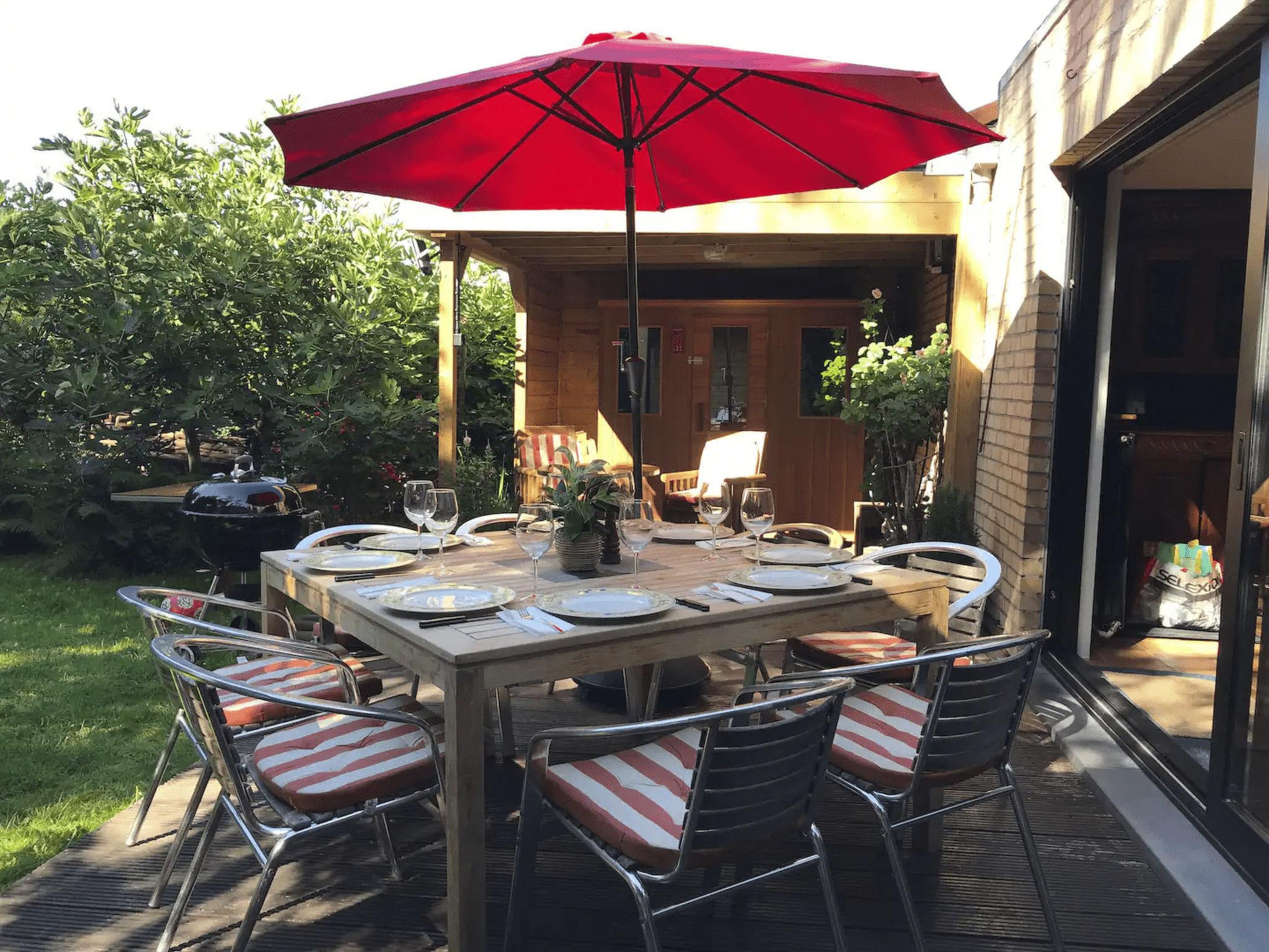 Terrace with dining area, garden furniture, sun loungers, parasol and fire pit.