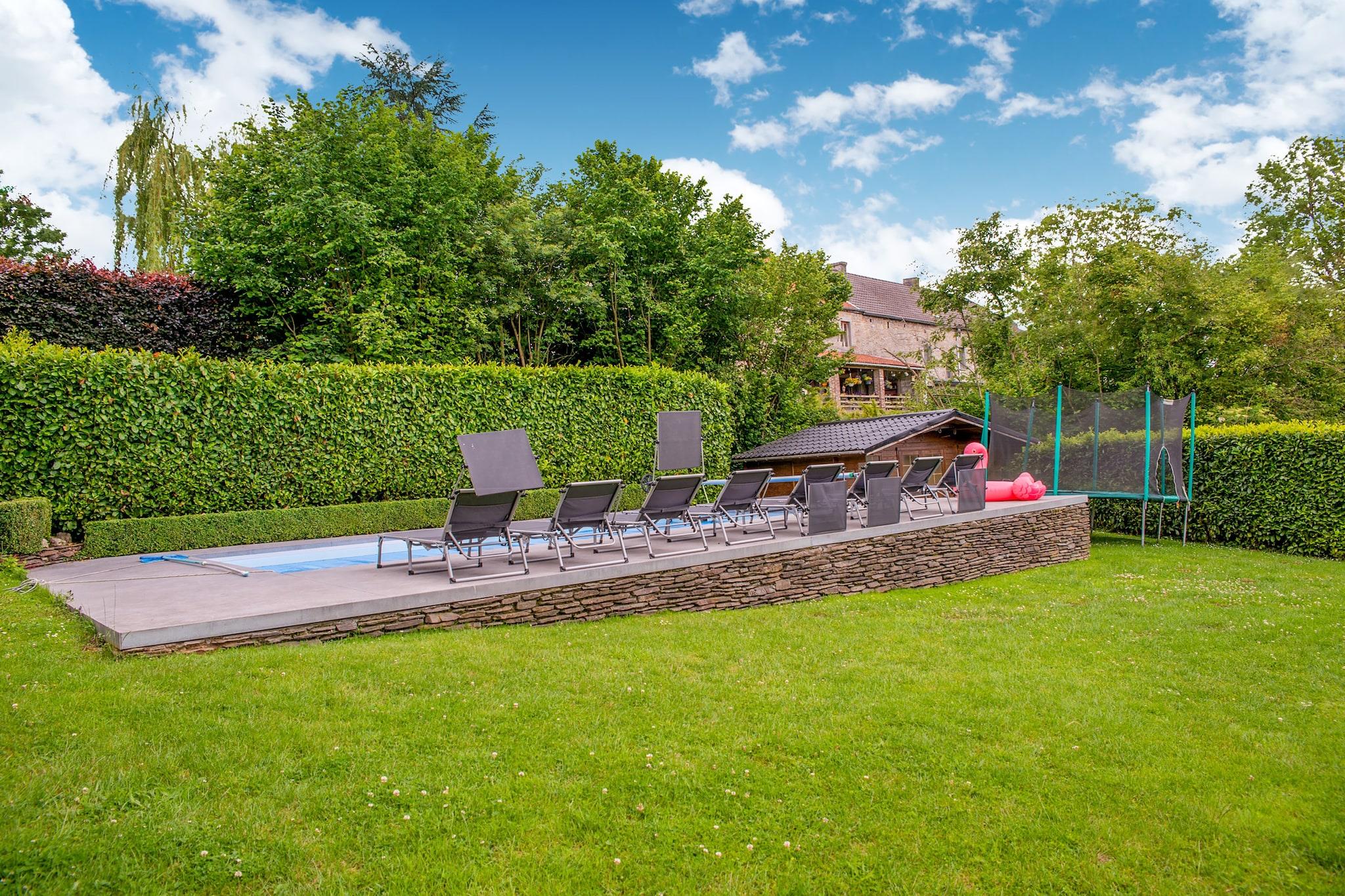 Dette hyggelige feriehus i Hamoir-Filot tilbyder et fredeligt tilflugtssted for familier, kun 2,7 km fra byens centrum og omgivet af Ardennernes frodige landskaber. Med nem adgang til togstationen og Liège Lufthavn er det en god base for at udforske nærliggende attraktioner som Grotte de Comblain, Lassus Slot og den spændende Adventure Valley Durbuy. Naturelskere vil nyde skovture og kajaksejlads på Ourthe-floden. Ejendommen har en varm stue, spiseplads og et åbent køkken udstyret med både filter- og padkaffemaskine, ovn, mikrobølgeovn, et andet køleskab og opvaskemaskine. Med fire soveværelser og to badeværelser - det ene med badekar - er der komfortabel plads til familier. Et vaskerum med fryser og vaskemaskine gør det nemt. Udendørs kan du nyde en privat opvarmet pool (åben juni-september), terrasse, have, grill, trampolin, gynge og legeredskaber. En barneseng, højstol og kravlegård gør det børnevenligt. Det er strengt forbudt at bruge feriehusets elektriske installationer til opladning af et elbil eller til at tilslutte et mobilhome, campingvogn eller varevogn. Området byder på fremragende spisemuligheder. Le Clapotis ligger kun 2,6 km væk og serverer belgisk køkken ved floden. For italienske smagsoplevelser kan du prøve L'entre mets toi, og for en afslappet caféstemning er La Cafet'Arya i det nærliggende Durbuy en favorit. Uanset om du vandrer, er på sightseeing eller nyder familietid ved poolen, er dette hjem et perfekt Ardenner-flugtmåltid. Bemærk: Affaldssortering er obligatorisk, og der gælder bøder for manglende overholdelse. En detaljeret sorteringsvejledning vises over skraldespandene til din reference.