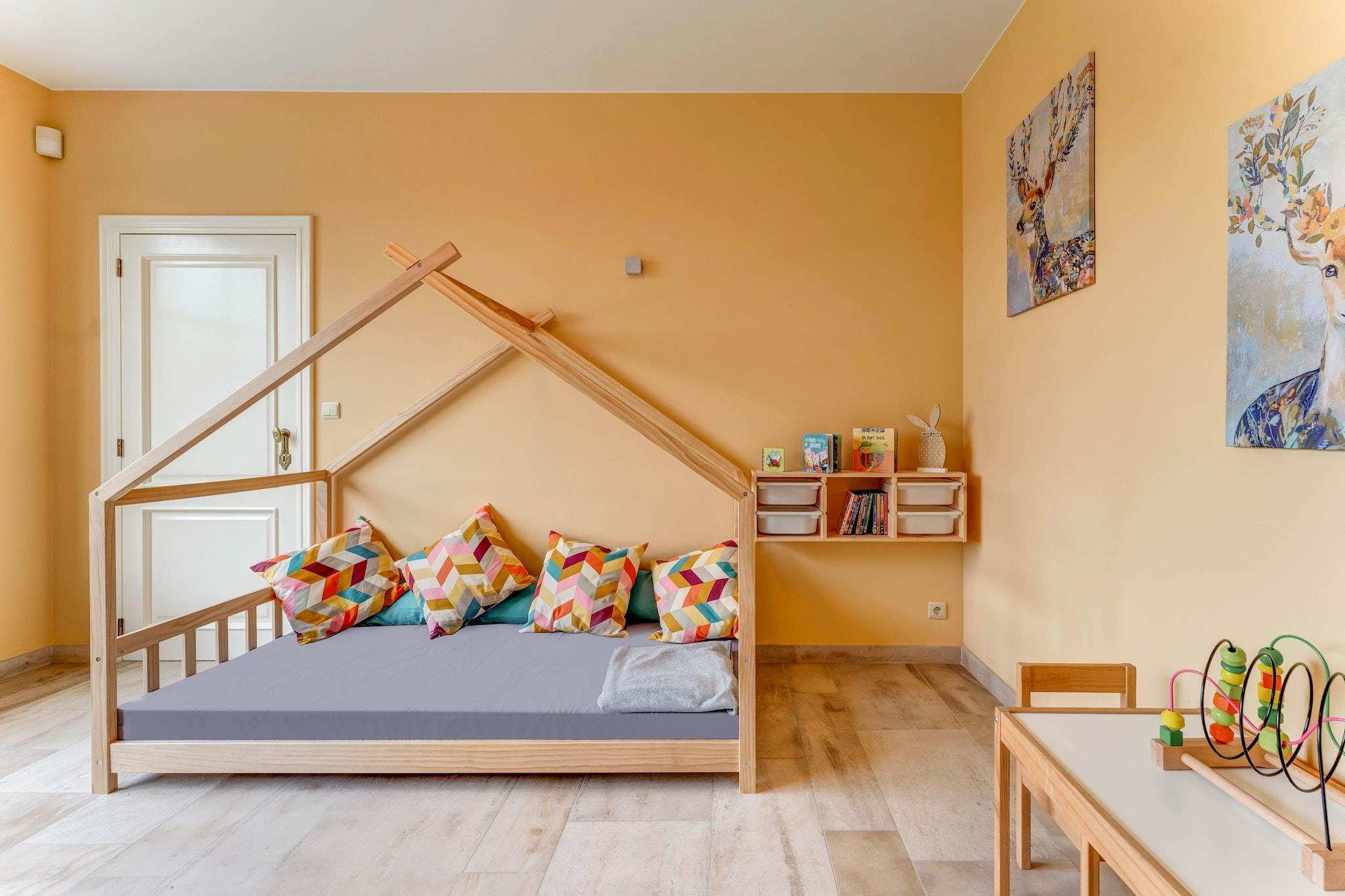 Stueetage: (entre, Køkken, stue / spisestue(Fjernsyn, spisebord, hyggepejs, sofahjørne, radio), toilet, legeværelse(Fjernsyn, sofahjørne, hyggespil), opholdsrum(legeredskaber, bordfodbold, hyggespil, legetøj), pulterkammer(fryser, tørretumbler, vaskemaskine)) På 1. etage: (entre(dobbeltsovesofa), soveværelse(enkeltseng, enkeltseng, køjeseng), soveværelse(enkeltseng, enkeltseng), Soveværelse med badeværelse(dobbeltseng, badekar, bruser), badeværelse(bruser, toilet)) tremmeseng, Bubble bath(udendørs), sauna(privat), patio, terrasse(privat), have, parkering, Parasol, Puslepude, legeredskaber, barnestol, baby crib(free)