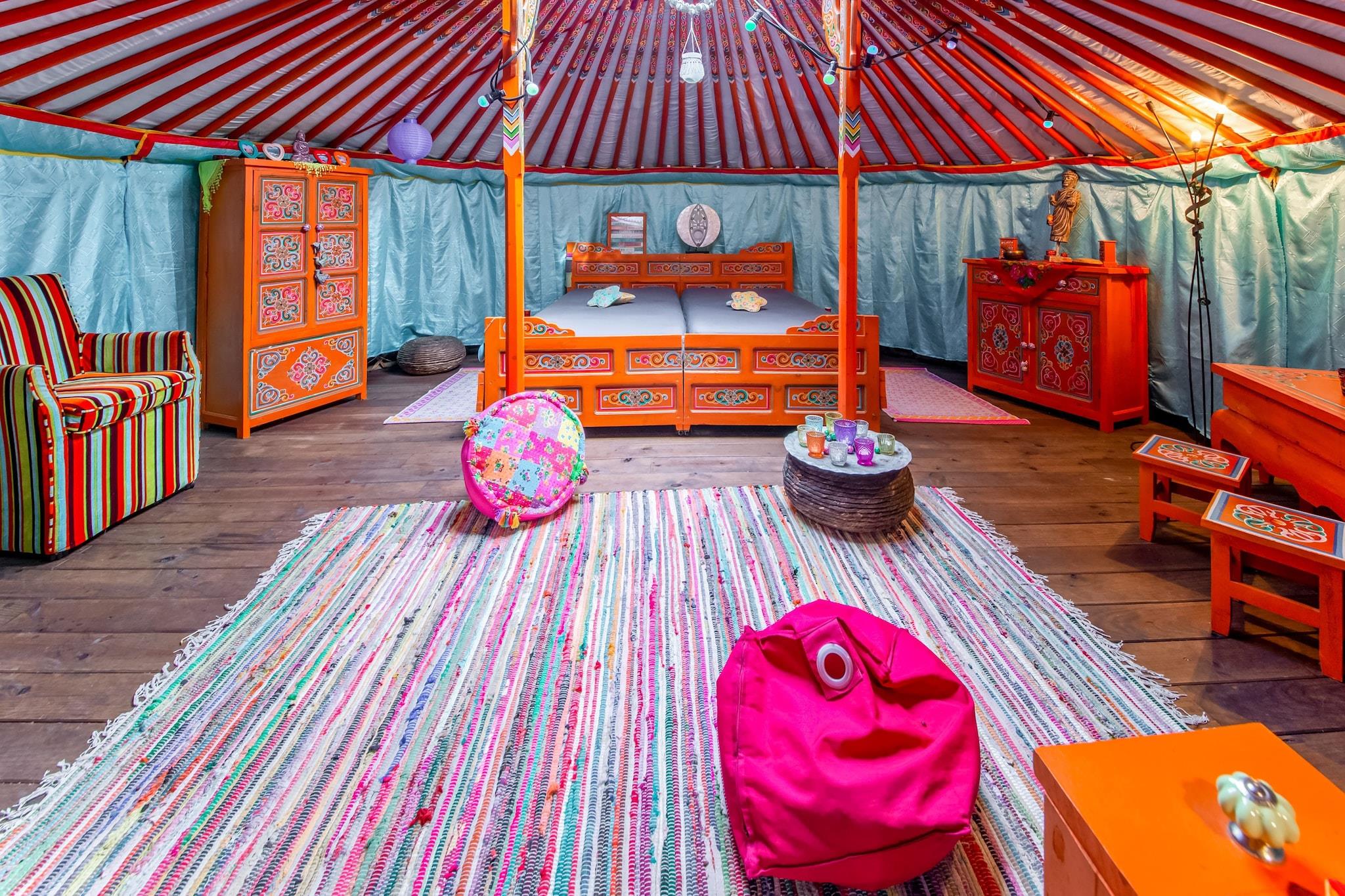 Den mongolske yurt lejes kun ud mellem maj og september. Denne 100% autentiske mongolske yurt med tilhørende møbler blev købt af et mongolsk par, der arbejdede med import-eksport. Det tilbyder gæsterne originalitet, ægthed og en velkommen ændring af landskabet med stor opmærksomhed på frihed. Den indeholder ikke det moderne bekvemmeligheder fra det 21. århundrede, men en unik, uforglemmelig oplevelse. Den mongolske yurt er ideel for naturelskere og eventyrere takket være mange sjove aktiviteter i området. Følg den barfodede sti og nyd en smuk rute, der tager dig 3 km langs de smukkeste steder. Det fælles område (delt med gæster fra den mongolske yurt, en hytte og de autentiske campingvogne) er udstyret med en trampolin, en sandkasse, en bålplads, en hængekøje, spil og en kiosk. Der er mange dyr på ejendommen, herunder geder, æsler, kyllinger, hjorte, en hane og fjerkræ. Ved siden af yurten er et lille hus med mere moderne faciliteter og en sovesofa til 2 personer. Yurten består af et stort rum omdannet til et meget behageligt soveværelse med autentiske møbler, som stort set blev købt sammen med yurten. Fordi yurten er autentisk, er der ingen vinduer i taget eller i væggene. Af hensyn til ægtheden er der kun tørre toiletter. Der er ingen WiFi.