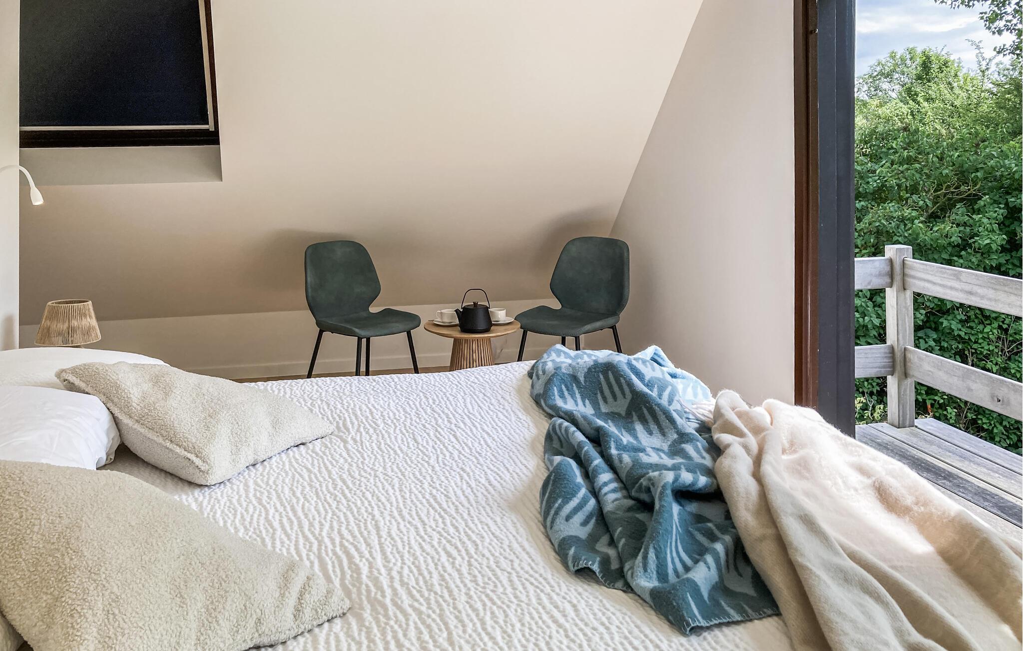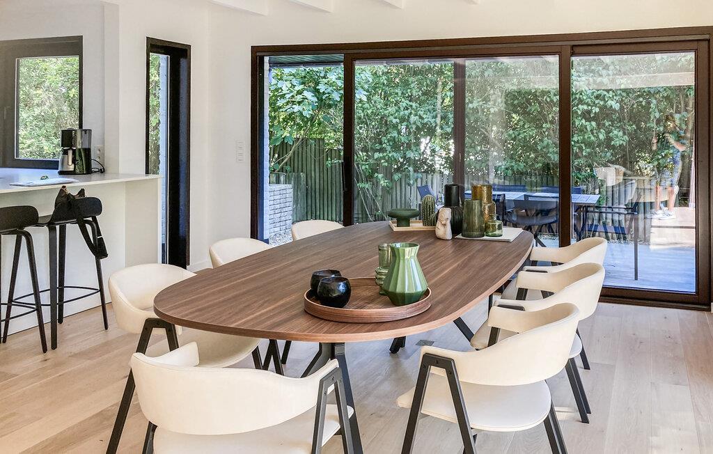 Glæd jer til nogle afslappende dage i jeres moderne og indbydende feriehus, der tilbyder de ideelle rammer for jeres næste ferie. Den lyse opholdsstue med store vinduer forbinder stue, spisestue og køkken for at skabe en åben planløsning. Læn jer tilbage i den stilfulde sofa, læs en bog eller nyd samtaler med familie eller venner. Det elegante spisebord med komfortable stole lægger op til at nyde måltider sammen. Tilbered jeres yndlingsretter i en afslappet atmosfære i det åbne, lyse køkken med morgenmadsbar.