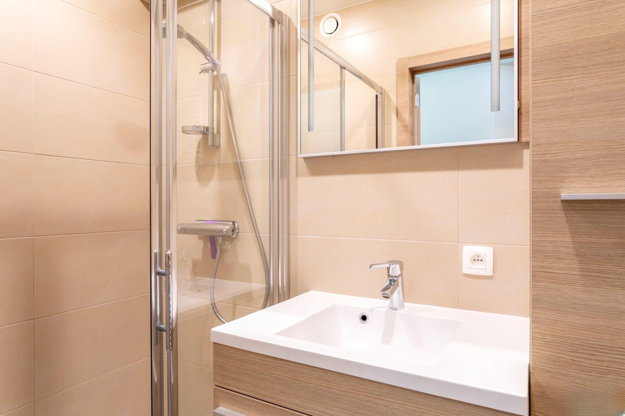 På 2. etage: (Stue(Fjernsyn(digital), spisebord, sofahjørne), åbent køkken(kogeplade(glaskeramisk), ovn, mikrobølgeovn, opvaskemaskine , køle-fryseskab), soveværelse(dobbeltseng), soveværelse(køjeseng), badeværelse(badekar, bruser, håndvask), toilet(toilet), Internetadgang, elevator) varme(central, gas), terrasse, cykelopbevaring