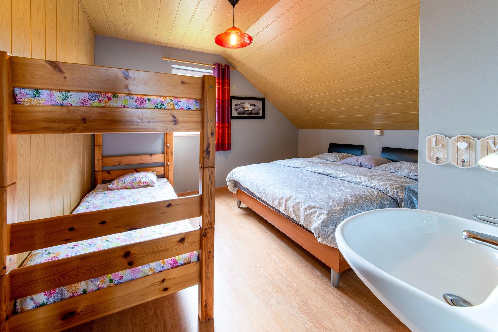 Dette charmerende feriehus i La Roche-en-Ardenne tilbyder et hyggeligt tilflugtssted for familier eller små grupper. Kun 4 km fra byens centrum og omgivet af skov, er det ideelt for naturelskere og historieinteresserede. Nærliggende attraktioner omfatter Château Féodal de La Roche, der tilbyder panoramaudsigt og falkejagtshows, Musée de la Bataille des Ardennes med WWII artefakter og den naturskønne Barrage de Nisramont til vandreture og kajaksejlads. Maboge Beach er også i nærheden til sommersvømmeture og picnics ved floden. Ejendommen har tre soveværelser, herunder et med køjeseng og håndvask, plus en enkelt sovesofa i stuen. Køkkenet er udstyret med komfur, mikroovn, opvaskemaskine og køleskab med fryser. Et opholdsrum med tv og en kælder fyldt med spil, bordtennis, bordfodbold og billard gør det perfekt til indendørs sjov. Brændevarme, terrasse, have, grill og legeredskaber sikrer komfort og underholdning for alle aldre. Spisemuligheder i La Roche-en-Ardenne omfatter Chez Henri for traditionelle ardennernes køkken, Signé Jeanne for generøse belgiske retter og L'Apero, der er kendt for sin hyggelige stemning og lokale smagsoplevelser.