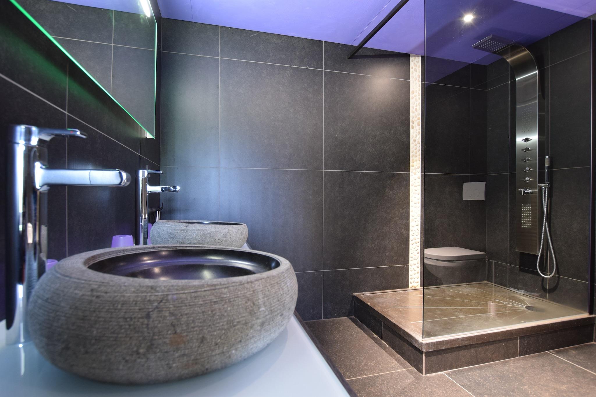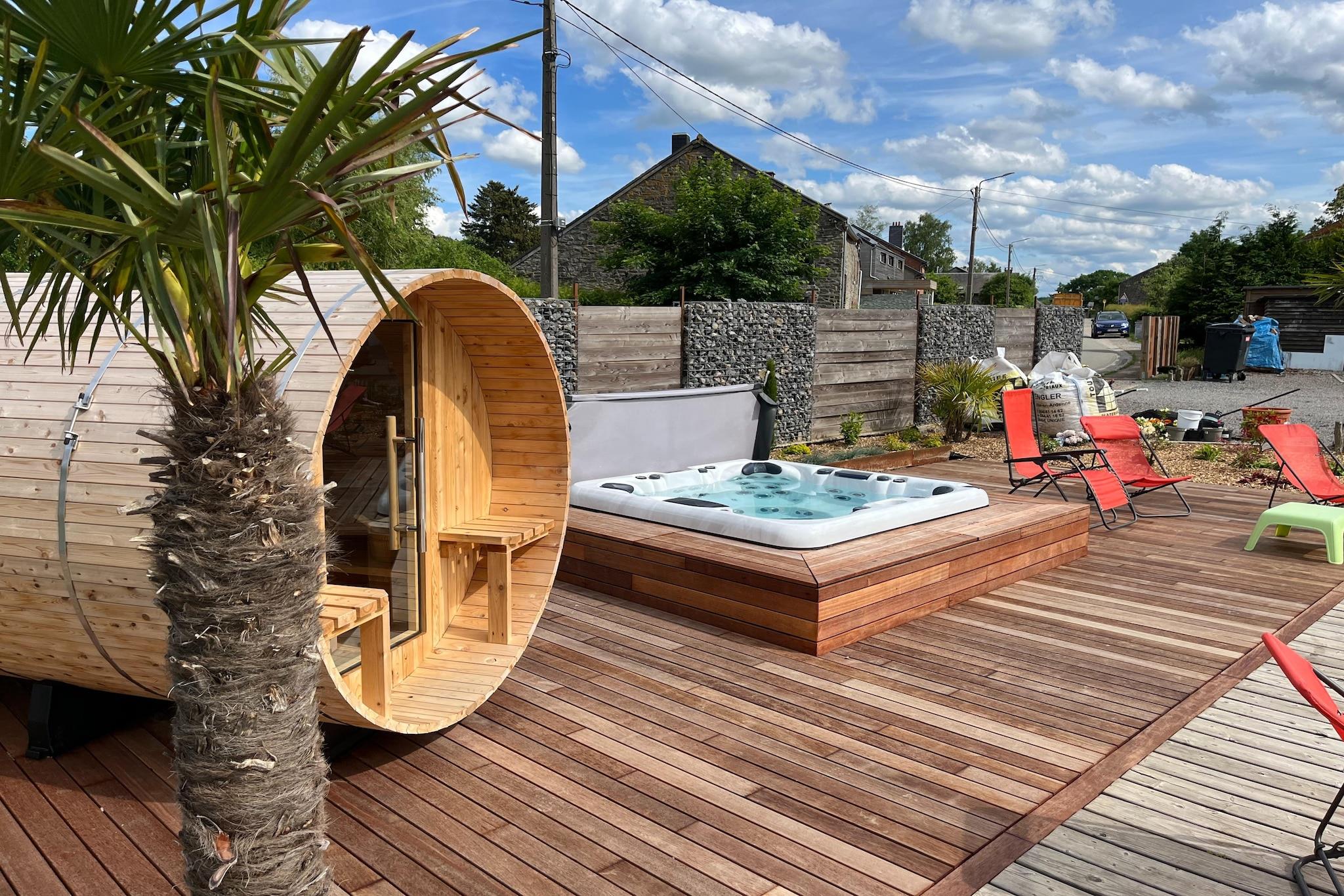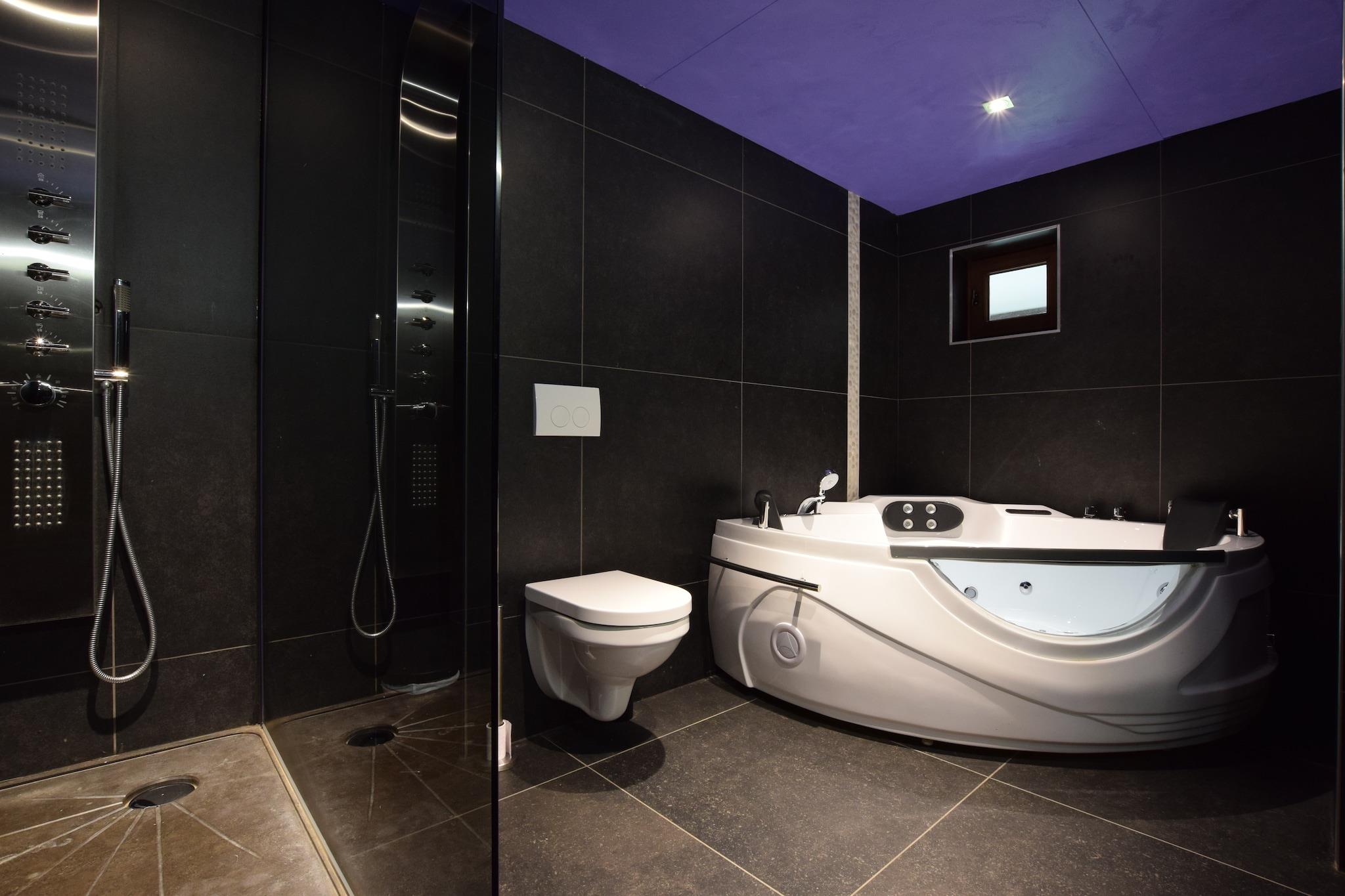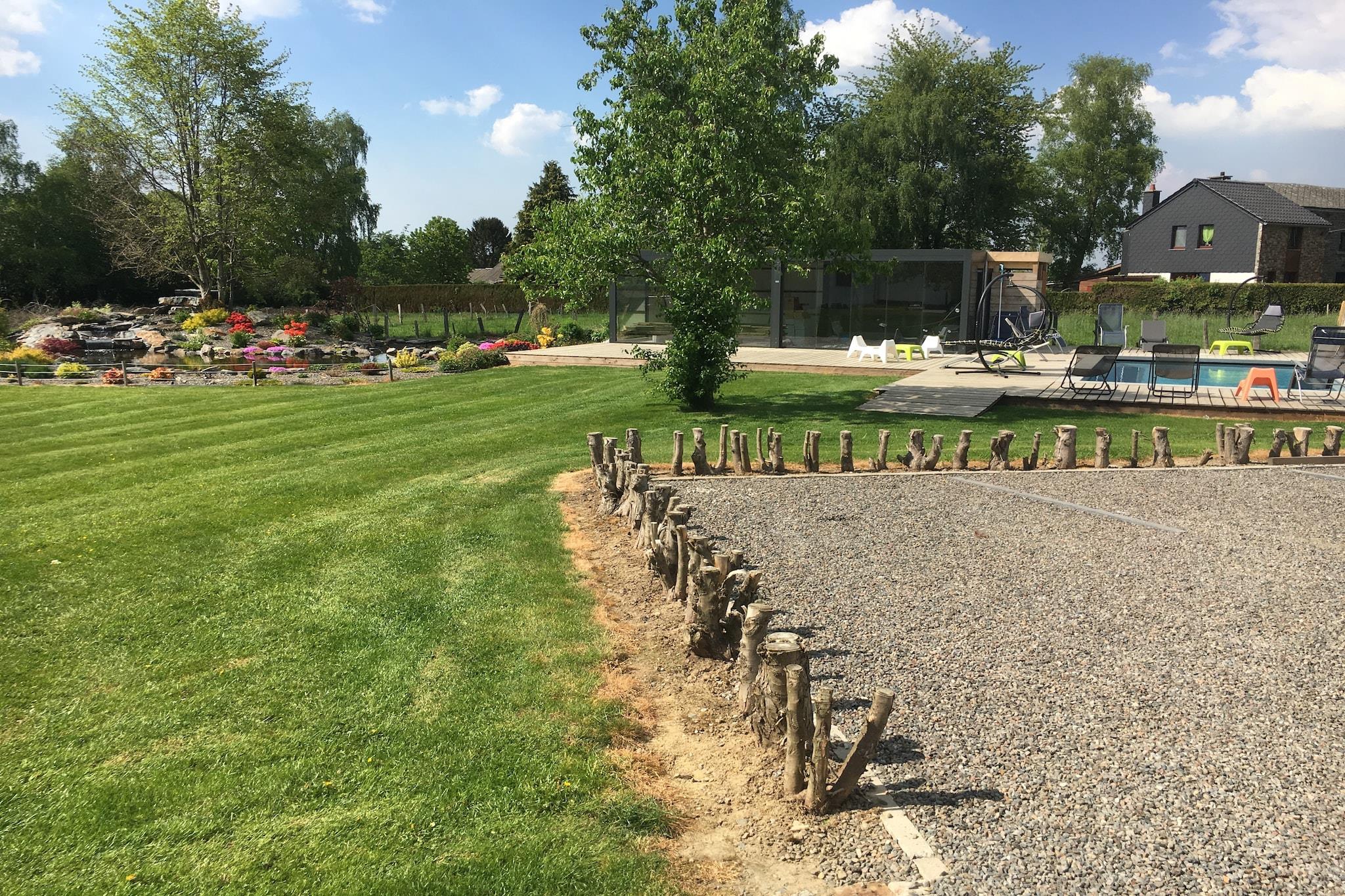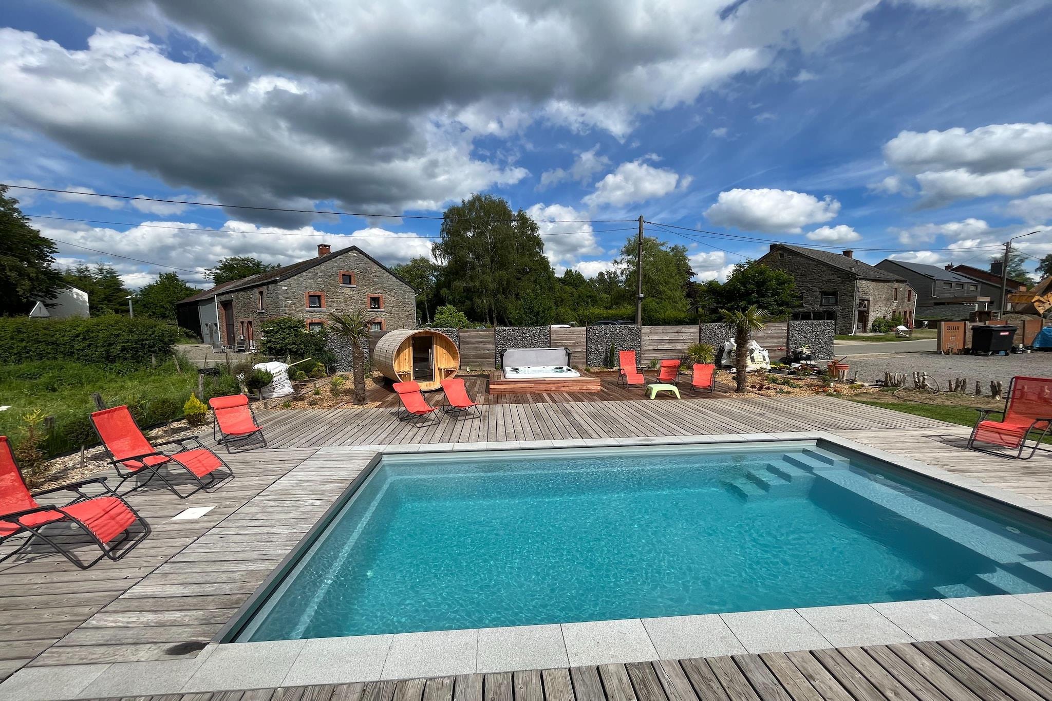 Beliggende i den fredelige landsby Hives nær La Roche-en-Ardenne, er denne rummelige villa perfekt til store familier eller grupper, der søger komfort og natur. Kun 3 km fra byens centrum og omgivet af skov, tilbyder det nem adgang til topattraktioner såsom Château Féodal, Slaget ved Ardennerne-museet og den naturskønne Barrage de Nisramont til kajaksejlads og vandreture. Parc à Gibier og Maboge Beach byder også på sjov for alle aldre. Villaen har syv soveværelser, mange med en-suite badeværelser og balkoner, herunder værelser med spabade og køjesenge til børn. Det store køkken er udstyret med to komfurer, ovne, opvaskemaskiner og køle-fryseskabe, mens opholds-/spisestuen omfatter brændeovn, digital-tv og underholdningssystem. Gæsterne kan nyde en privat opvarmet pool (apr-sep), sauna, boblebad, billard, boulebane og en overdækket terrasse med grill. En delvist indhegnet have og dam tilføjer charmen. Nærliggende spisemuligheder omfatter Chez Henri for traditionelle ardennerkøkken, Signé Jeanne for generøse belgiske retter og Restaurant L'Apéro, der er kendt for sin hyggelige stemning og årstidens smag.
