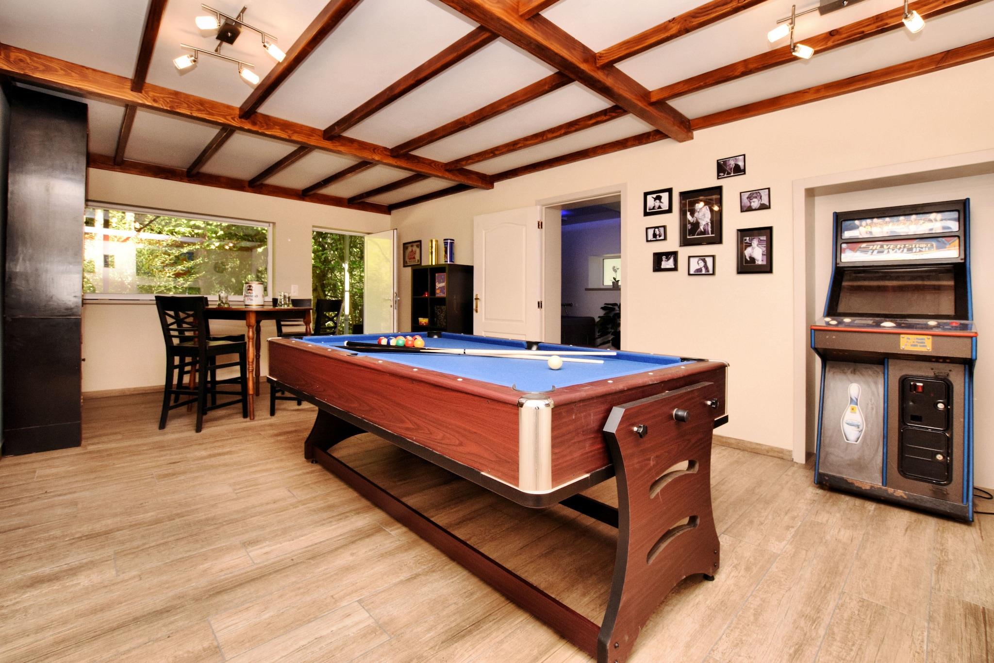 Denne hyggelige villa i Masbourg, Belgien tilbyder et afslappende ophold i hjertet af Ardennerne, ideel til familier eller grupper. Beliggende kun 500 meter fra landsbyens centrum og omgivet af skov- og flodlandskaber, er det perfekt til vandreture i naturen og cykling. Nærliggende attraktioner omfatter Grottes de Han, Château de Lavaux-Sainte-Anne og Euro Space Center, der hver tilbyder en blanding af eventyr, historie og videnskab. Wallonia Rural Life Museum og Fourneau Saint-Michel er også værd at besøge for kulturel indsigt. Hjemmet har fire soveværelser på to etager, herunder en køjeseng og børneseng til yngre gæster. Det åbne køkken er fuldt udstyret med moderne apparater, og opholds-/spisestuen har brændeovn, fladskærms-tv med internationale kanaler og dvd-afspiller. Kælderen rummer et opholdsrum med airhockey, billard og en spillekonsol samt et wellness-område med boblebad og sauna. Udendørs kan du nyde en terrasse, have, grill og spil som bordtennis og boules. Spisemuligheder i nærheden omfatter Le Jardin des Senteurs i Nassogne for moderne køkken, Restaurant Les 7 Fontaines D'Awenne for regionale smagsoplevelser og Brasserie Saint-Monon for lokale håndværksøl.