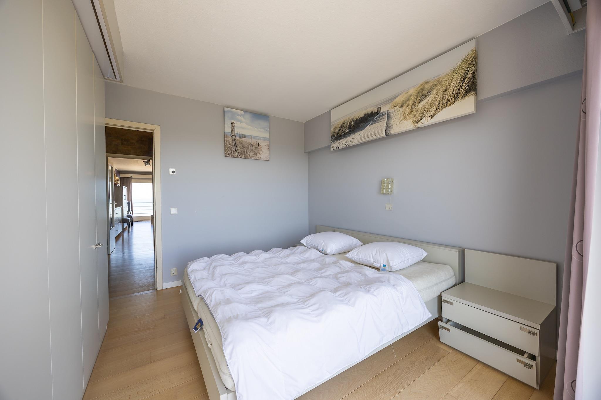 Spacious apartment on the 5th floor with breathtaking sea view and sunny terrace – the ideal place for a relaxing holiday by the coast. The apartment features 2 bedrooms: one with a double bed and one with 2 bunk beds. Both bedrooms open onto a sunny terrace, perfect for enjoying the fresh sea air. The very spacious living room with a sofa bed features floor-to-ceiling windows across the entire width, offering a spectacular sea view and plenty of natural light. There is also a fully equipped kitchen, an entrance hall with separate toilet, and a bathroom with bathtub and sink. Located directly on the seafront promenade and within walking distance of a tram stop, this apartment is the perfect base for a wonderful seaside holiday. Relax on the front terrace with sea view or unwind at the back with views of the dunes. As an added bonus, the building has a swimming pool, ideal for a refreshing dip on sunny days. An excellent choice for those looking for comfort, space, sea view, and a prime location on the Belgian coast. Wifi: yes - parking: included - sheets: bring your own - towels: bring your own.