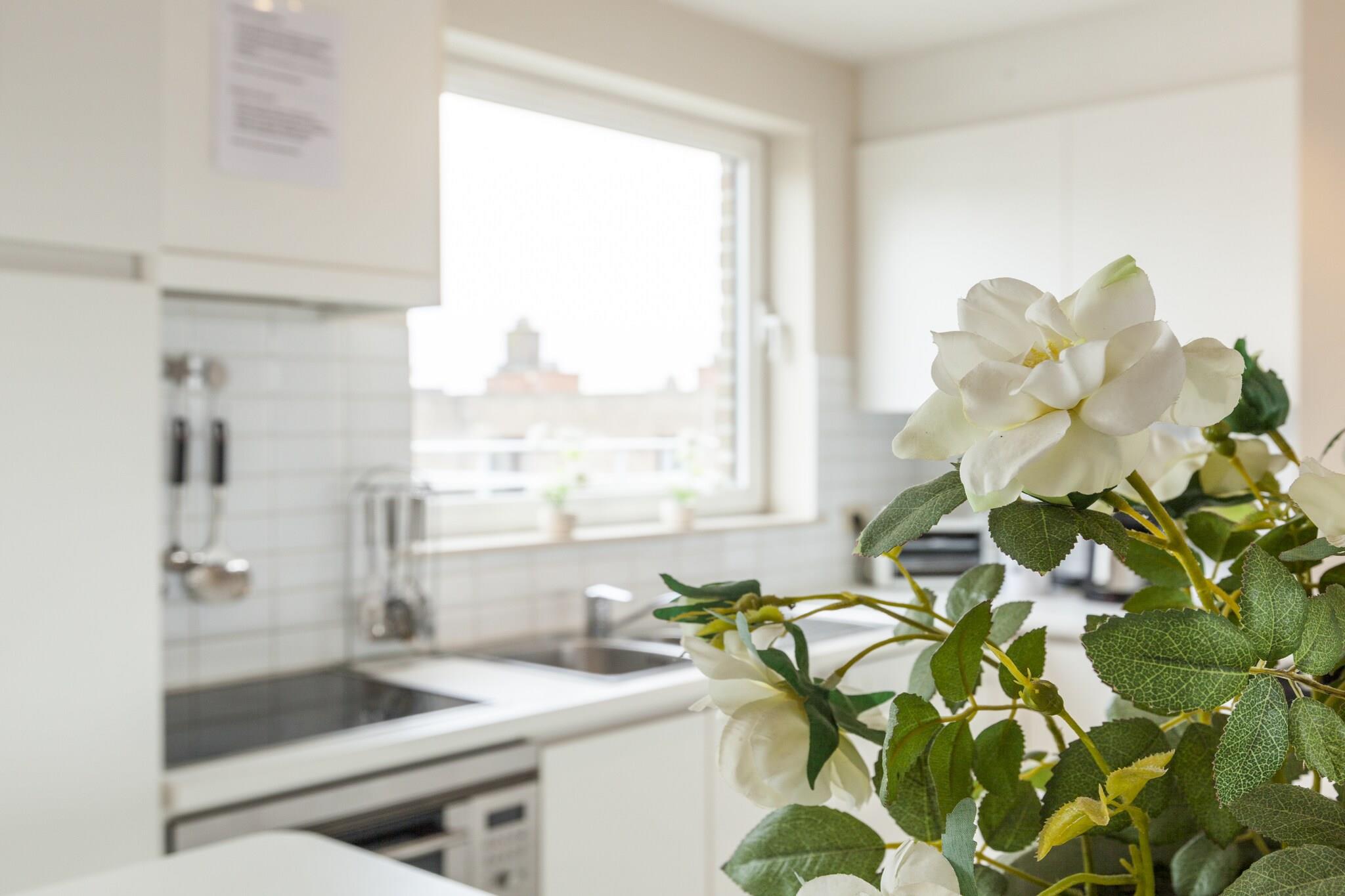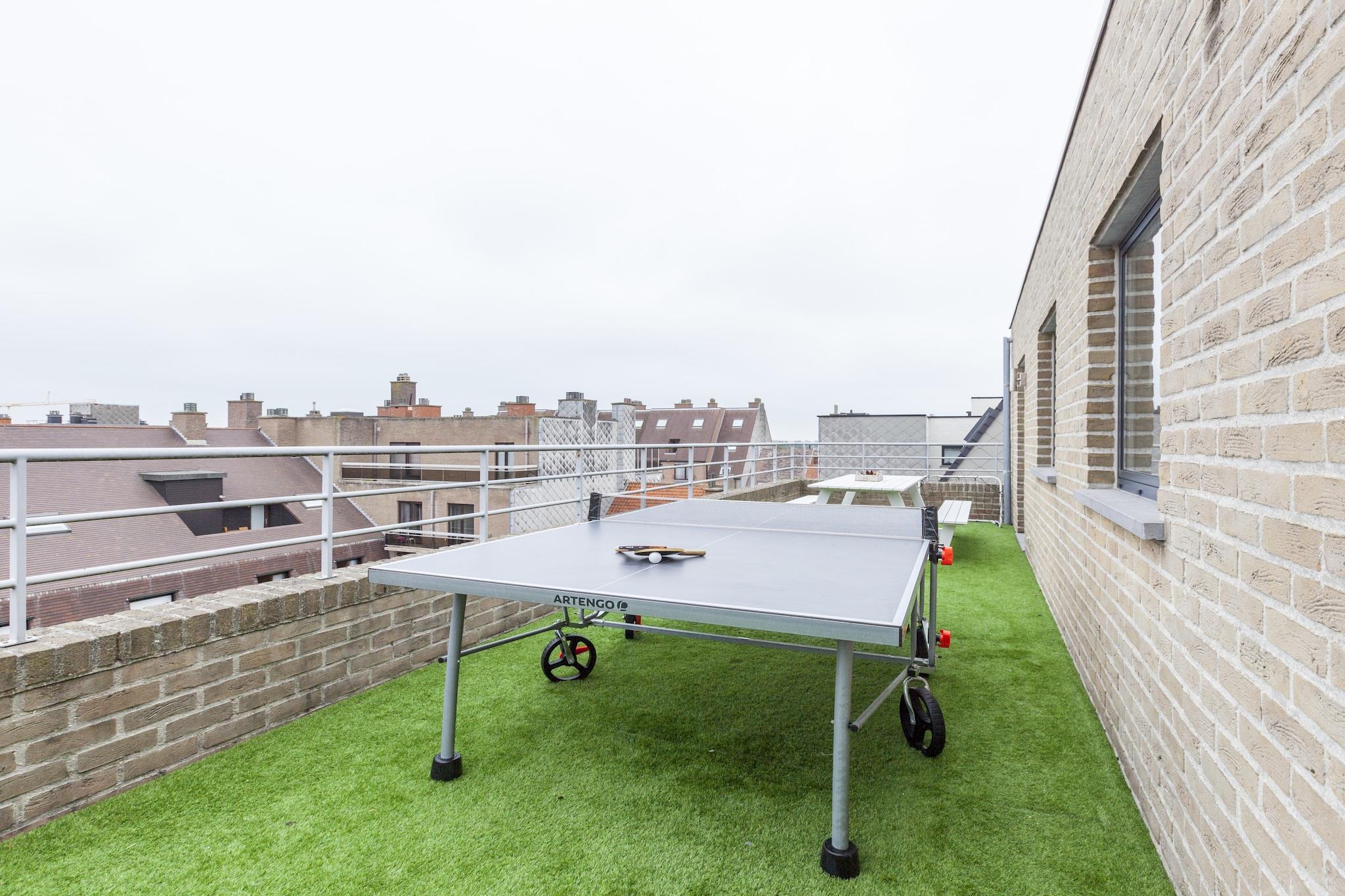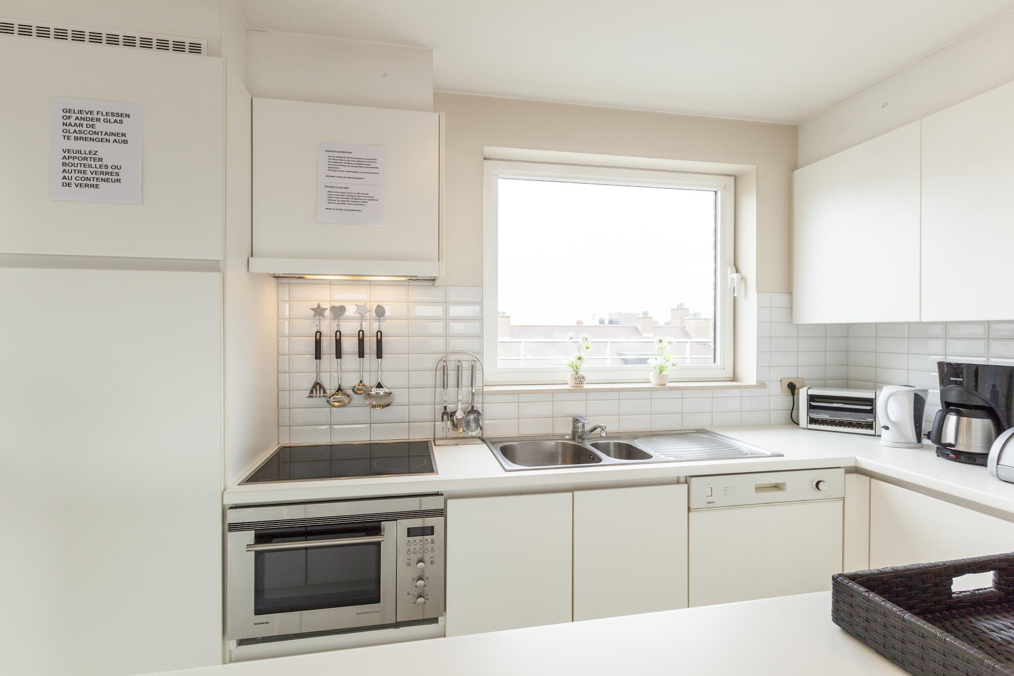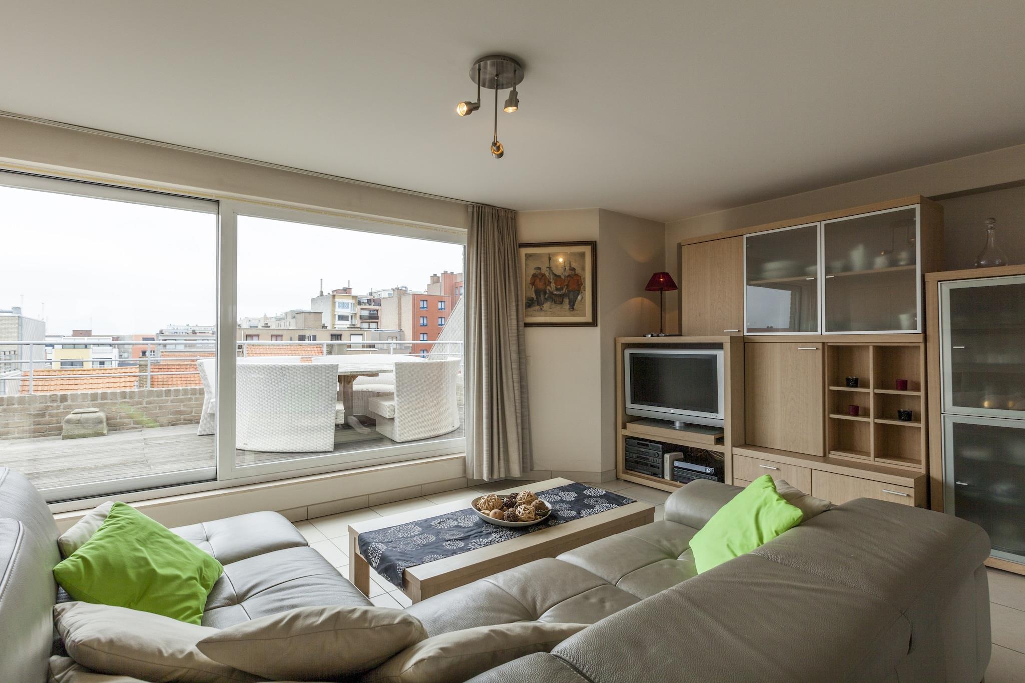Denne smukke penthouse ligger kun 100 m gang fra Middelkerke strand. Fra de komfortable loungesæder på de 2 rummelige terrasser kan du fuldt ud nyde både morgen- og aftensolen. Boligen er ideel til ferie med familien.Dette feriehus har supermarked, flere brasserier og gode restauranter i gåafstand. Parken ligger 100 m væk, og sporvognsstoppestedet ligger kun 50 m fra huset. I samme afstand ligger den rummelige og prisbillige Normand Parking. Elevatoren fører dig til lejlighedens hall. Gennem den ene dør når man stuen, og gennem den anden dør man til badeværelserne og soveværelserne. Det har et veludstyret køkken med opvaskemaskine, en elektrisk grill og der er vaskemaskine og tørretumbler, så du kan rejse let. Der er også en rejseseng til børn, bagerst i bygningen har du mulighed for at opbevare cykler sikkert.
