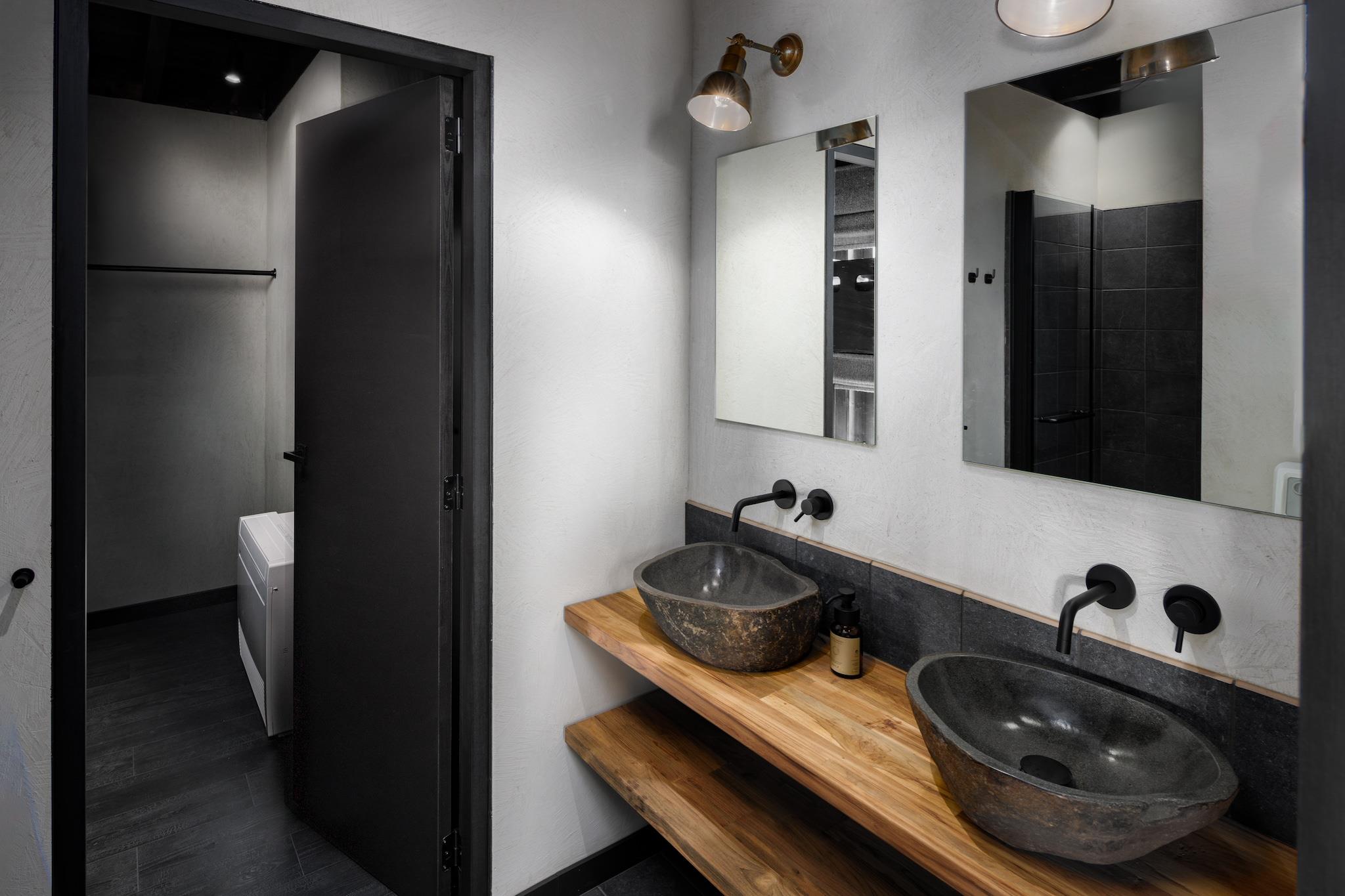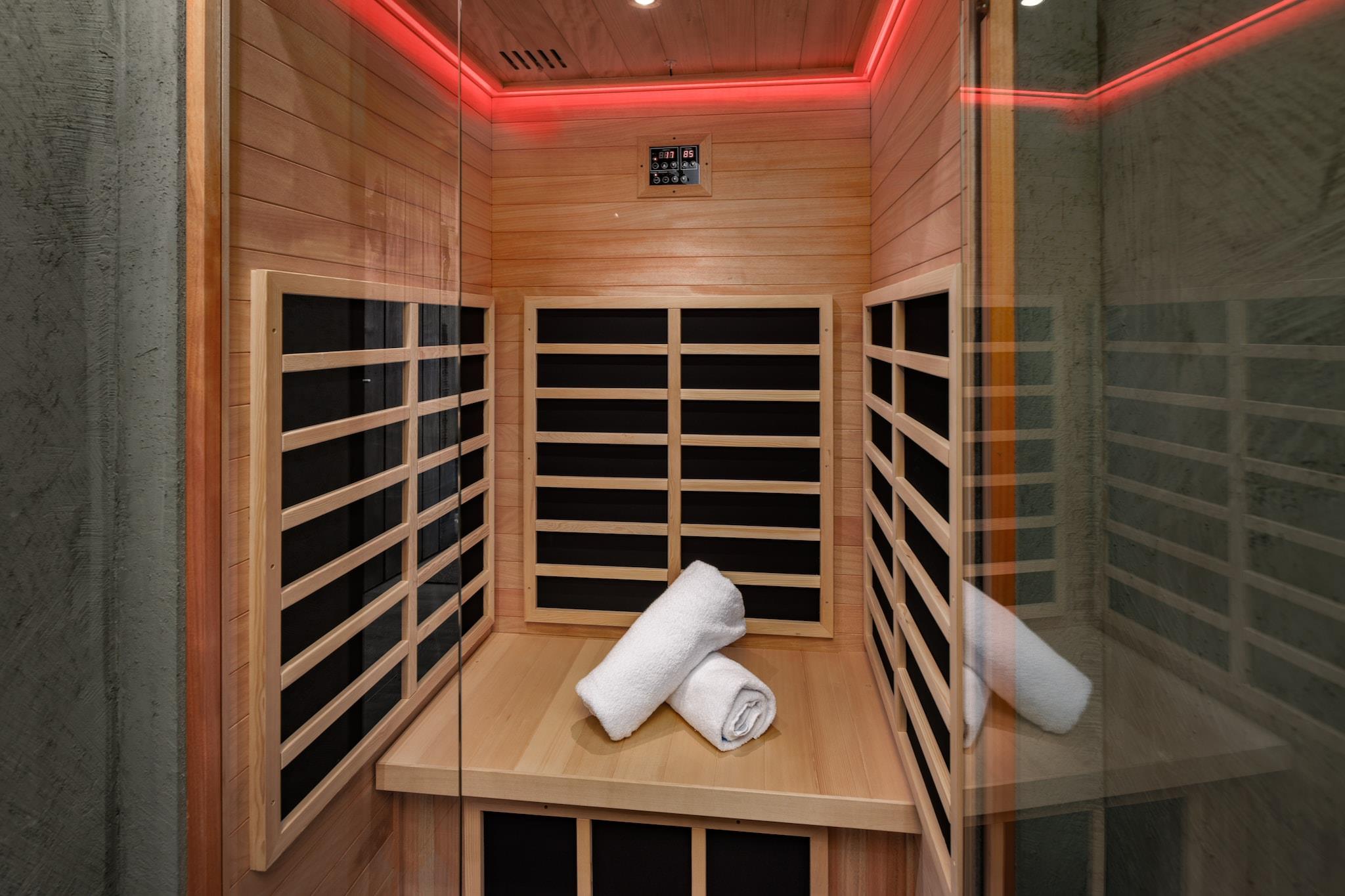 Stueetage: (entre(toilet), Stue(Fjernsyn(Smart-TV)), åbent køkken(elkedel, kaffemaskine(kopper), ovn, mikrobølgeovn, opvaskemaskine , køle-fryseskab), soveværelse(køjeseng), Soveværelse med badeværelse(dobbeltseng eller 2 enkeltsenge Senge, bruser(Walk-in-bruser), håndvask, toilet), Soveværelse med badeværelse(dobbeltseng eller 2 enkeltsenge Senge, bruser(Walk-in-bruser), infrarød sauna, håndvask)) havedøre, klimaanlæg, terrasse(overdækket), have, havemøbler, havepejs