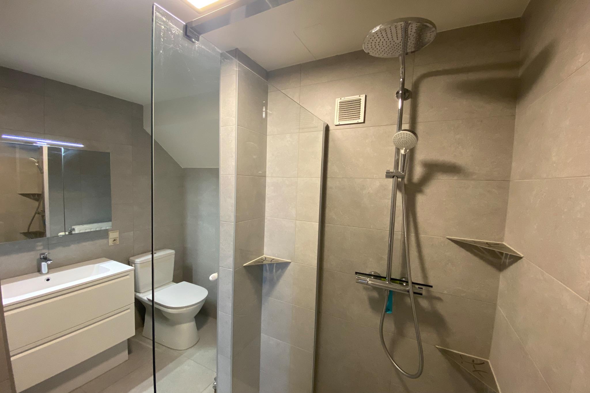 På 8. etage: (Køkken(kogeplade(elektrisk), kaffemaskine, mikrobølgeovn, opvaskemaskine , køle-fryseskab), stue / spisestue(dobbeltsovesofa, Fjernsyn, spisebord, sofahjørne), soveværelse(dobbeltseng(dobbelt dynebetræk, 160 x 200 cm)), soveværelse(dobbeltseng(dobbelt dynebetræk, 160 x 200 cm)), badeværelse(bruser, håndvask, toilet), toilet(toilet), pulterkammer) terrasse, cykelopbevaring, elevator