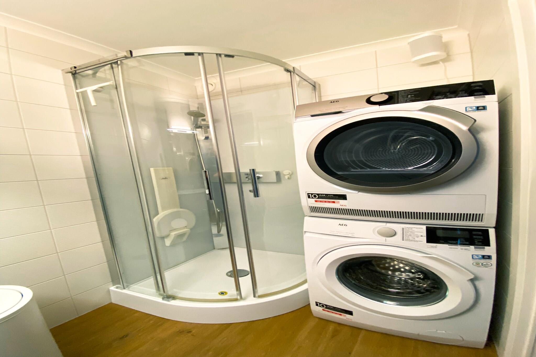 På 5. etage: (Køkken(kogeplade(elektrisk), emhætte, kaffemaskine(kopper, kaffepude), ovn, mikrobølgeovn, opvaskemaskine , køleskab), stue / spisestue(Fjernsyn(digital), spisebord, sofahjørne, balkon eller terrasse), soveværelse(dobbeltseng(dobbelt dynebetræk, 160 x 200 cm), balkon eller terrasse), soveværelse(køjeseng(dynebetræk)), badeværelse(tørretumbler, bruser, håndvask, vaskemaskine), toilet(toilet)) garage, fryser, elevator