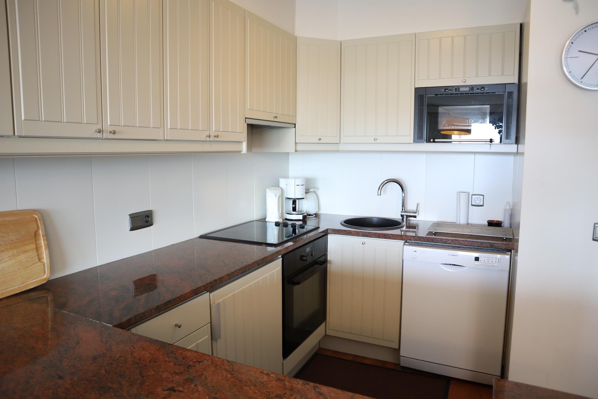 På 1. etage: (åbent køkken(komfur(elektrisk), kaffemaskine, ovn, mikrobølgeovn, opvaskemaskine , køle-fryseskab), stue / spisestue(Fjernsyn(digital), spisebord, sofahjørne), soveværelse(enkeltseng, enkeltseng), soveværelse(dobbeltsovesofa(160 x 200 cm)), soveniche(køjeseng), badeværelse(badekar med bruser, håndvask), badeværelse(bruser, håndvask, toilet), toilet(toilet)) vaskemaskine, terrasse