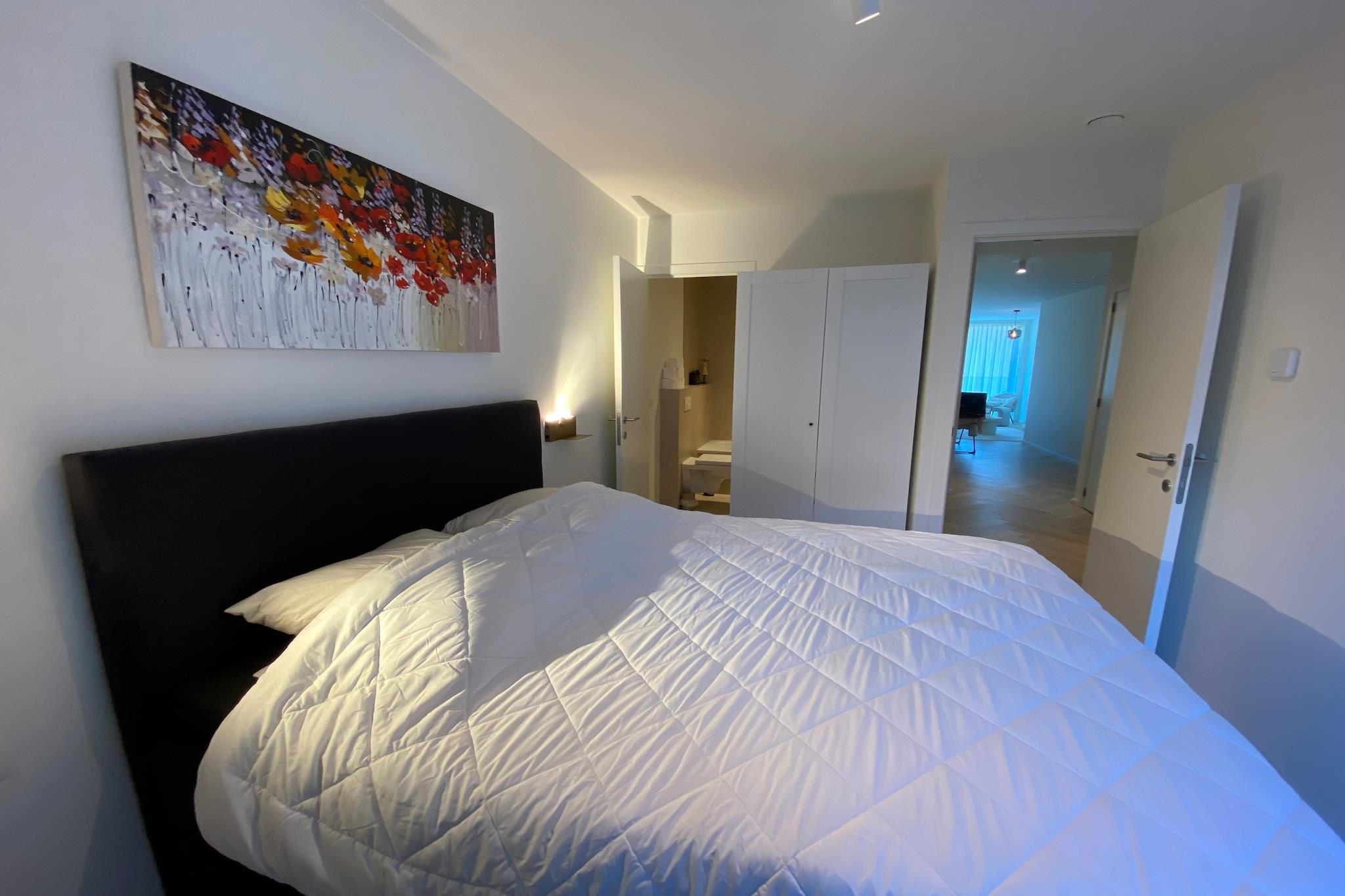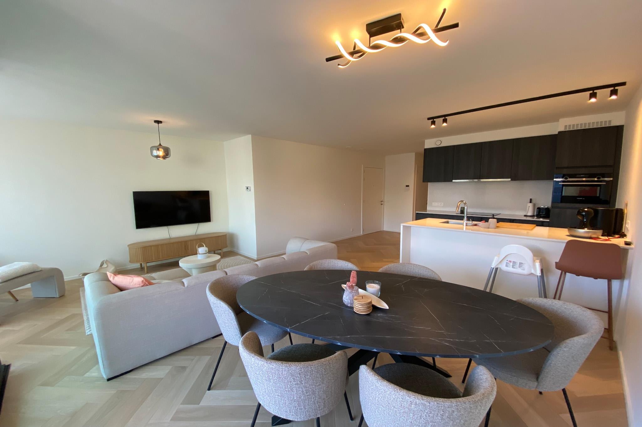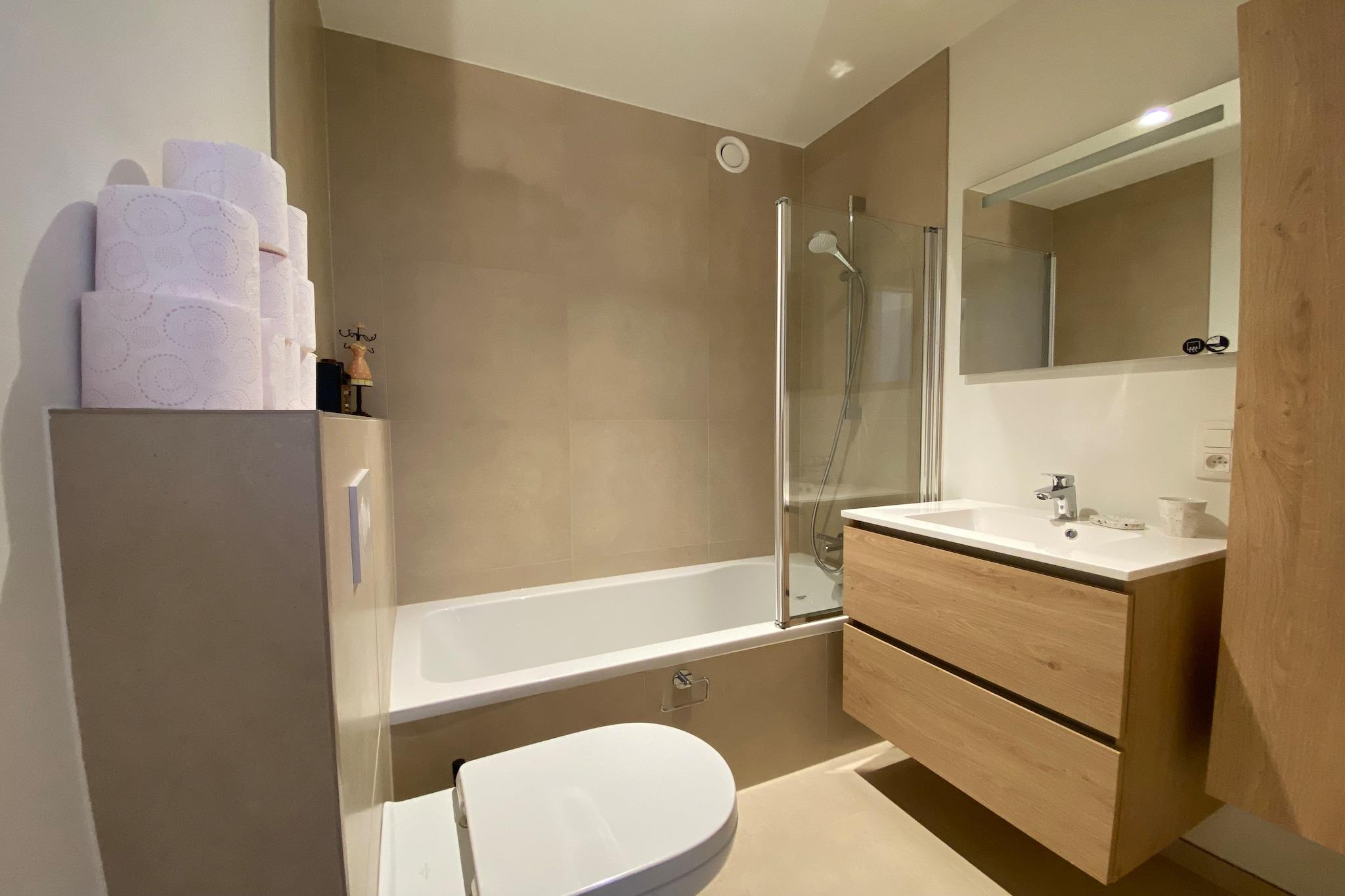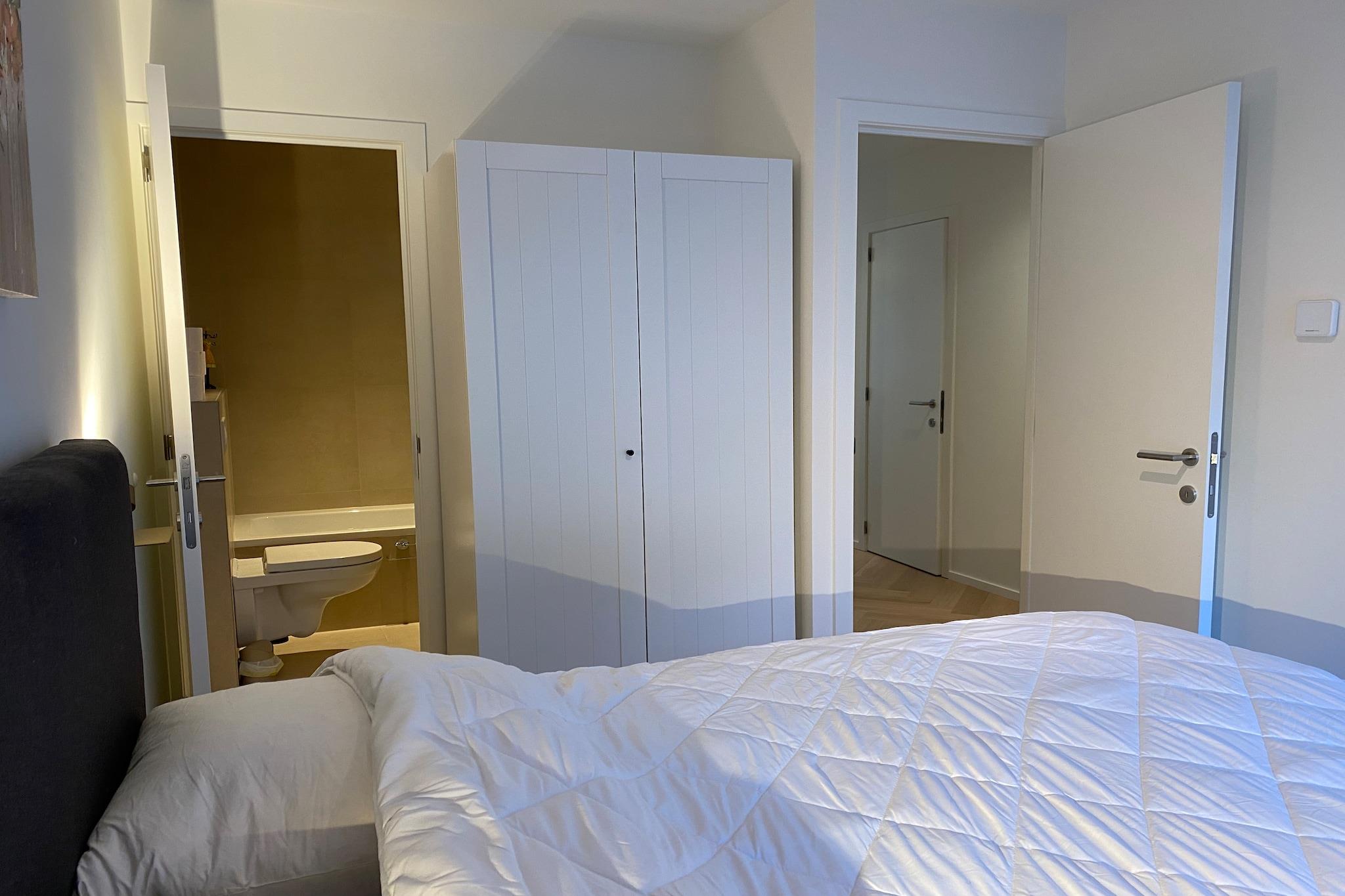 Oplev en moderne, nybygget lejlighed designet til at tilbyde komfort og stil til op til fire gæster. Med to hyggelige soveværelser med 1,60 m dobbeltsenge og varme parketgulve sikrer dette fristed på tredje sal et roligt, kæledyrsfrit miljø. Hold kontakten med højhastigheds-wifi og digitalt tv, og nyd bekvemmeligheden ved en vaskemaskine og underjordisk parkering. Det fuldt udstyrede åbne køkken med induktionskomfur, Nespresso-maskine, opvaskemaskine og kombineret mikroovn/ovn gør madlavningen til en leg. Slap af på den rummelige terrasse foran med havemøbler, eller nyd solen på den bageste solterrasse. Lejligheden har en perfekt beliggenhed, kun 5 km fra Ter Hille Koksijde Golf Course, 20 km fra forlystelsesparken Plopsaland og 5 km fra Nieuwpoort Marina. Udforsk charmerende lokale caféer, restauranter og butikker i nærheden, eller nyd den fantastiske udsigt over kysten. Med De Panne togstation 19 km væk og Oostende lufthavn kun 16 km væk er dette dit ideelle fristed for afslapning og eventyr.