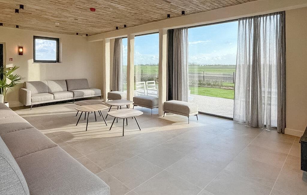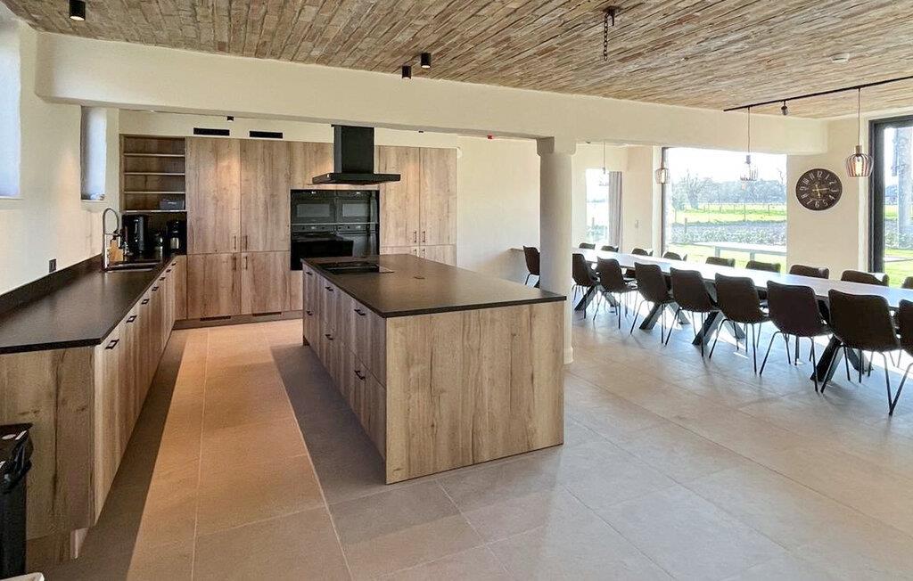 Træd ind i det store hus og nyd det åbne design. Slap af i de komfortable sofaer i den store opholdsstue og nyd det omkringliggende landskab gennem gulv-til-loft-vinduerne. Tilbered måltider i det moderne køkkens rummelige køkkenø og benyt jer af det lange spisebord, perfekt til fælles aftener med venner og familie. Slap af i opholdsstuen eller brug de ekstra rum til underholdning, måske med et spil bordfodbold.